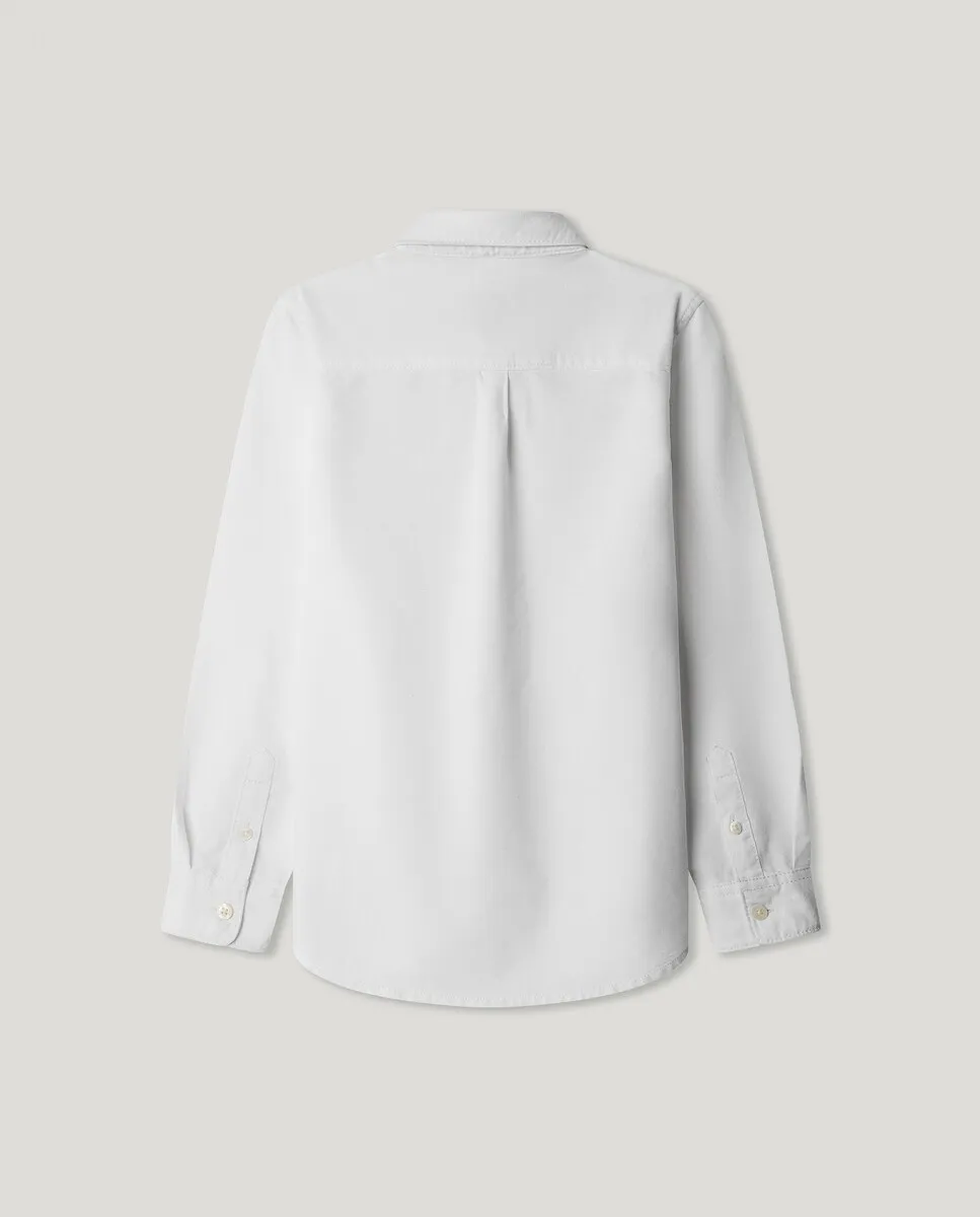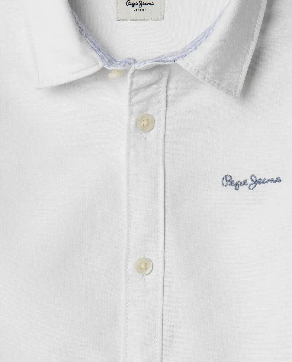 Рубашка из ткани оксфорд 100% хлопок с классическим воротником, длинными рукавами и однотонным цветом. Вышитый логотип PEPEJEANS с левой стороны на груди, отделка в полоску Бенгала внутри воротника, центральная складка на спине и округлые манжеты с двумя пуговицами.