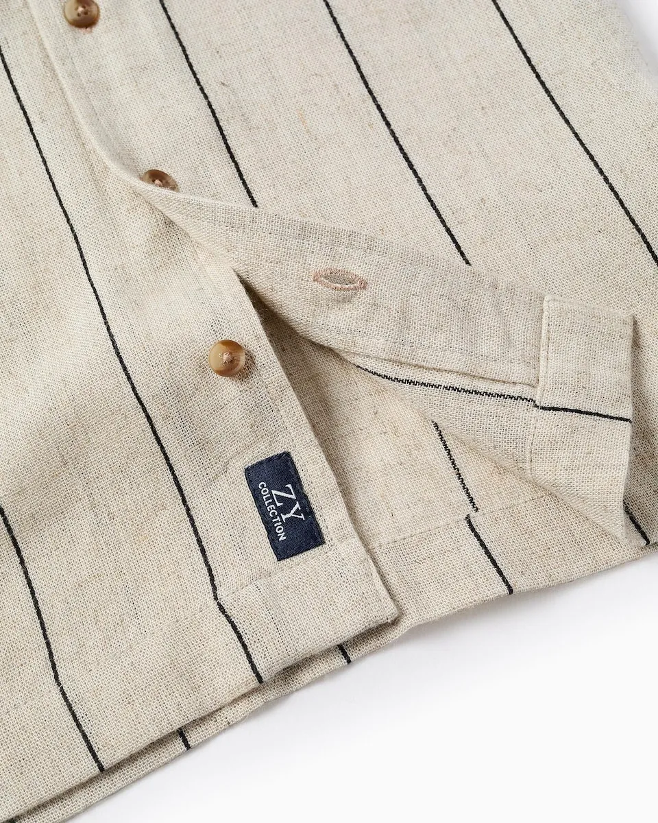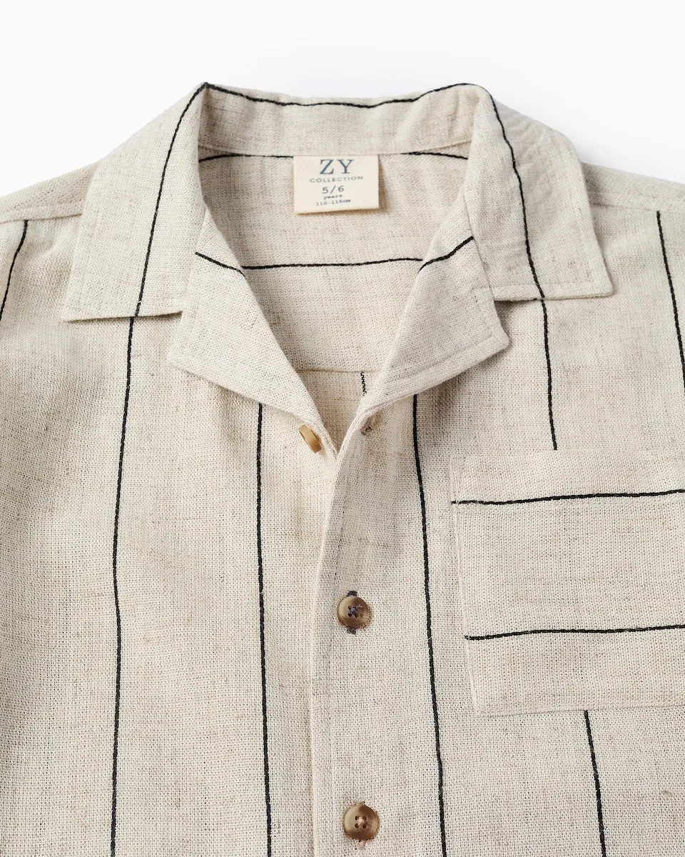 Рубашка с коротким рукавом для мальчика, из смеси вискозы и льна. Вырез в форме буквы V. Узоры из черных полос. Карман на груди. Оригинальный выбор! Big Me: пуговка с контрастной ниткой и петлей, чтобы ребенок легко определил, с чего начать застегивать, способствуя своей самостоятельности.