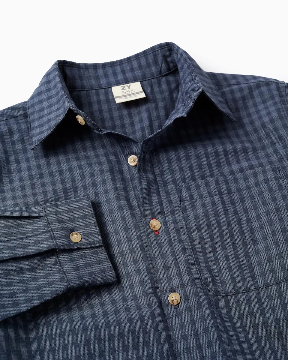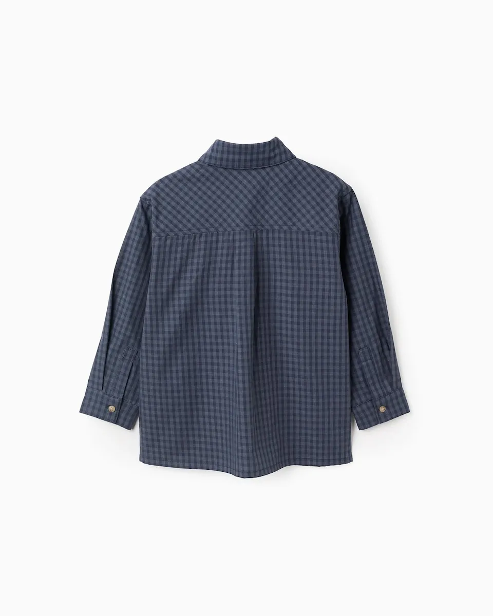 Темно-синяя рубашка в клетку для мальчика, из смеси хлопка. Карман на груди. Легкая ткань с оригинальным рисунком для уникальных образов! Big Me: пуговка с контрастной ниткой и петлей, чтобы ребенок мог легко определить, с какого места начинать застегиваться, способствуя его автономии.