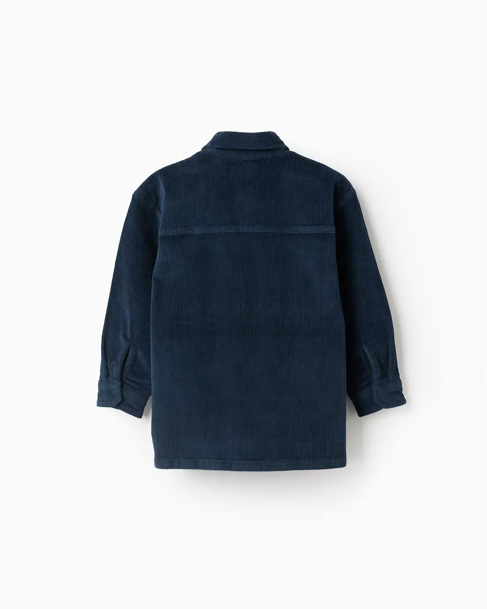 Темно-синяя вельветовая куртка для мальчика, выполненная из хлопка с добавлением эластана для большего комфорта и свободы движений. Падение плеч и карманы на груди. Закрывается на кнопки. Идеально подходит для ношения в комплекте с футболками.