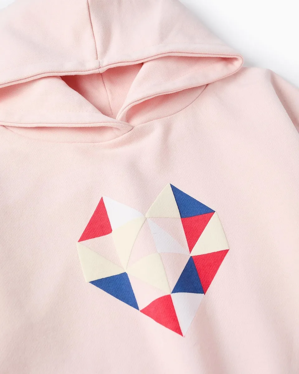 Розовая худи с капюшоном для девочки, 100% хлопок. Передний принт в виде сердца, сформированного из треугольников, с рельефными деталями. Рукава на манжетах и эластичный подол для идеальной посадки. Спущенные плечи. Для расслабленного и оригинального образа!