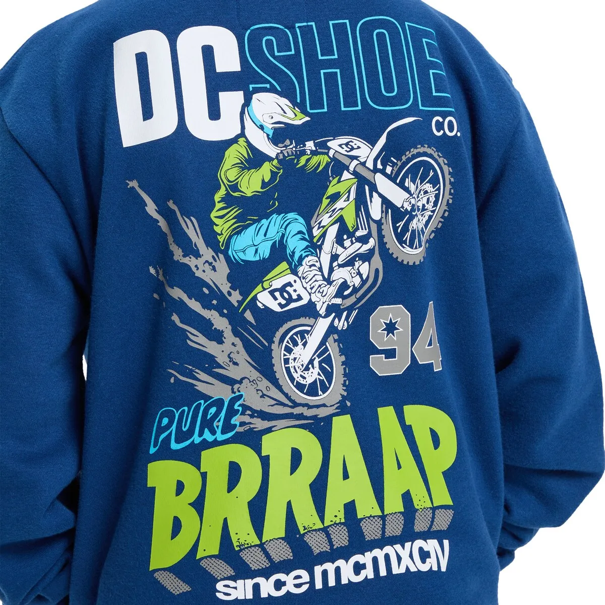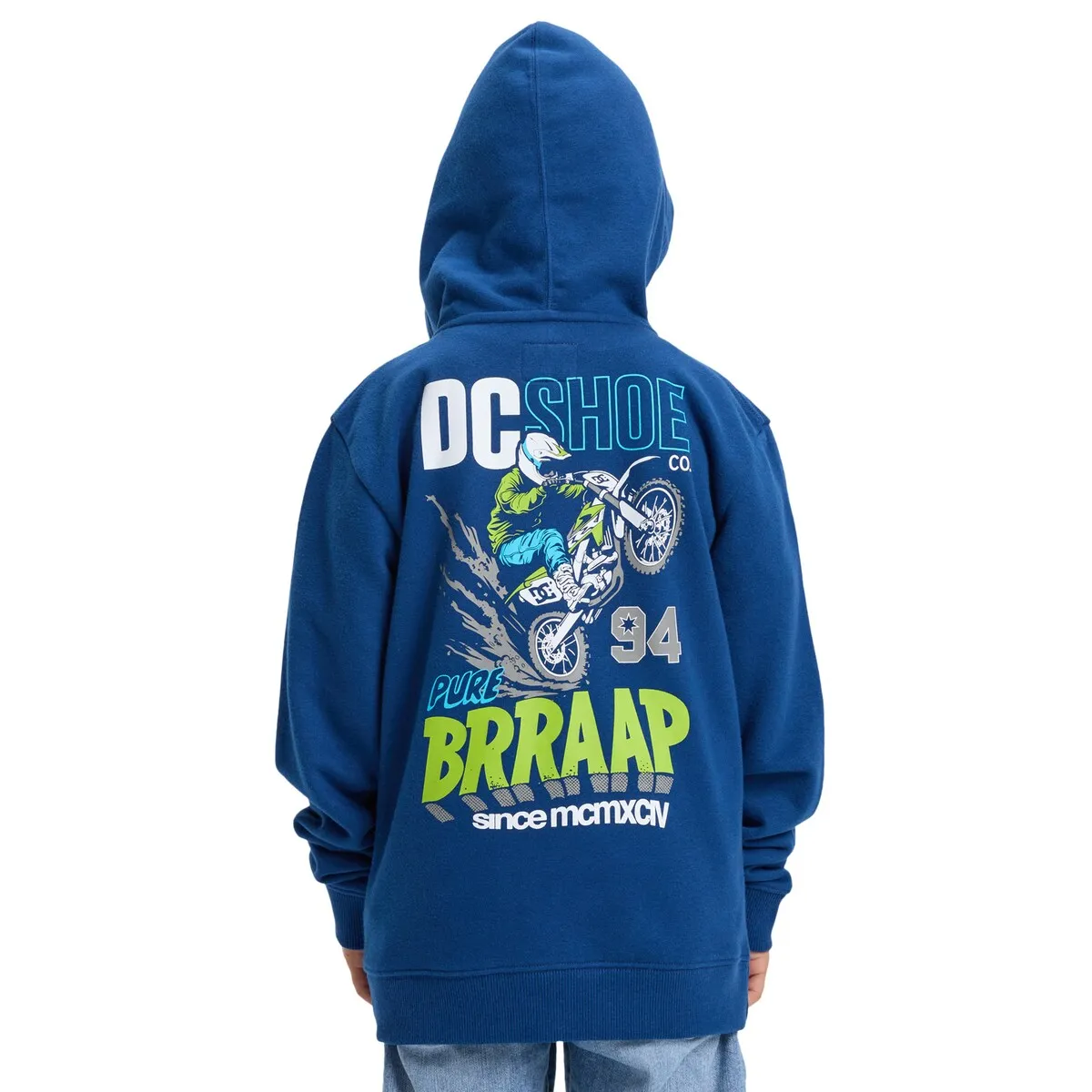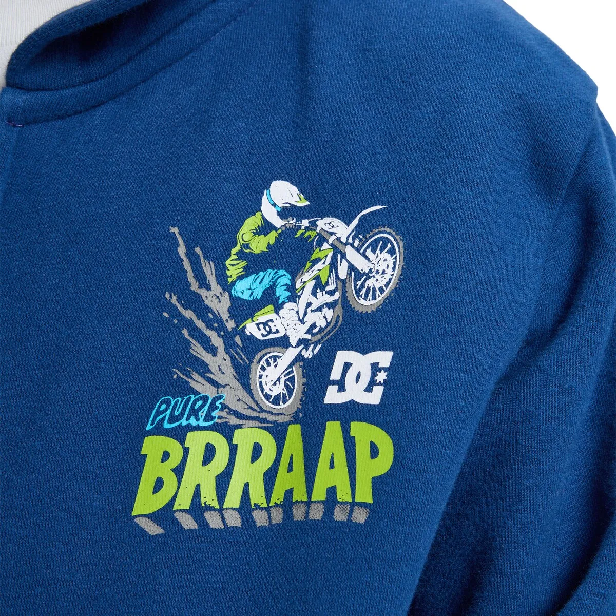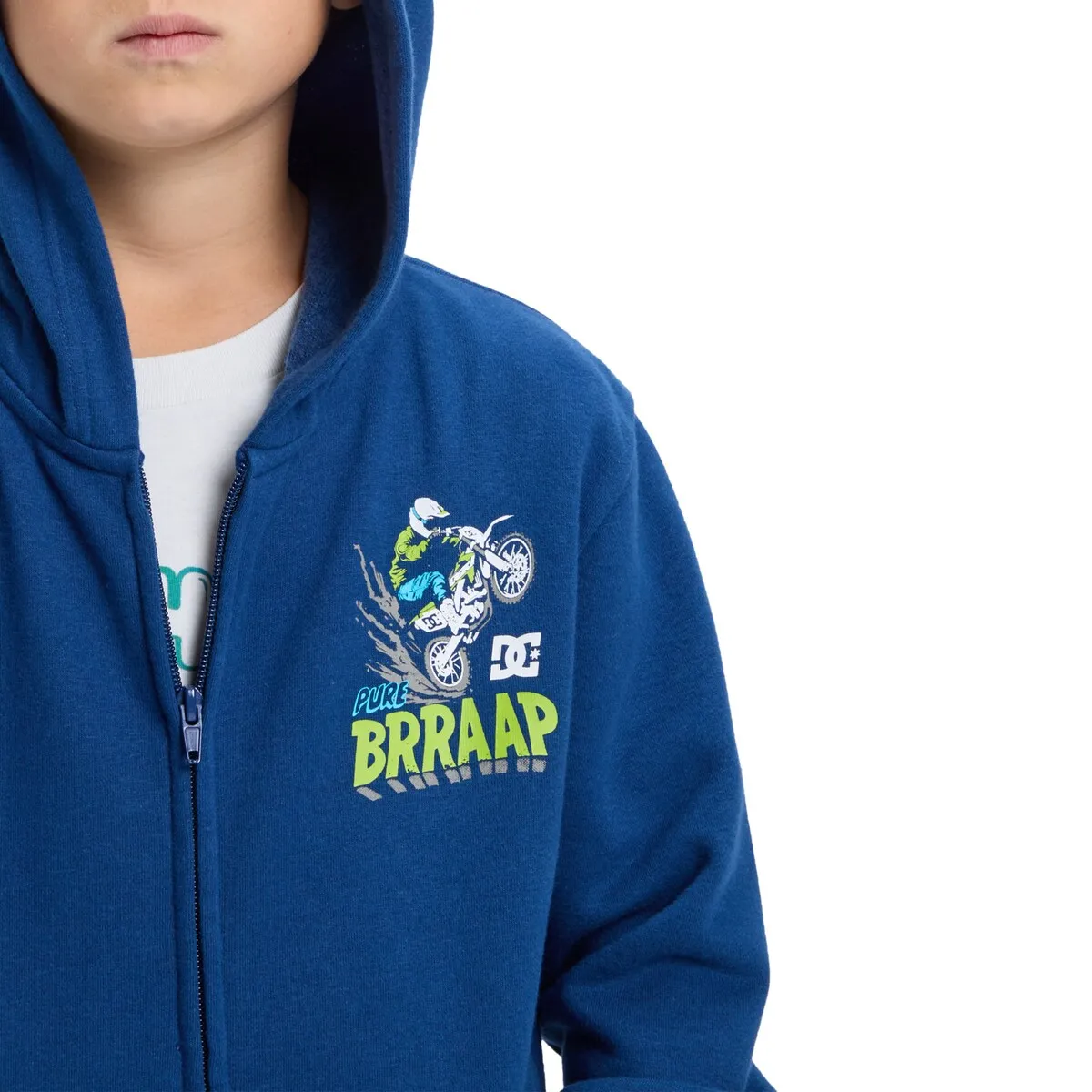 Толстовка с капюшоном и молнией для детей 8-16 лет. Характеристики включают: Ткань: французский терри с полумягкой задней стороной из хлопка средней плотности, переработанный хлопок и переработанный полиэстер [280 г/м²], стандартный крой, карманы кенгуру, печать из пластизоля на левой передней стороне и на спине, кантик на задней части воротника, нейлоновая спиральная молния с ротором спереди и детали DC RE и SOLVE.