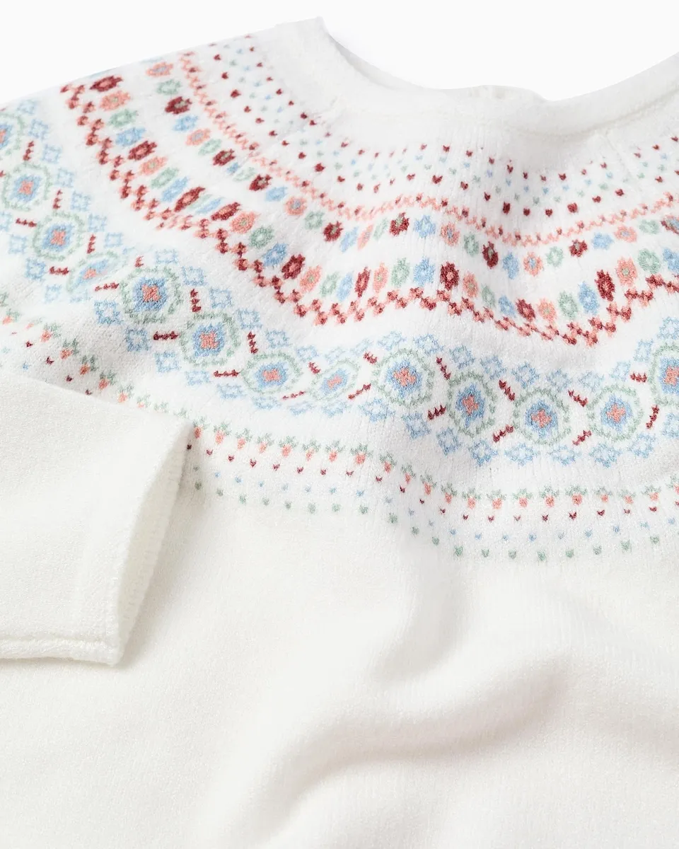 Вязаный джемпер для девочки с мульти-жаккардом на груди и вокруг плеч. Пуговка на спине. Расклешенный крой. Мягкий и уютный джемпер с традиционным оттенком.