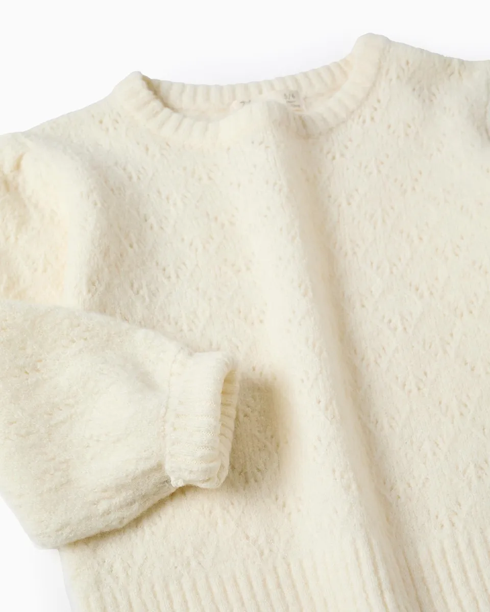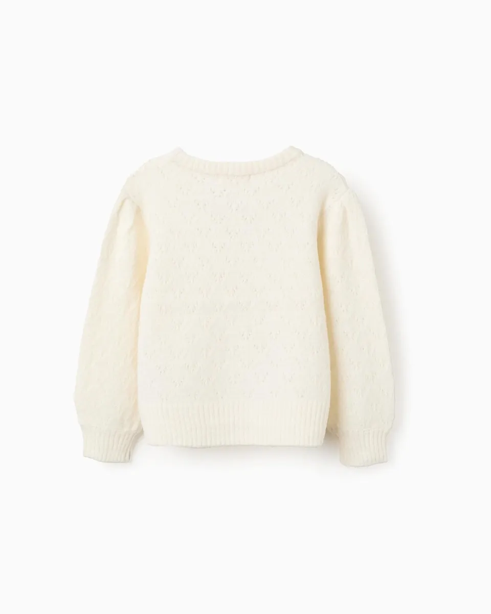 Вязаный свитер для девочки, мягкий и удобный. Опущенные плечи и слегка пышные рукава. Резинки на манжетах для идеальной посадки.