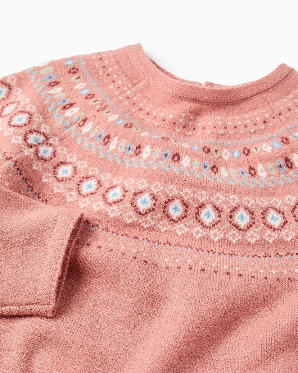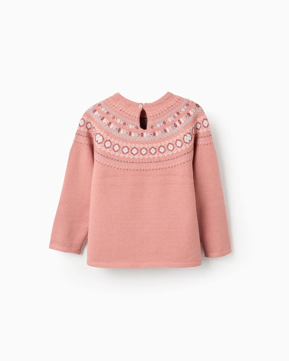 Вязаный джемпер для девочки с мульти-жаккардом на груди и вокруг плеч. Пуговка на спине. Расклешенный крой. Мягкий и уютный джемпер с традиционным оттенком.
