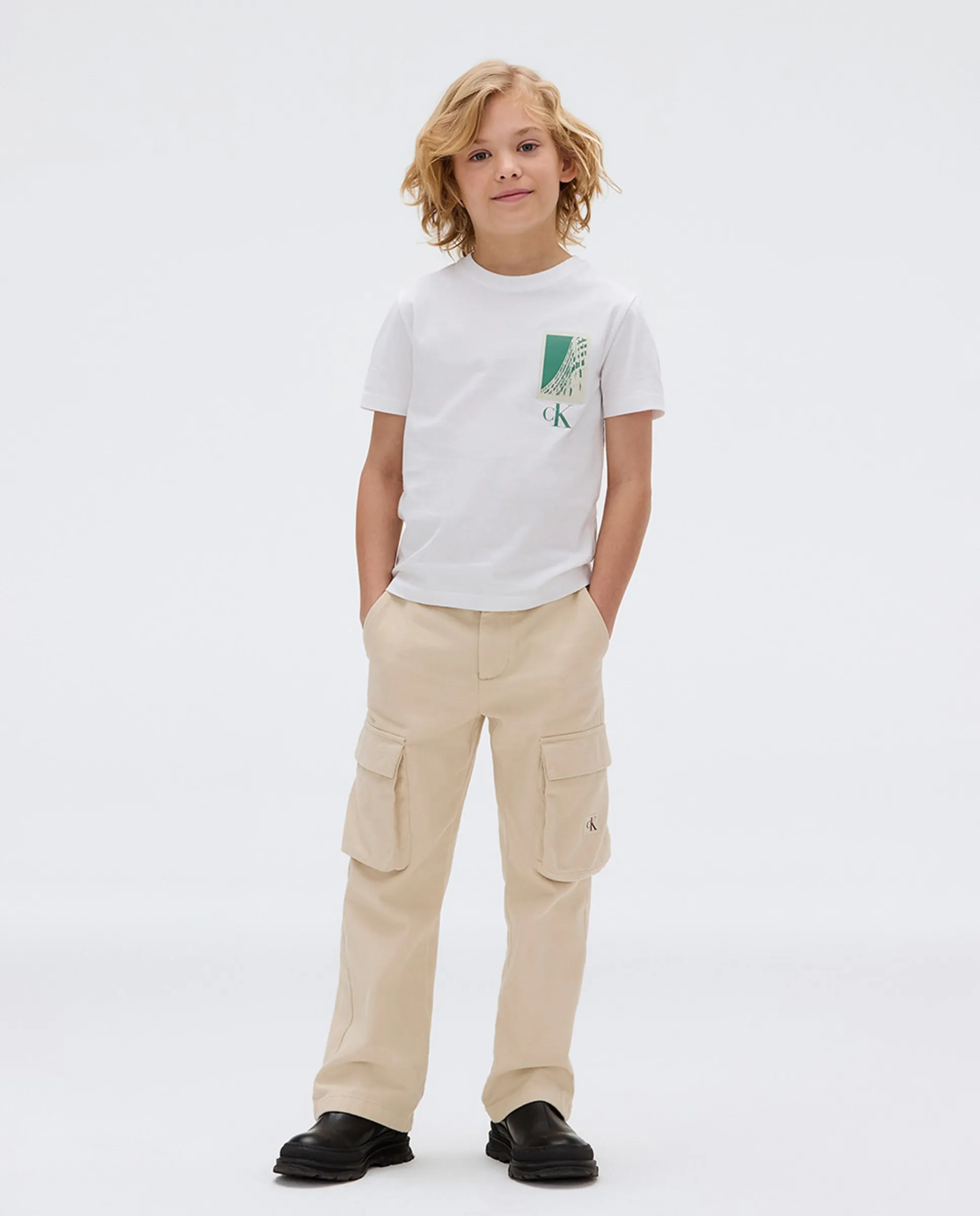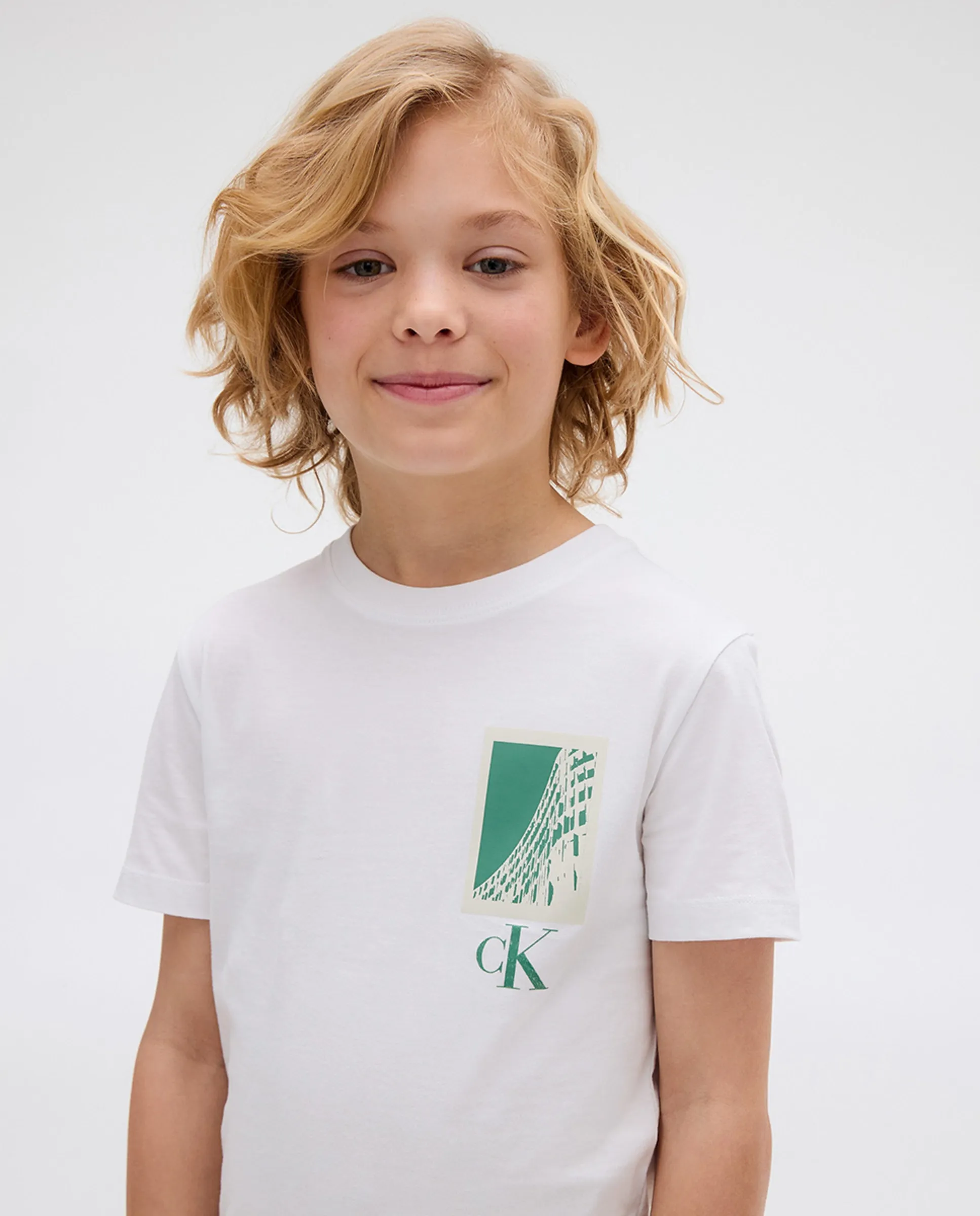 Детская футболка, изготовленная из 100% органического хлопка, с графическим изображением CK на груди.