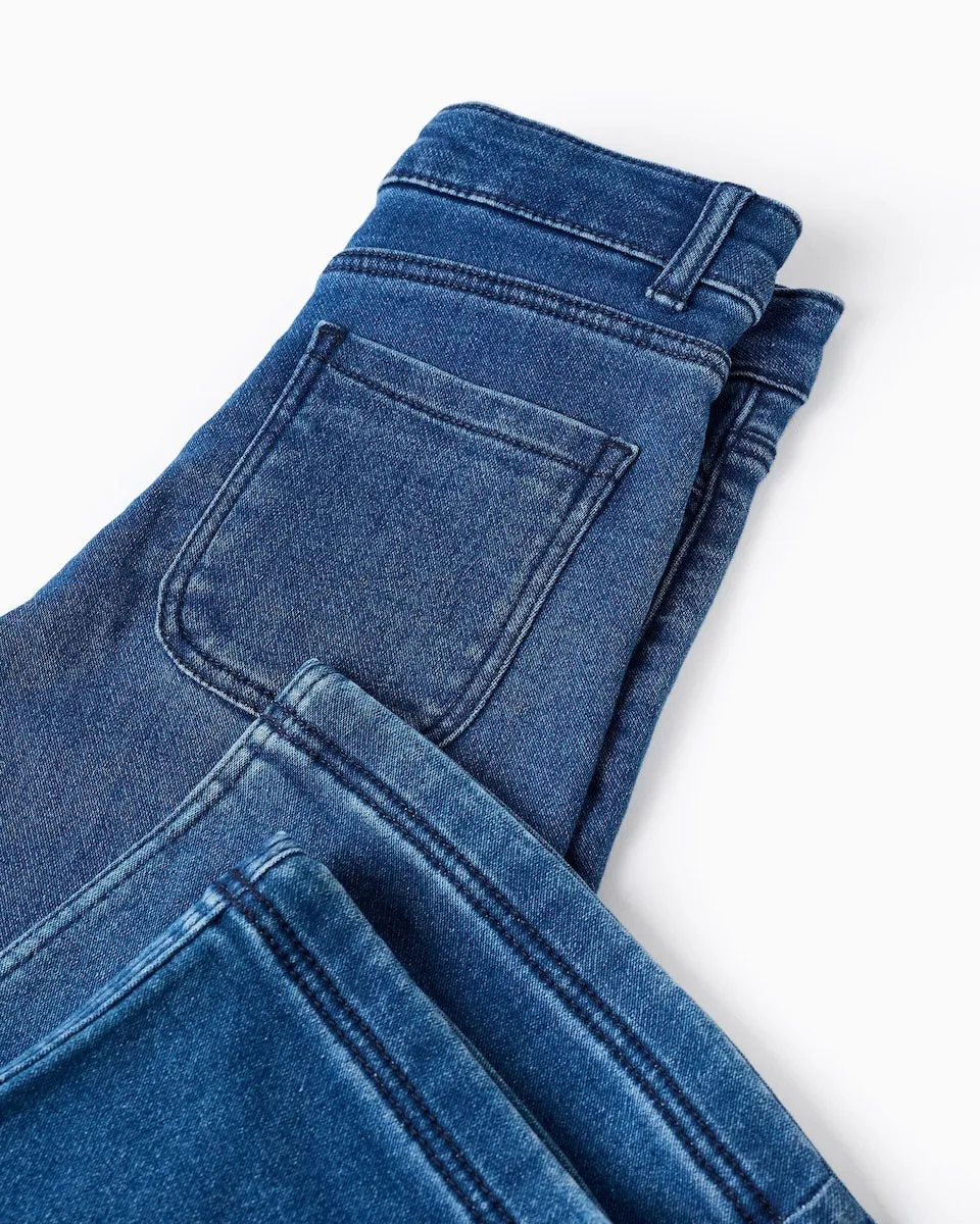 Синие джинсы для девочки, модель с широкими штанинами, свободные и расслабленные. Четыре кармана. Закрываются на три серебристые кнопки. Регулируемый внутренний пояс с резинками и кнопками. Современный и удобный выбор!