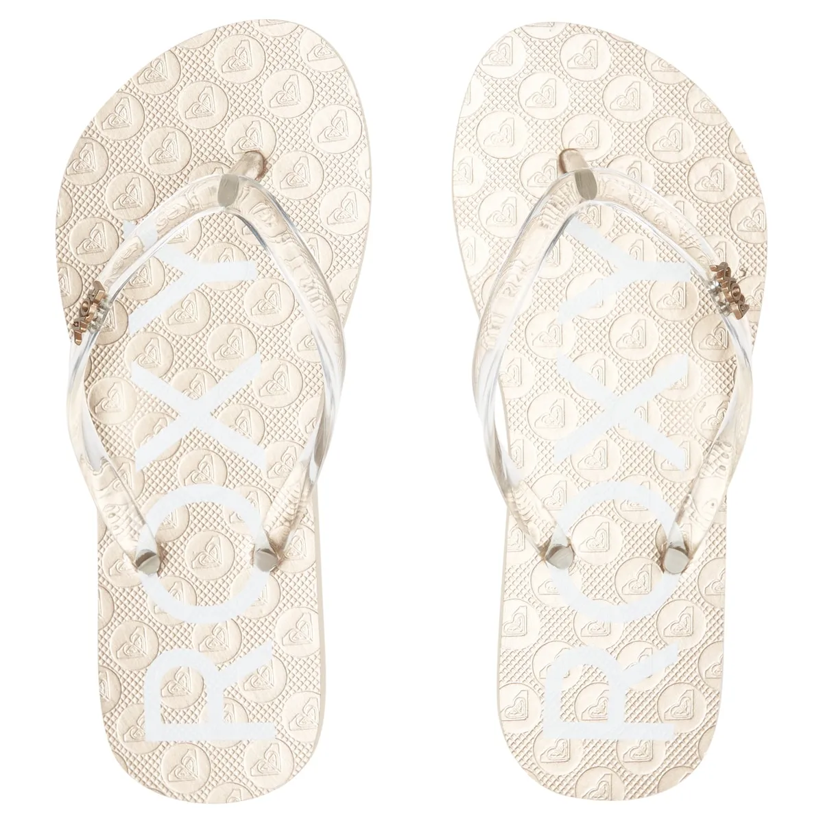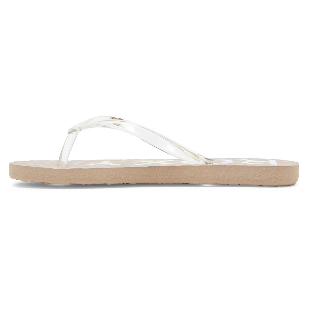 Тапочки для детей 8-16 лет. Характеристики включают: Изготовлено из материалов без ПВХ, Корпус: Корпус из прозрачной синтетической резины, Заколка с логотипом Roxy, Стелька: Резина с текстурой и логотипом Roxy на экологичном принте, Подошва: наружная подошва из резины.