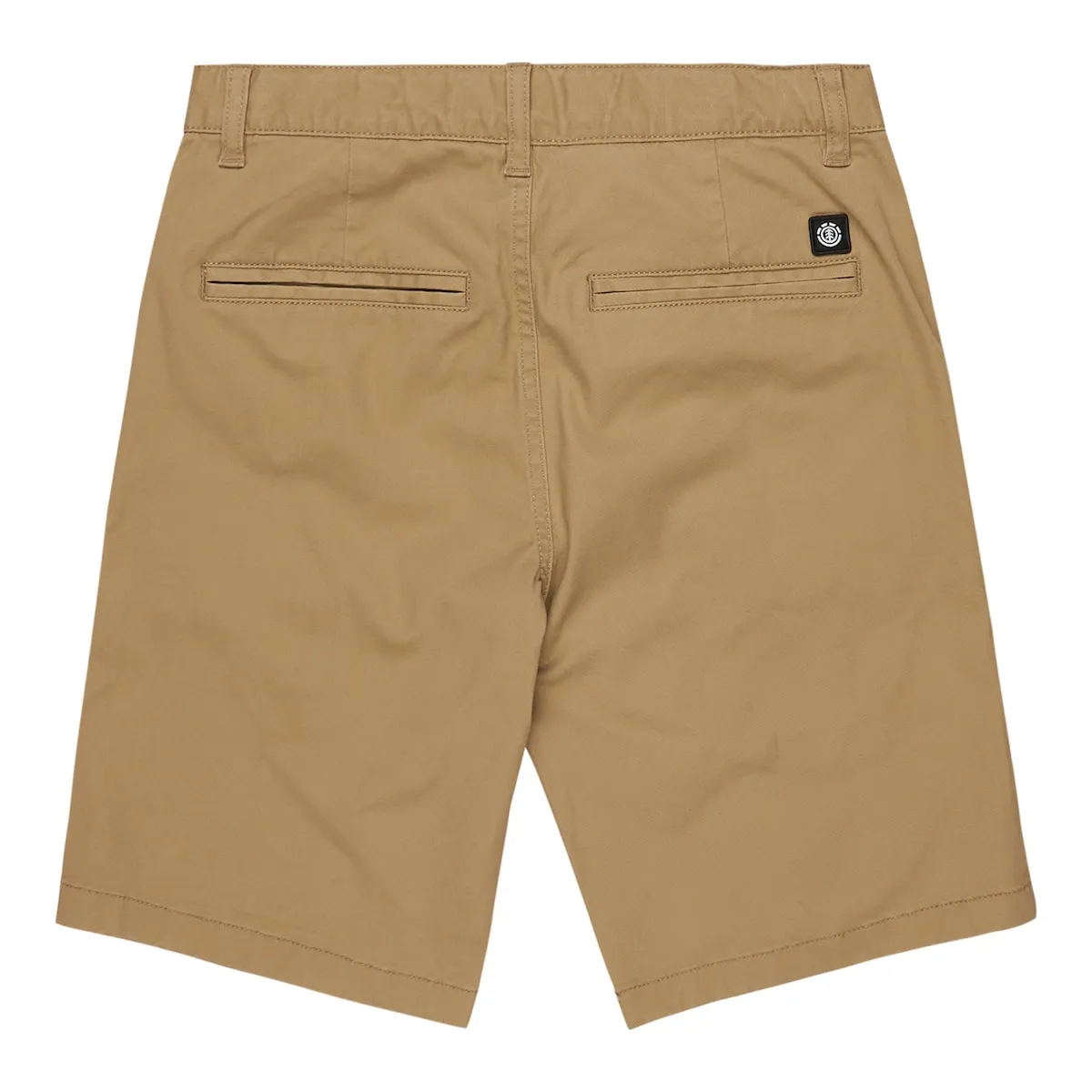 Шорты Чино для детей от 8 до 16 лет. Характеристики включают: Коллекция: коллекция Mainline, Ткань: саржа, смесь 50% переработанного хлопка, 48% обычного хлопка и 2% эластана [255 г/м²], покрой: обычный покрой, Застежка: застежка на молнии, Пояс: фиксированный пояс, Застежка: пластиковая кнопка на поясе, Ширина: обычная ширина, Покрой ноги: прямая нога, Длина: длина для детей 43 см, короткие, Открытие ноги: открытие ноги 21 см, Карманы: боковые карманы для монет, Карман для монет, Задние карманы с клапаном и Бренд: патч с логотипом на задней стороне.