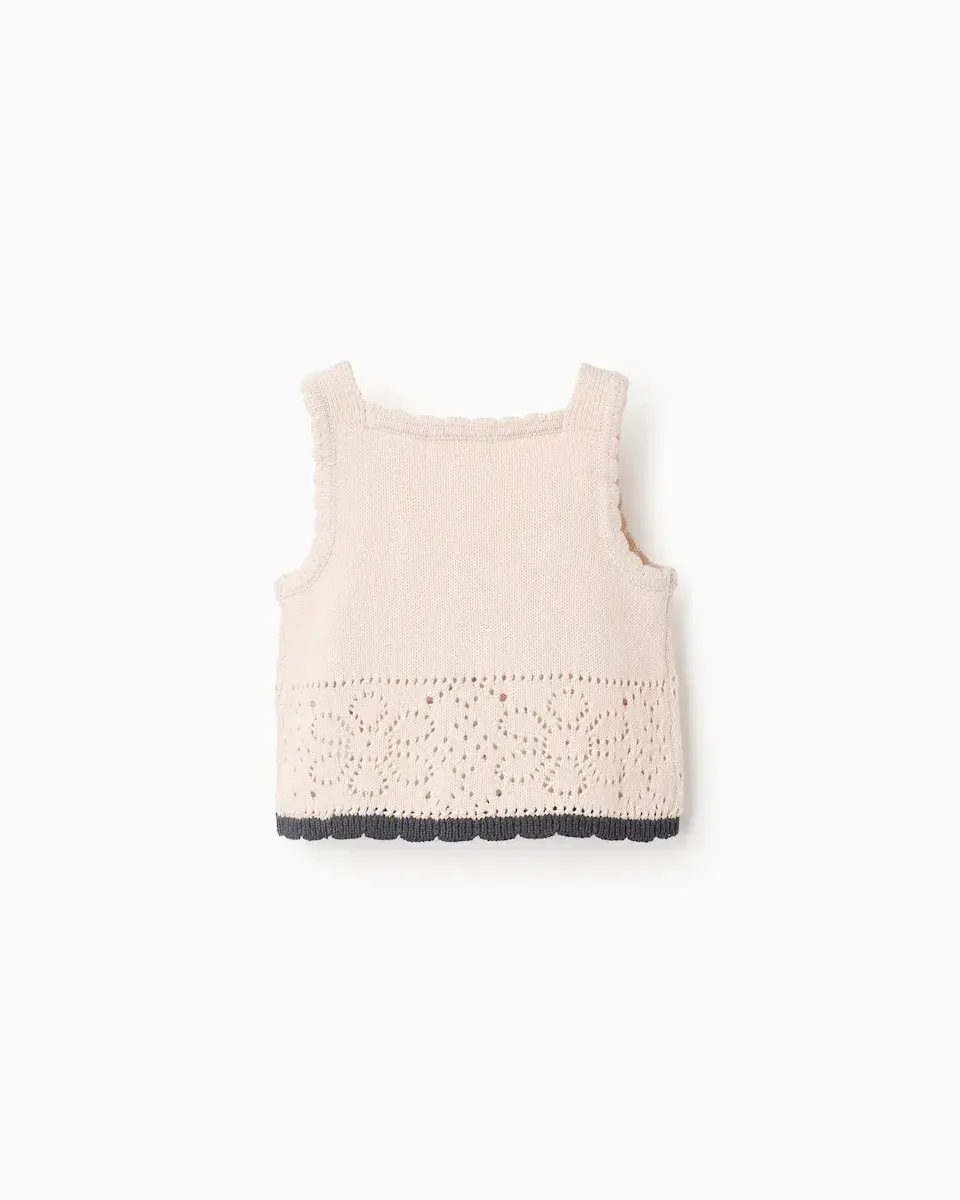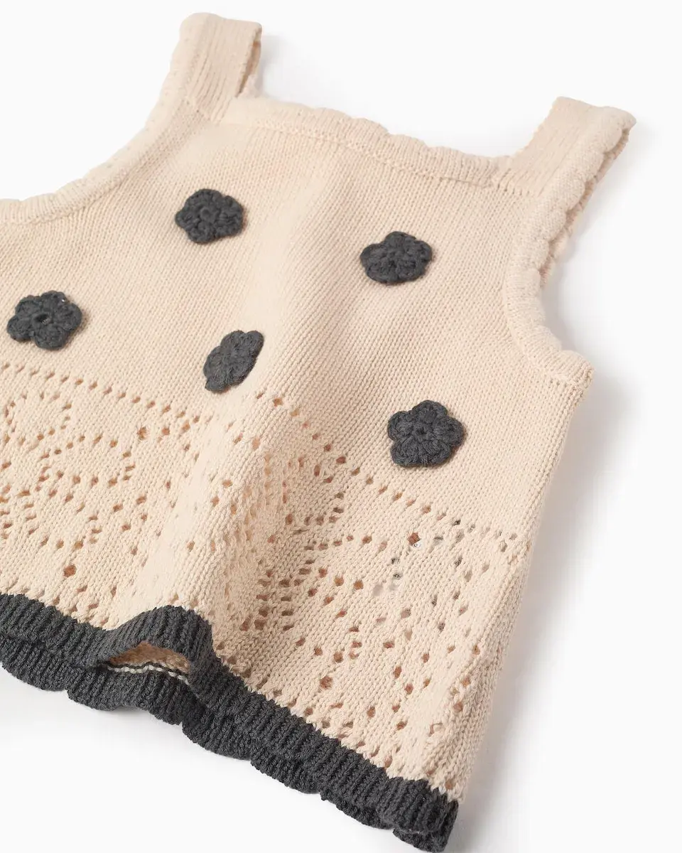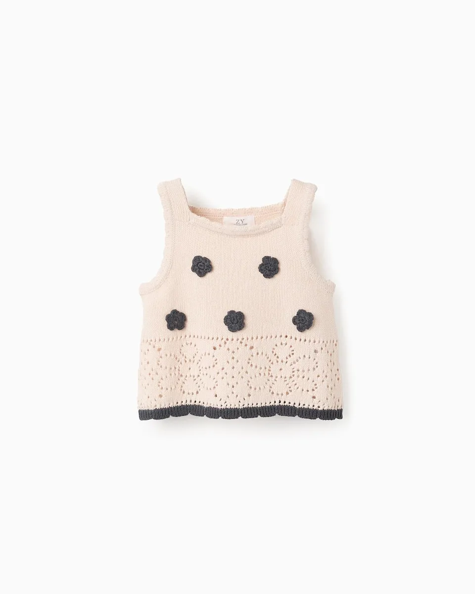 Бежевый топ для девочки, 100 % хлопок. С рельефными цветами из крючка серого цвета и канавочным узором. Волнистые края. Очаровательный и оригинальный топ!