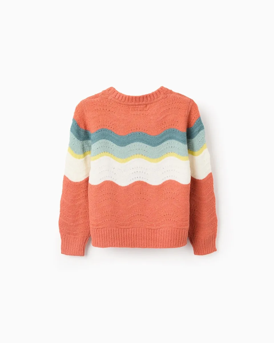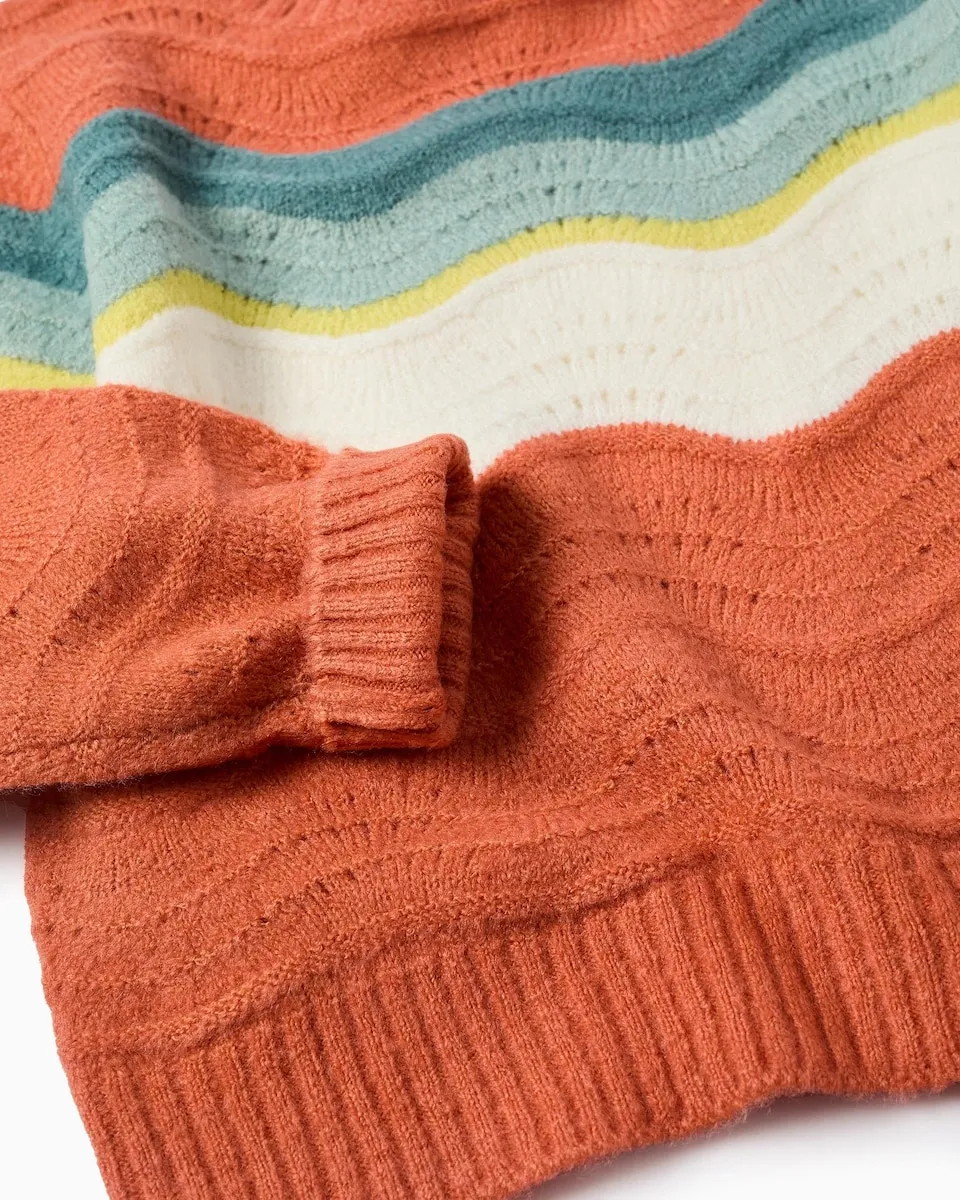 Оранжевый вязаный свитер для девочки с волнистым узором в оттенках зеленого, белого и желтого. Ребристые края для идеальной посадки. Мягкий и уютный вариант с оригинальным рисунком.