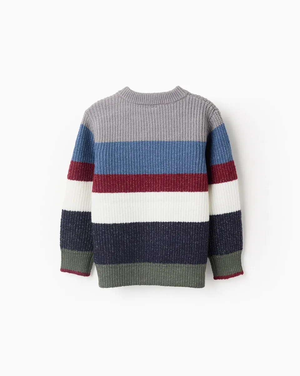 Детский свитер в полоску, в оттенках серого, белого, синего, красного и зеленого. Резинки на краях для идеальной посадки. Пуговицы на плече для удобного надевания. Удобный и универсальный свитер!