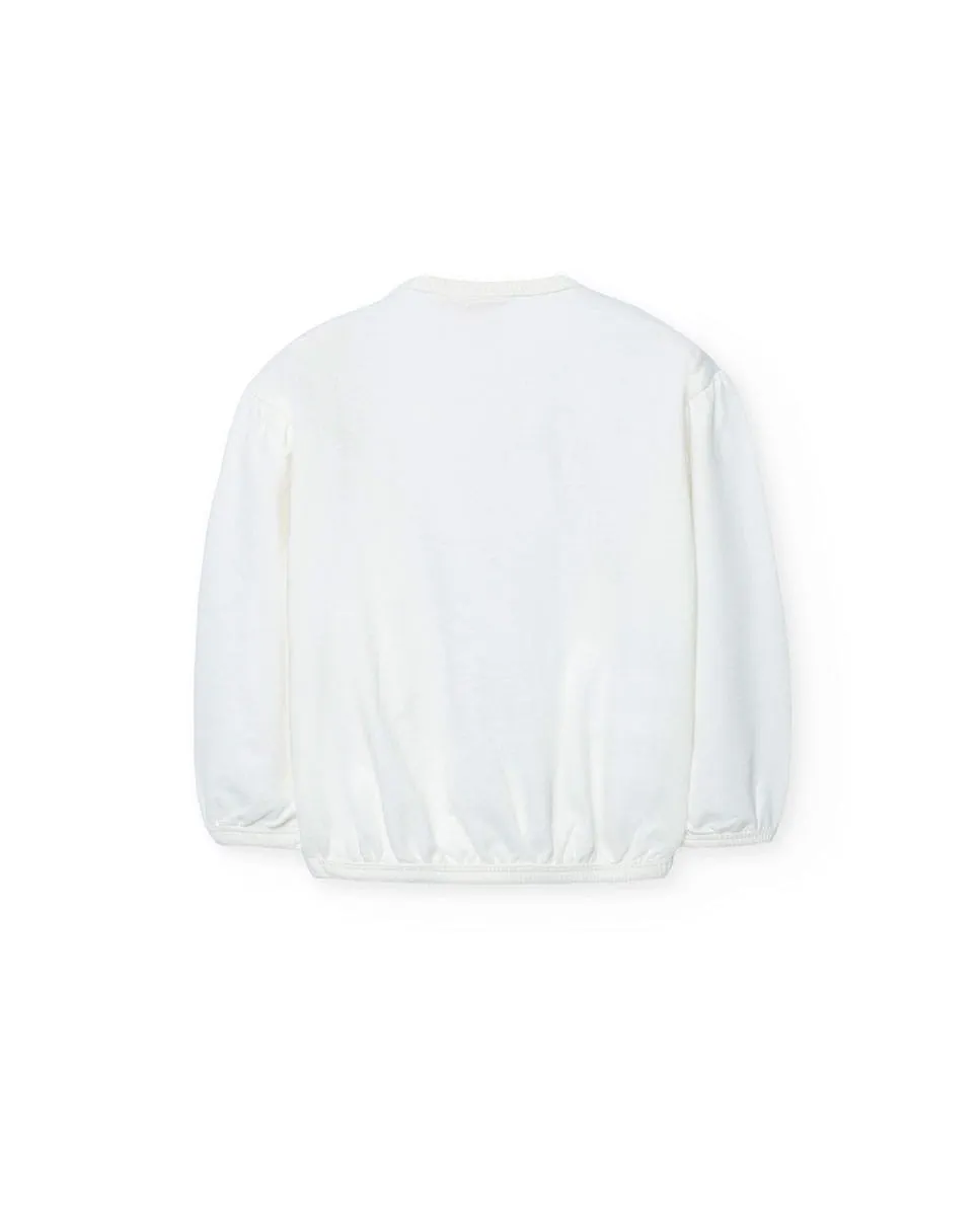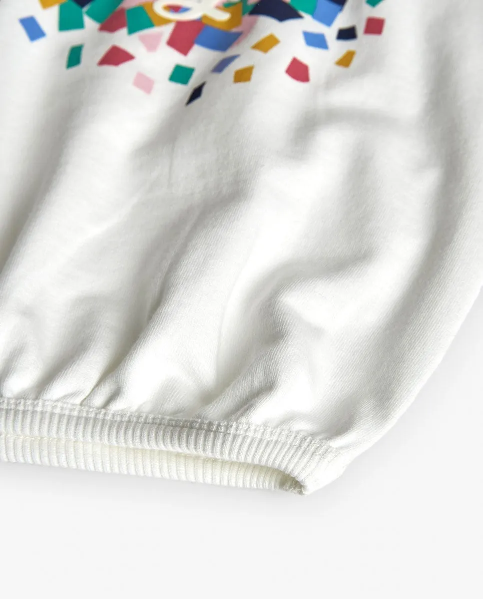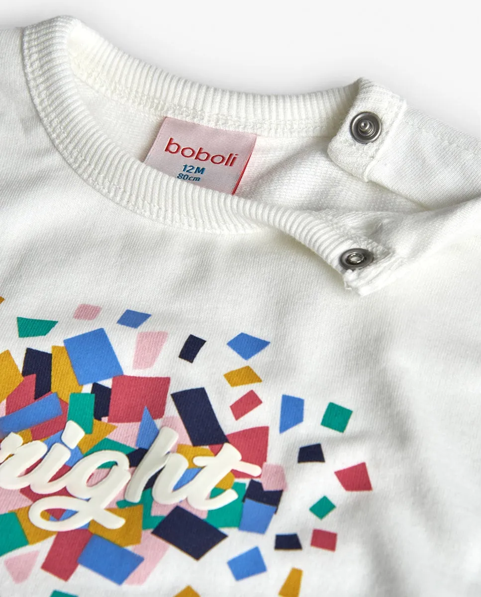 Этот белый свитер с принтом идеально подходит для осени и зимы. Изготовлен из мягкой трикотажной ткани, он предлагает ежедневный комфорт. Его белый цвет украшен ярким принтом со словом «Яркий», добавляя живости. У него круглый вырез и длинные рукава, идеально подходит для прохладных дней. Доступен в размерах от 12 месяцев до 10 лет. Это универсальная одежда, которая легко адаптируется к различным стилям, внося радость и стиль в гардероб вашей маленькой.