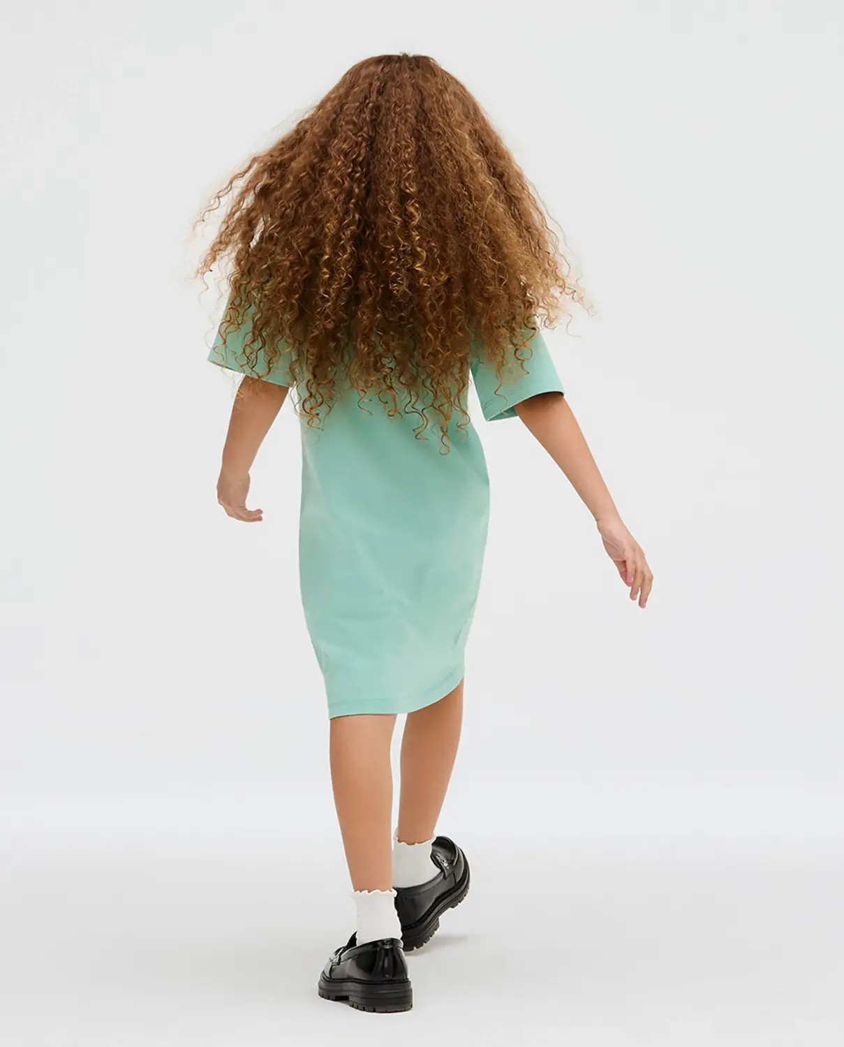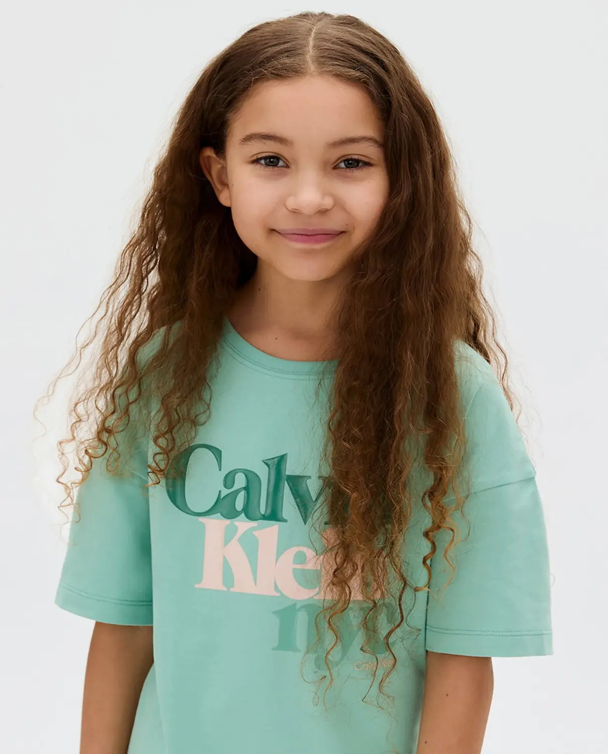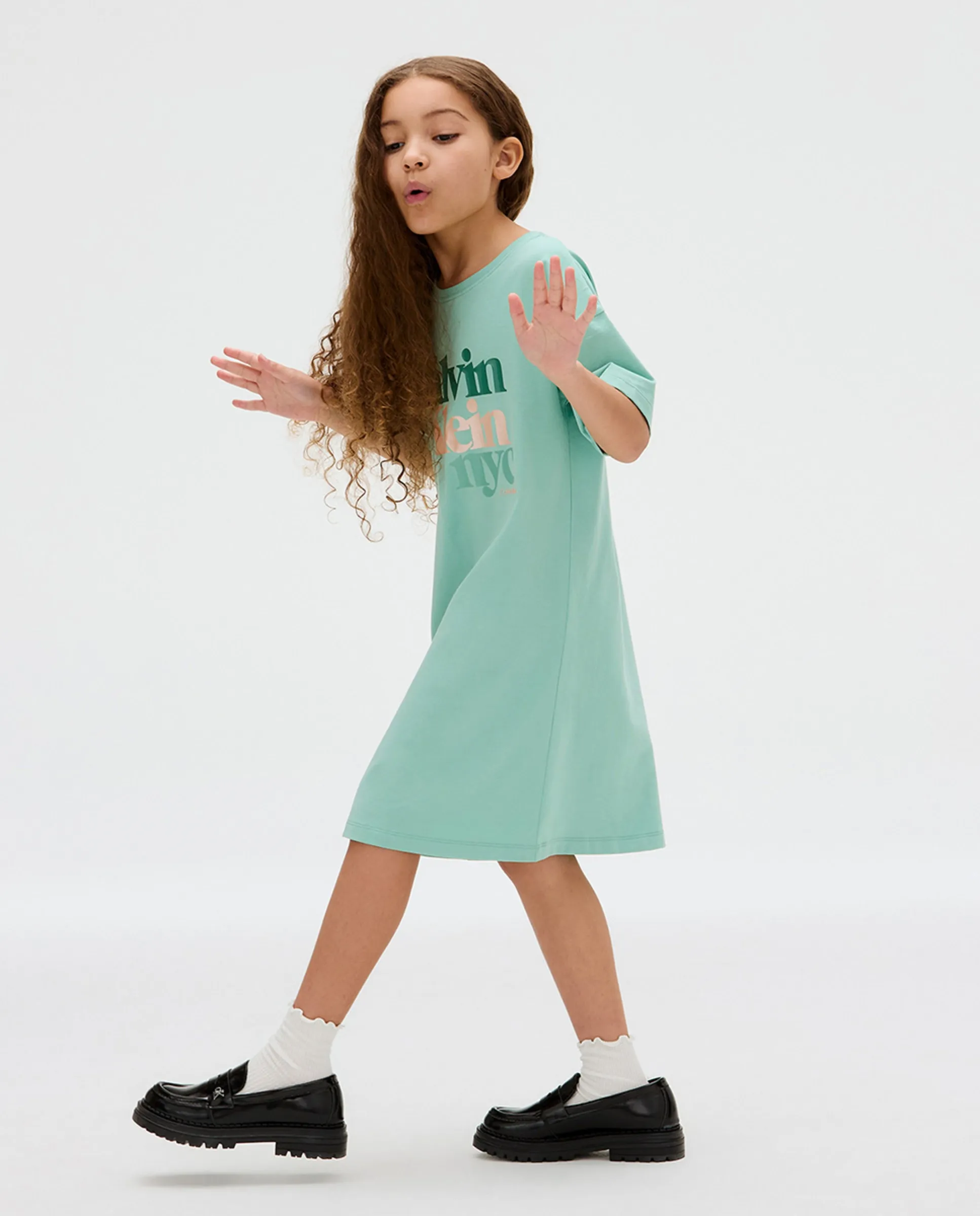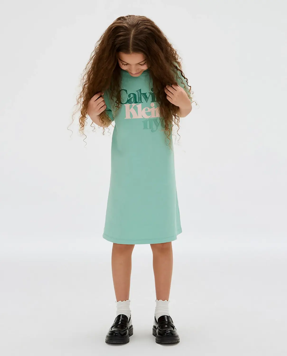 Детское платье в стиле футболки, изготовленное из органического хлопка и эластана, с коротким рукавом и графикой CK спереди.