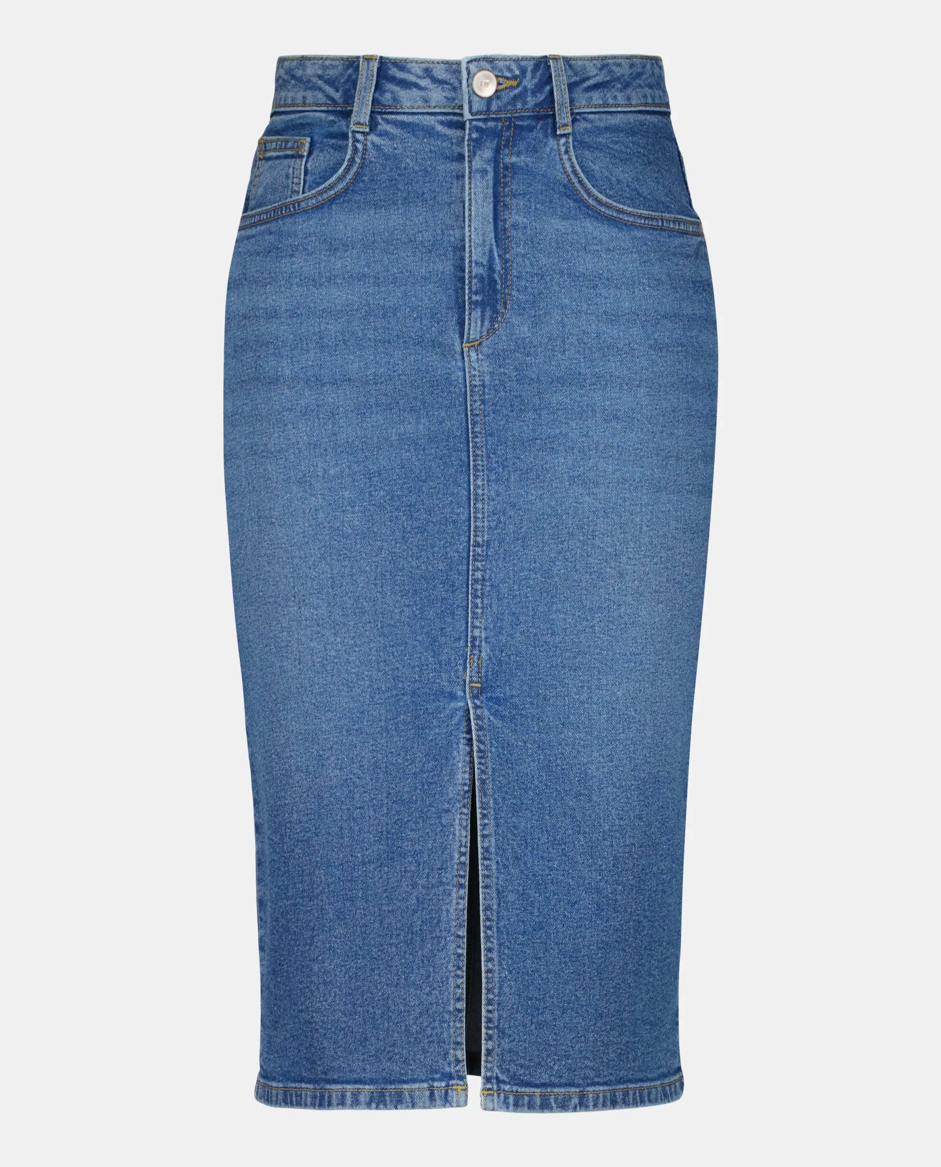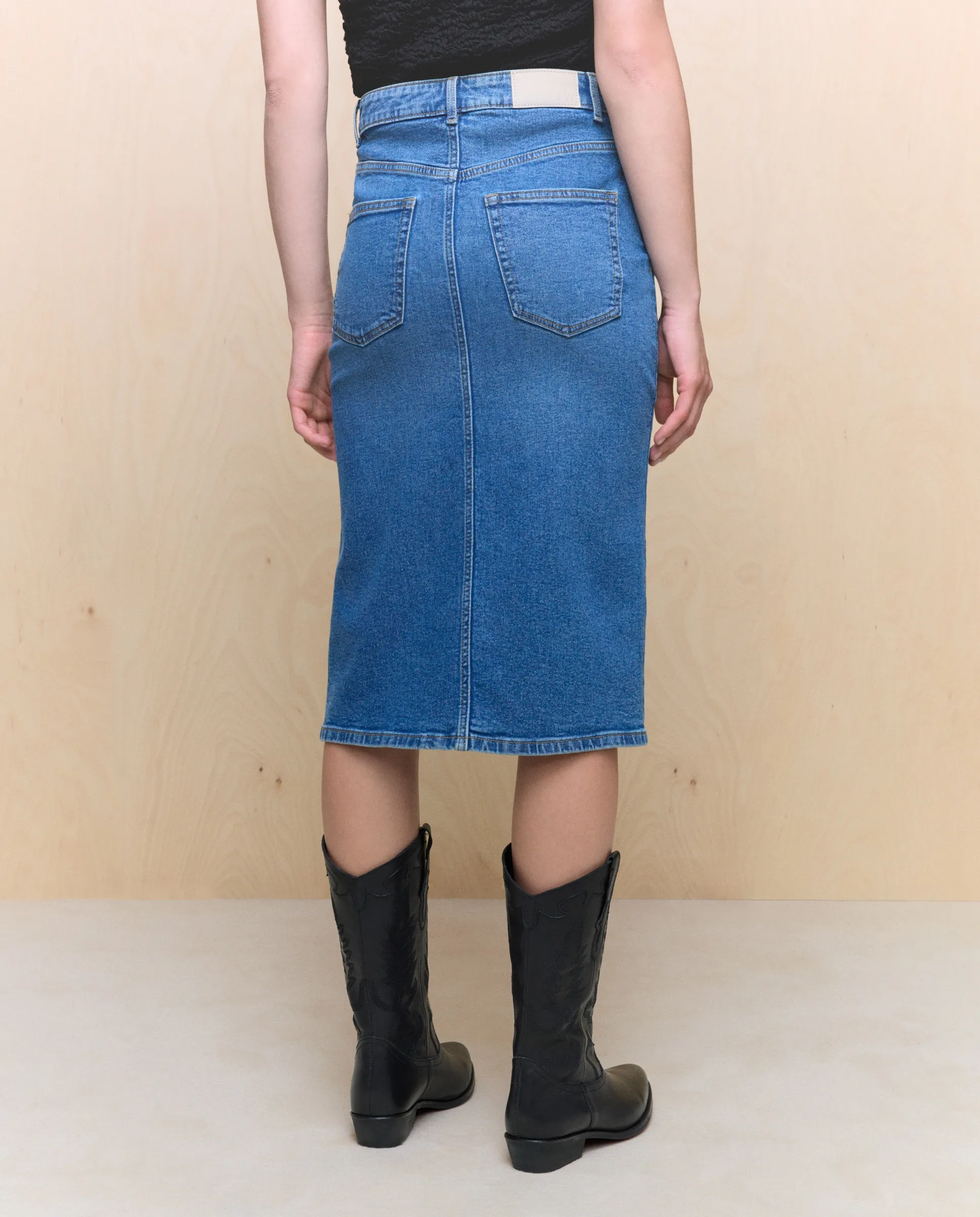 Джинсовая юбка миди до колена; эластичная ткань обеспечивает больший комфорт изделия. Стирка выполнена с использованием технологий, которые позволяют экономить энергоресурсы и воду на всех этапах производства. Хлопок BCI.
