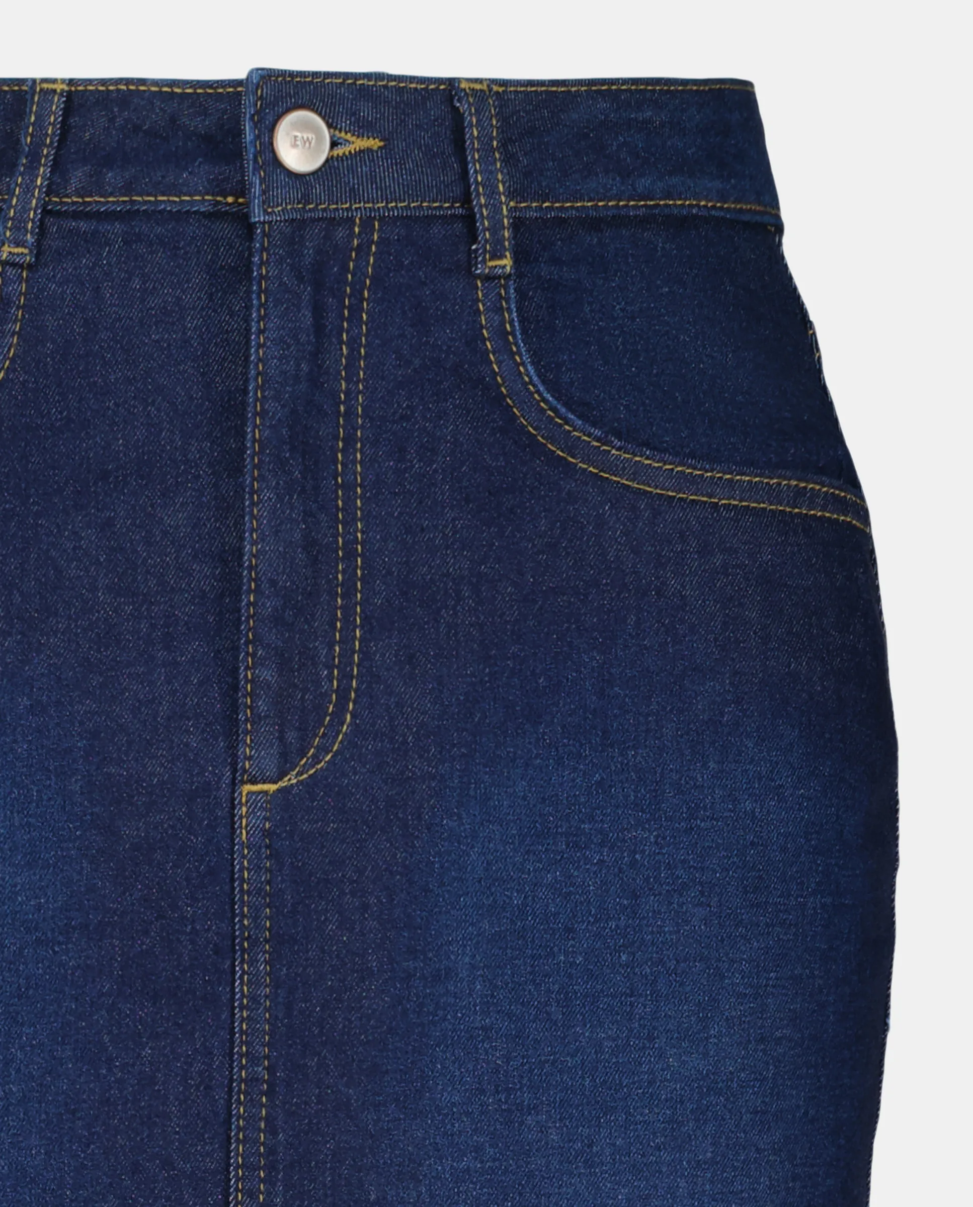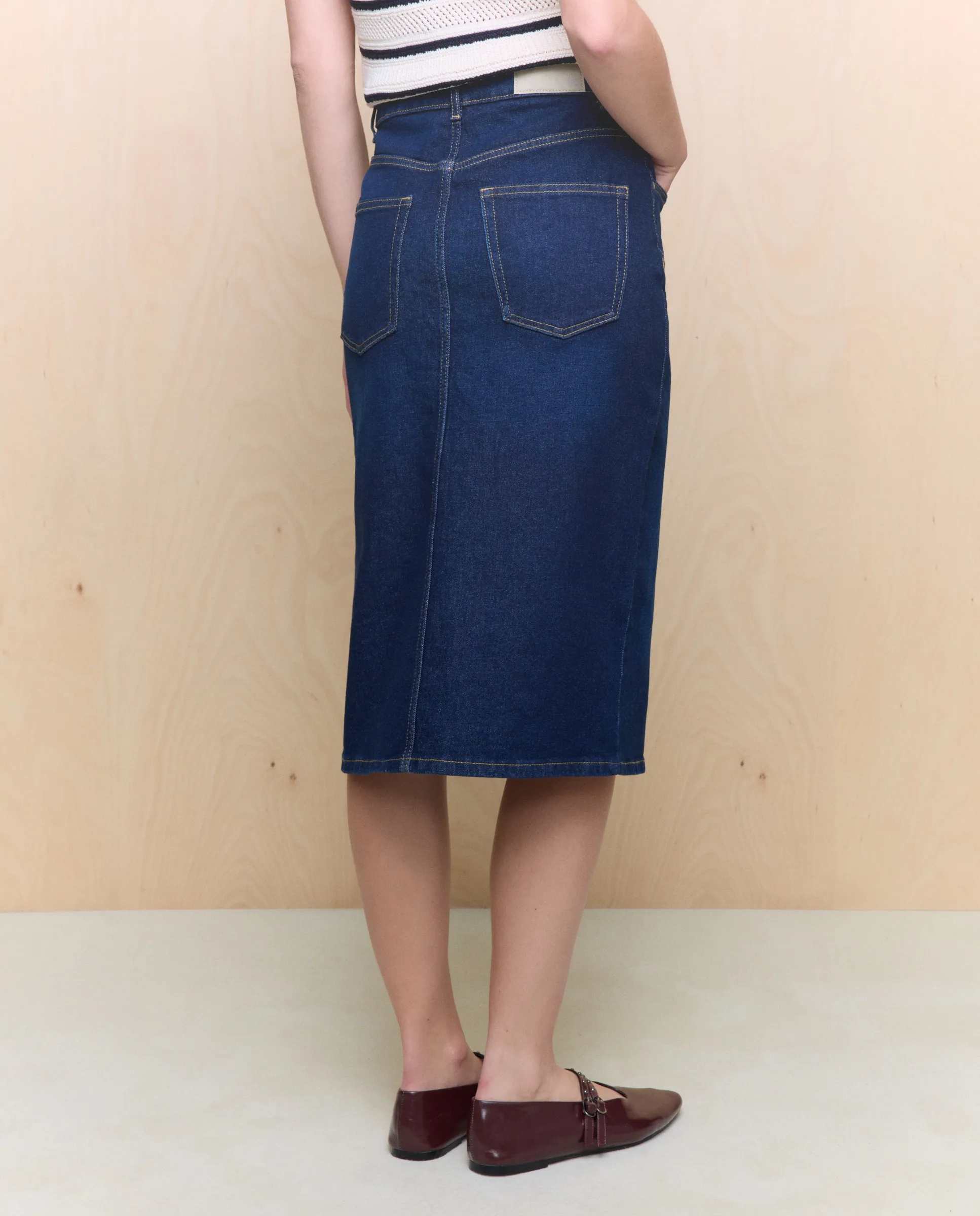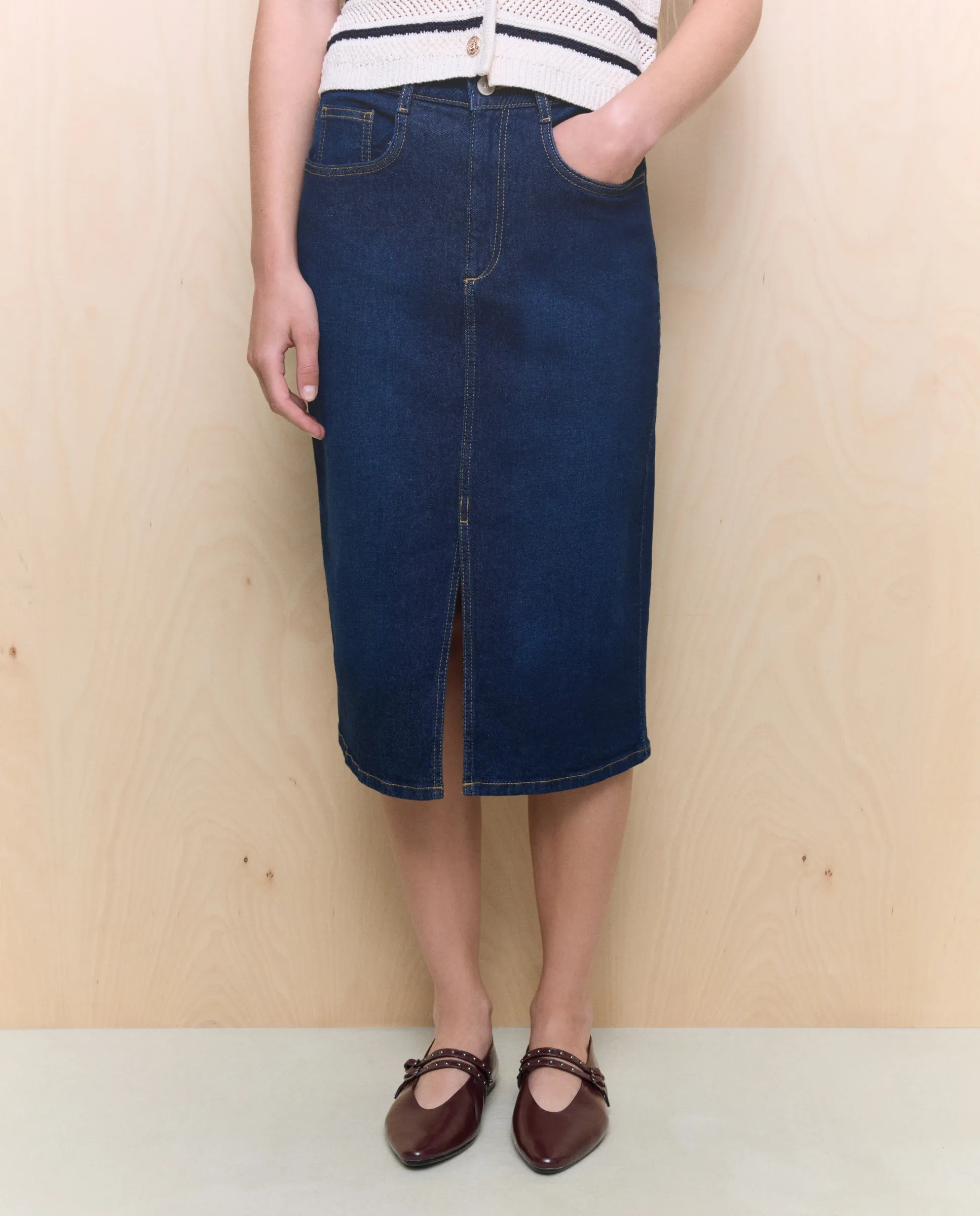 Джинсовая юбка миди до колена; эластичная ткань обеспечивает больший комфорт изделия. Стирка выполнена с использованием технологий, которые позволяют экономить энергоресурсы и воду на всех этапах производства. Хлопок BCI.