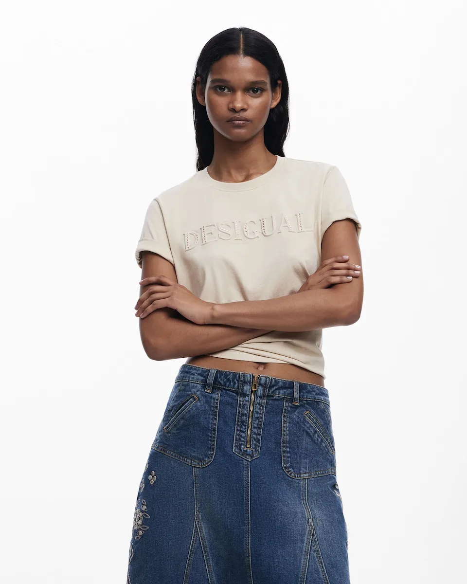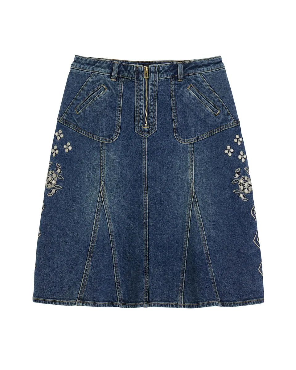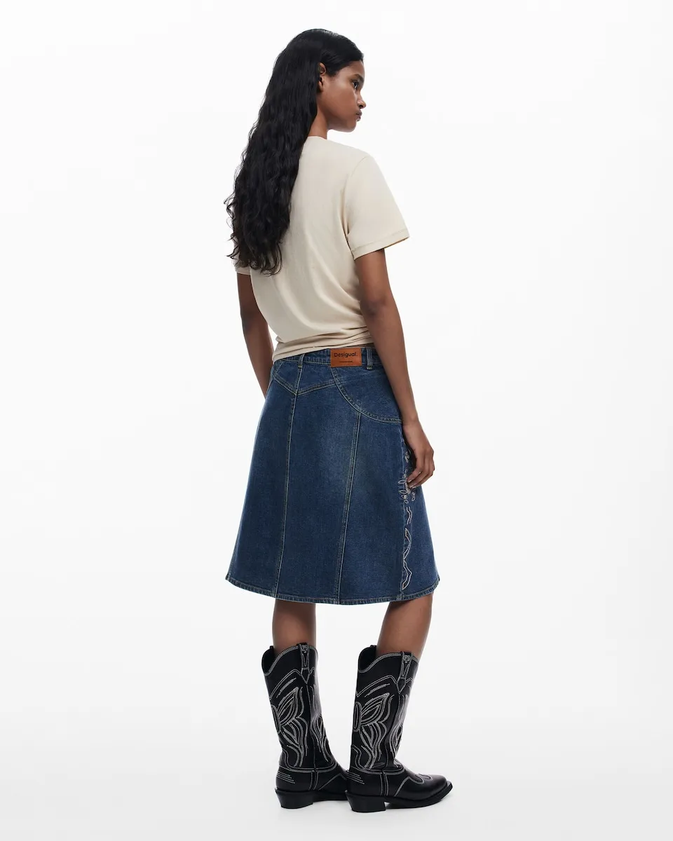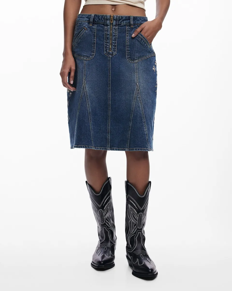 Юбка до колена с клиньями из денима и вышитыми деталями. Фасон: Прямой. Длина: до колена. Передние и задние карманы. Застежка на молнии. С вышитыми деталями. При покупке изделий из хлопка от Desigual вы поддерживаете наши инвестиции в Better Cotton. Этот продукт получен через систему балансировки масс и может не содержать Better Cotton. bettercotton.org/massbalance.