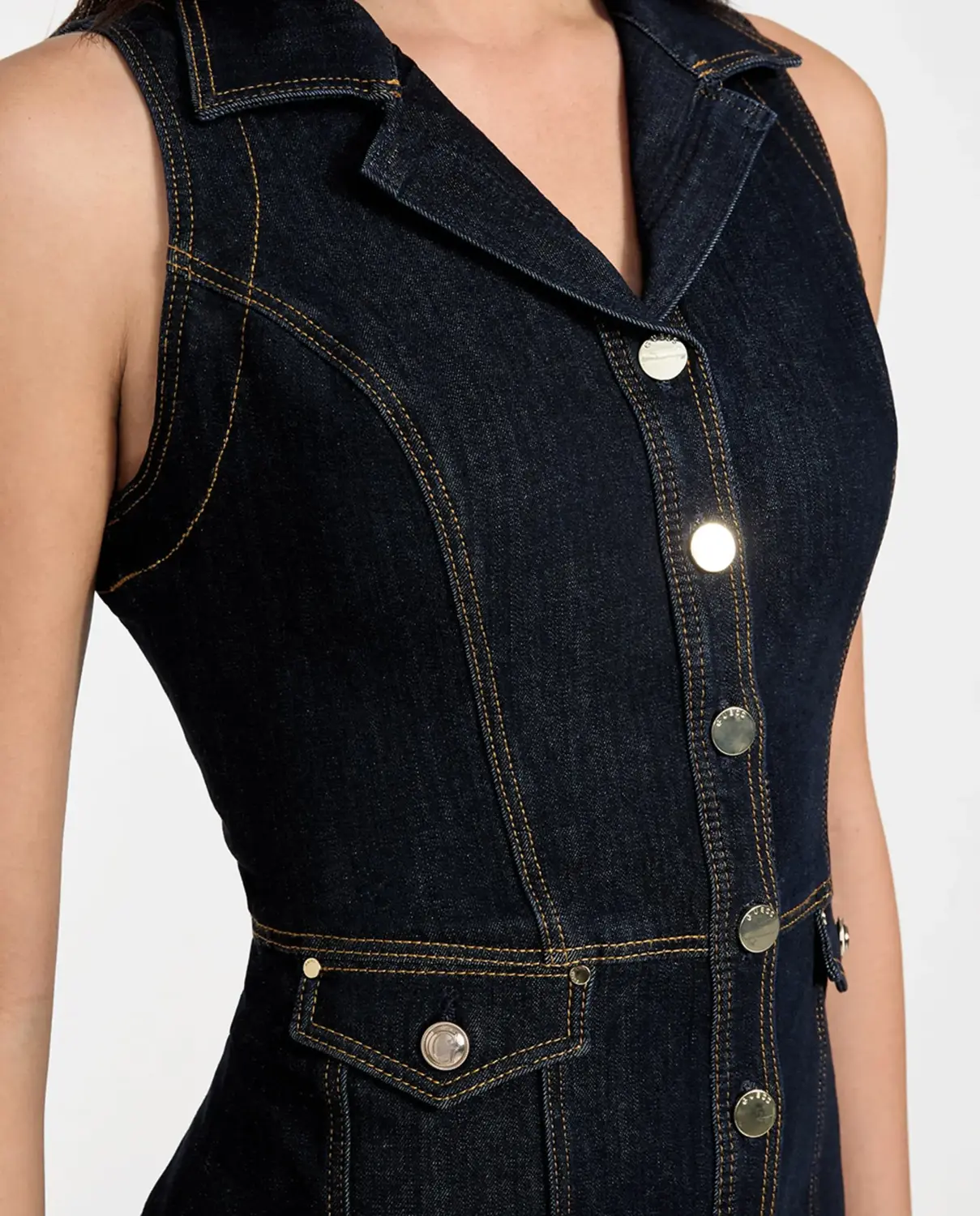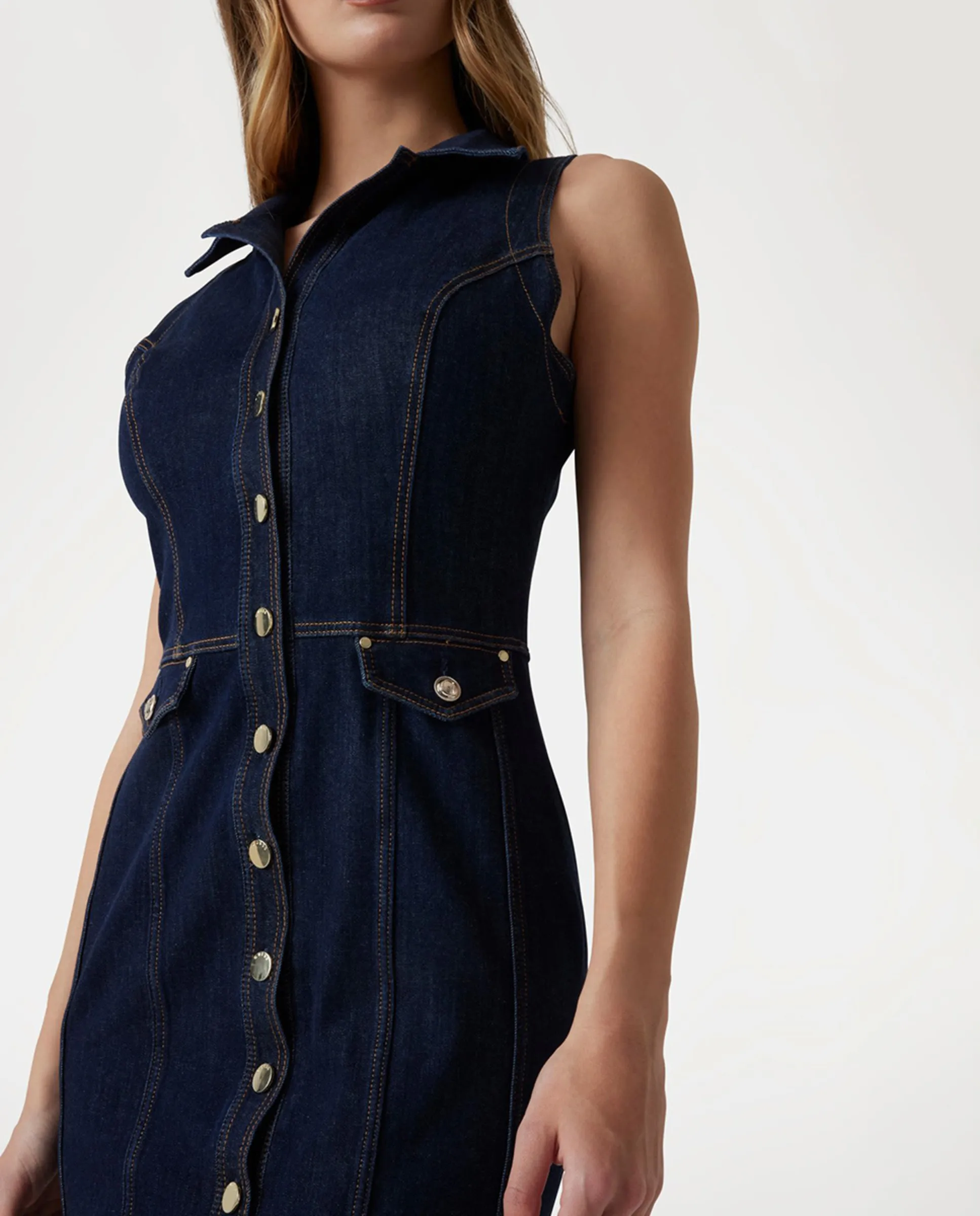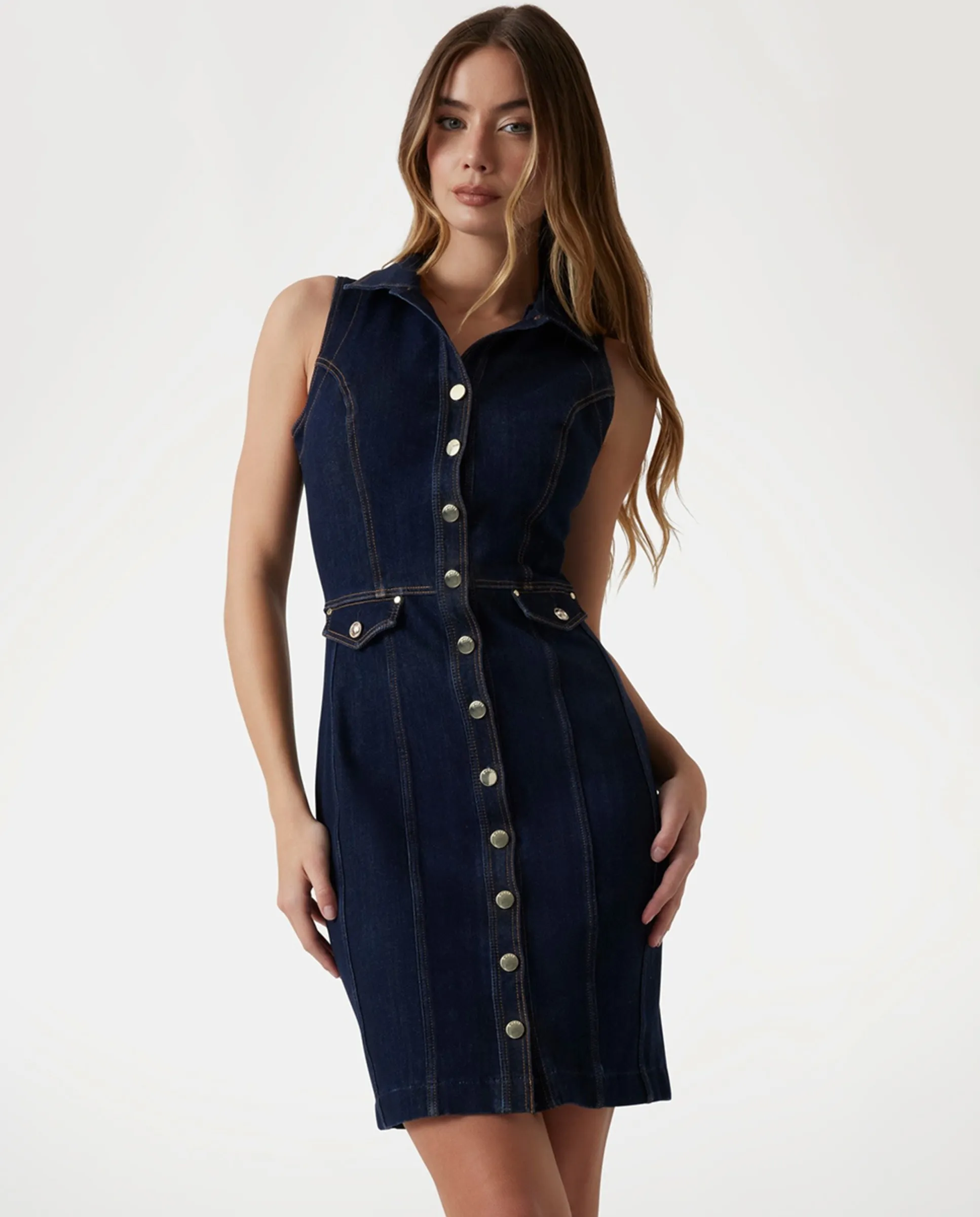 Короткое джинсовое платье с пуговицами и карманами на талии.