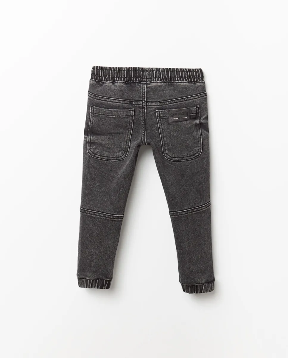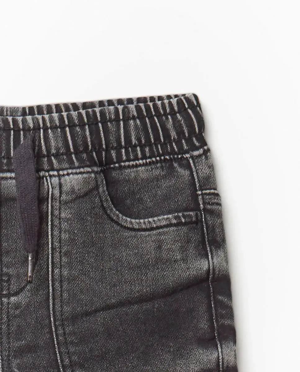 Джинсы в стиле джоггеры с манжетами внизу. Регулируемый пояс со шнурком.