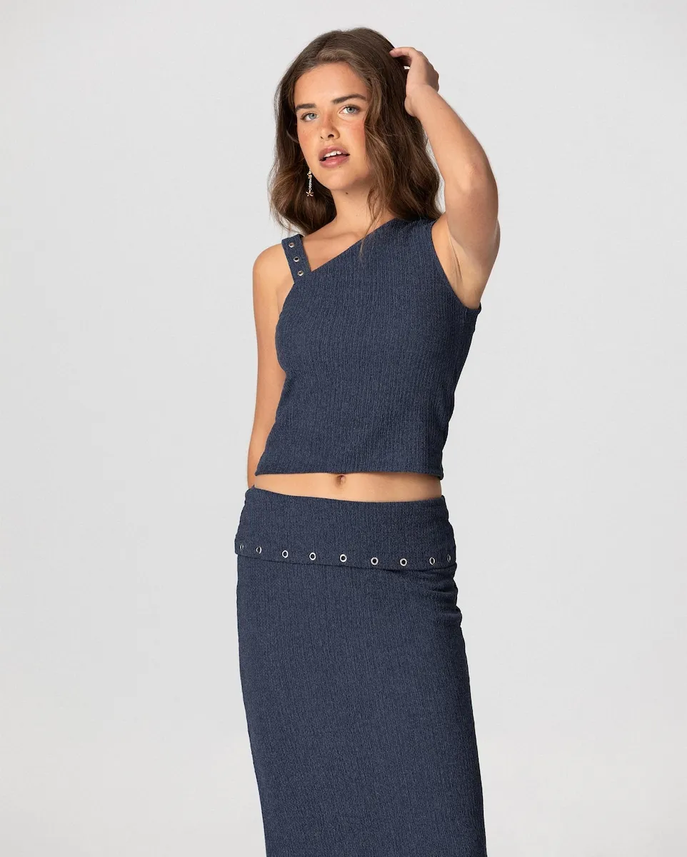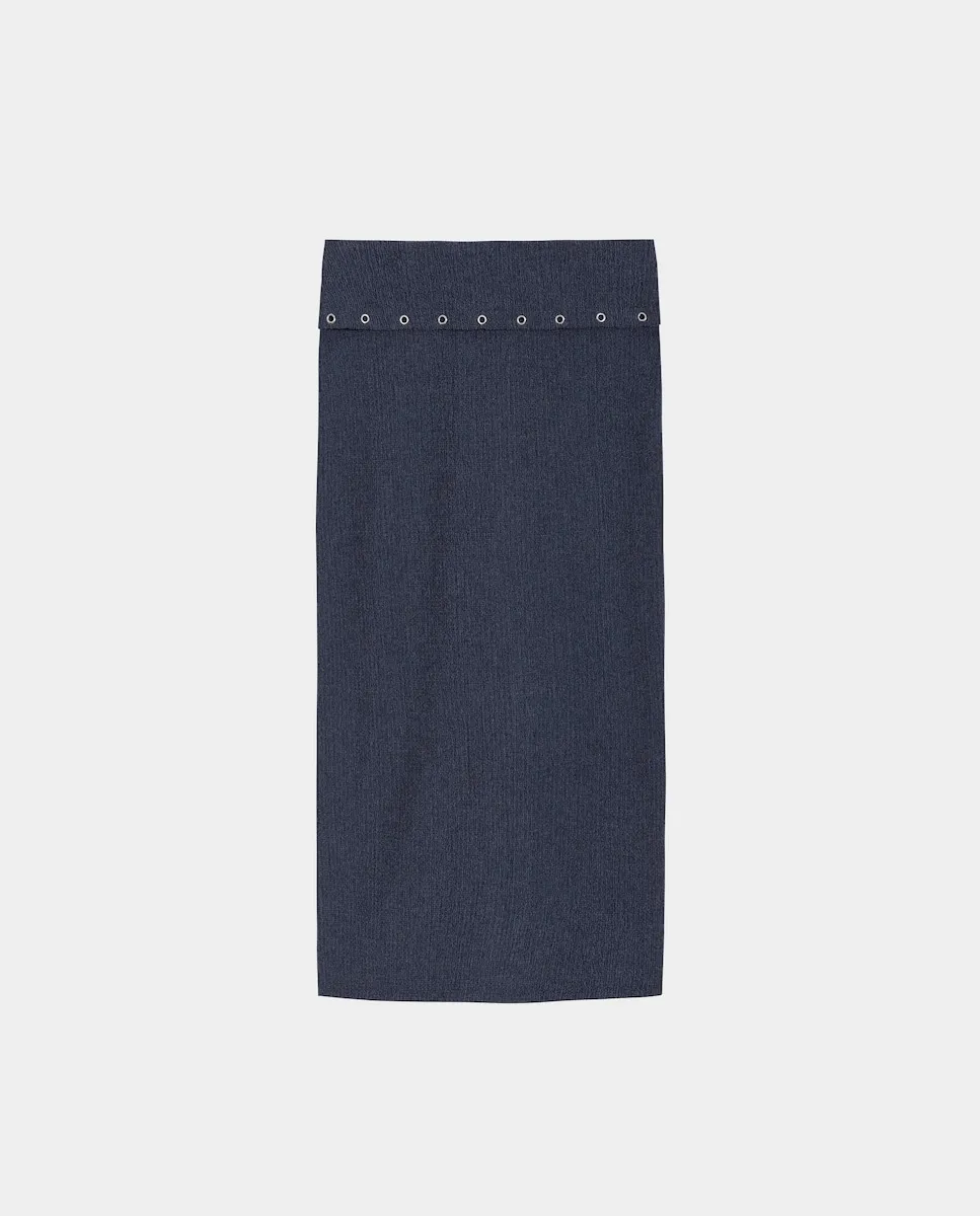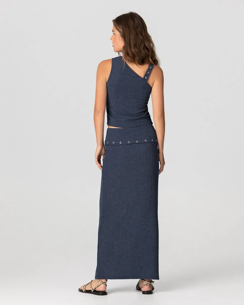 Миди-юбка синего цвета, выполненная из эластичной ткани, которая идеально облегает силуэт. Золотистая деталь на талии добавляет изысканности дизайну. Сочетайте ее с топом MARTINA и получите идеальный образ для любого случая.