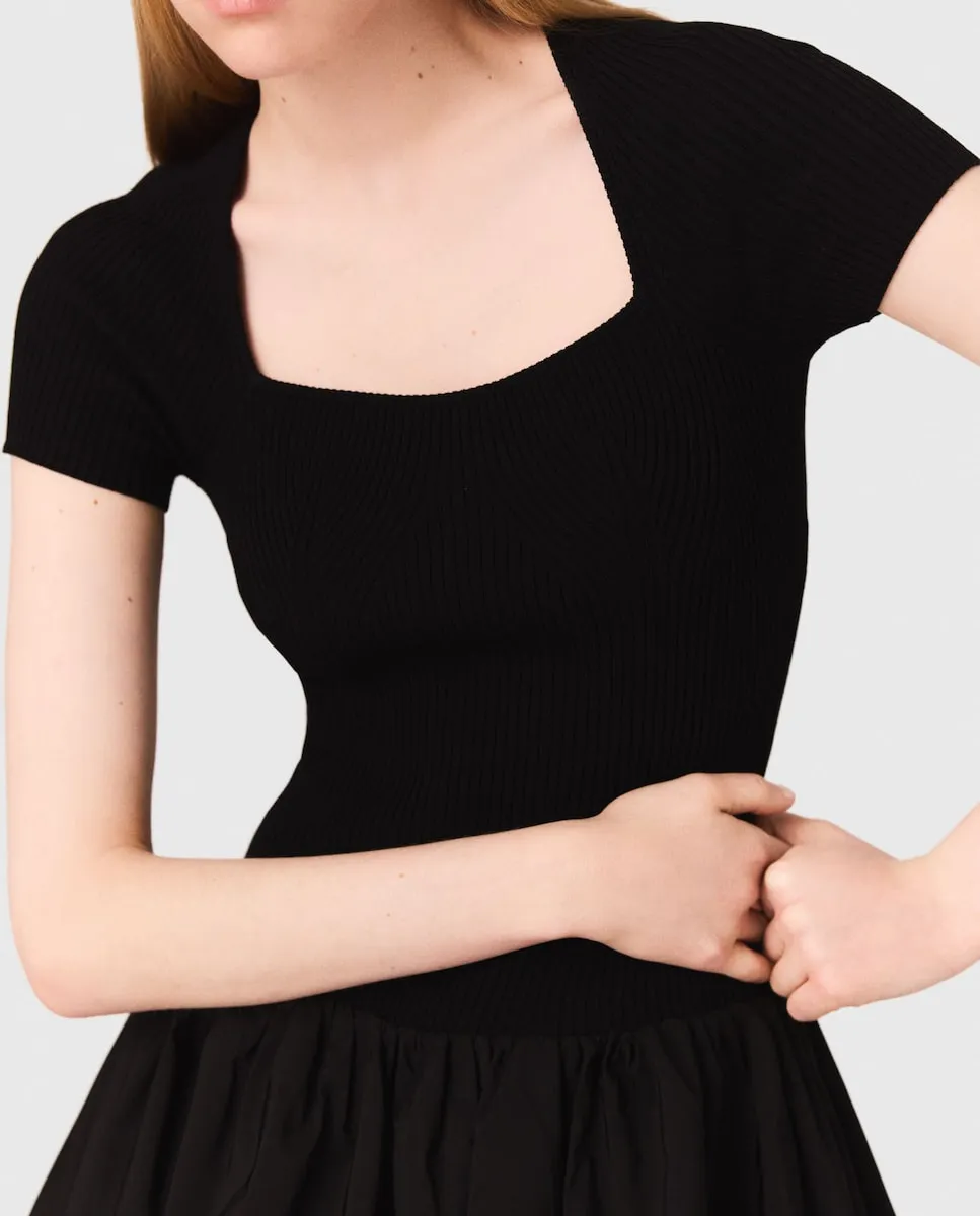 Длинное биматериальное платье. Верх из вязаной ткани с круглым вырезом и короткими рукавами. Объемная юбка из тафты с эффектом пузыря. В этом сезоне Maje играет с материалами и объемами, чтобы предложить современные и элегантные вещи, идеально подходящие для возвращения. Это длинное биматериальное платье сочетает в себе комфорт вязаной ткани и легкость и объем тафты. Верх с круглым вырезом и короткими рукавами обеспечивает чистый силуэт, в то время как объемная юбка из тафты с эффектом пузыря создает красивый контраст. Идеально подходит для особого события, она привлекает все взгляды своим уникальным кроем. Для завершения образа добавьте зеркальные туфли на каблуке и сумку с логотипом, которая обеспечивает стиль как элегантный, так и смелый.