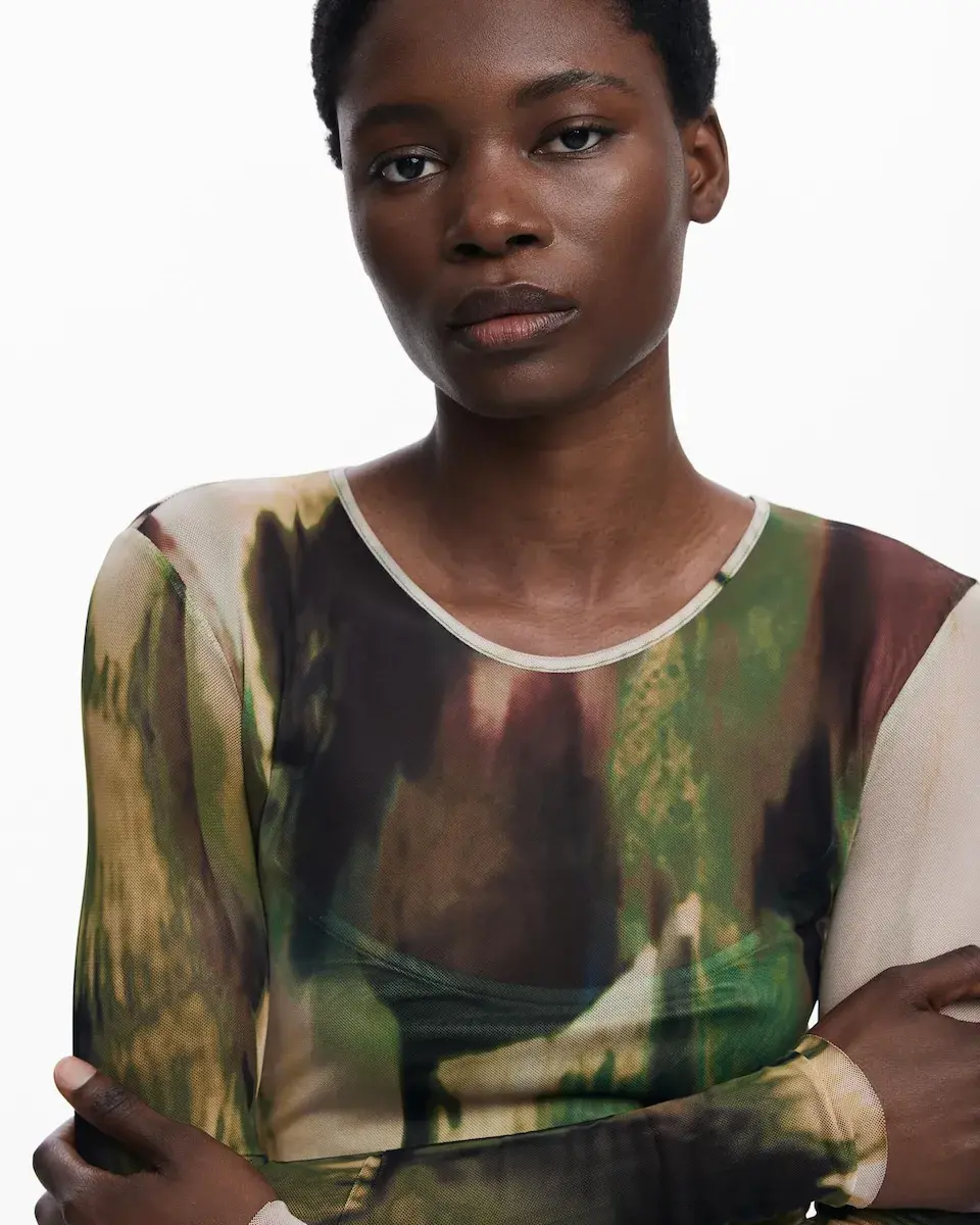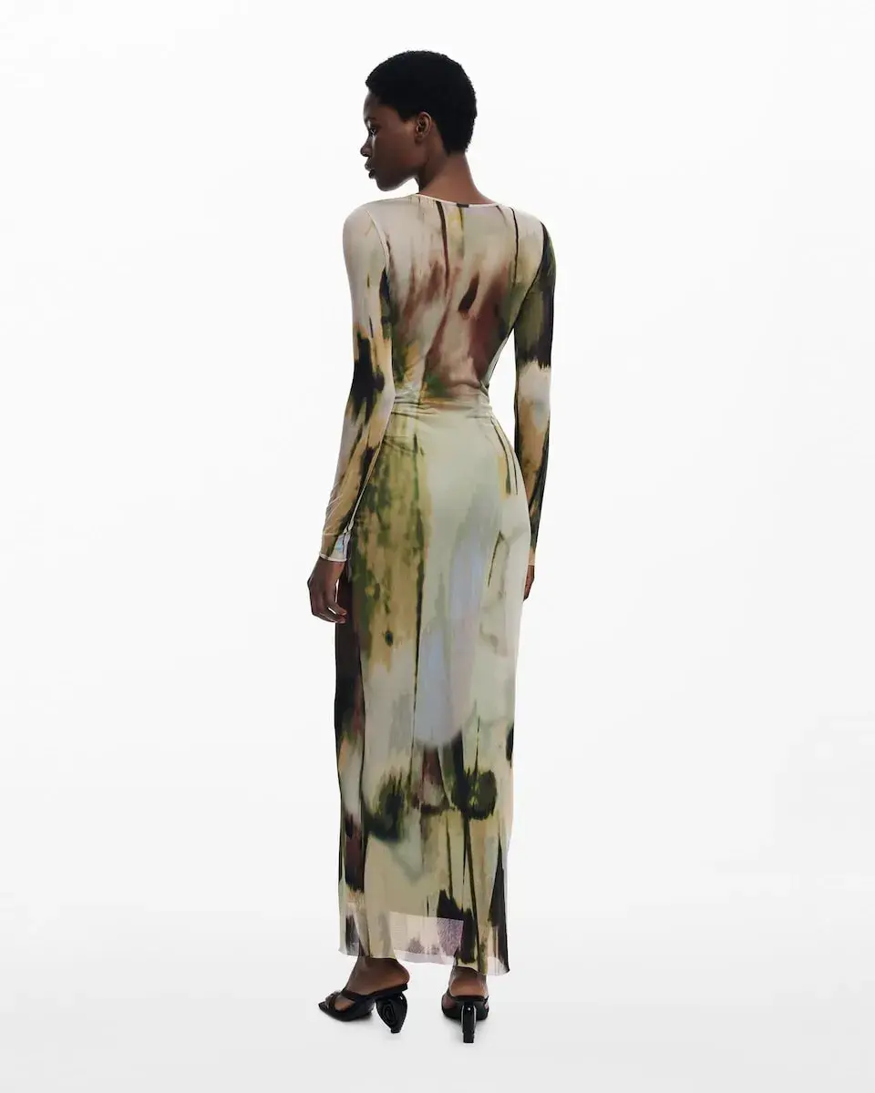 Длинное платье из тюля с длинными рукавами и слегка поднятым воротником, подкладка в стиле бандо и артовый принт в зеленых тонах. Крой: узкий. Рукав: длинный. Длина: длинная. Переработанный полиэстер.