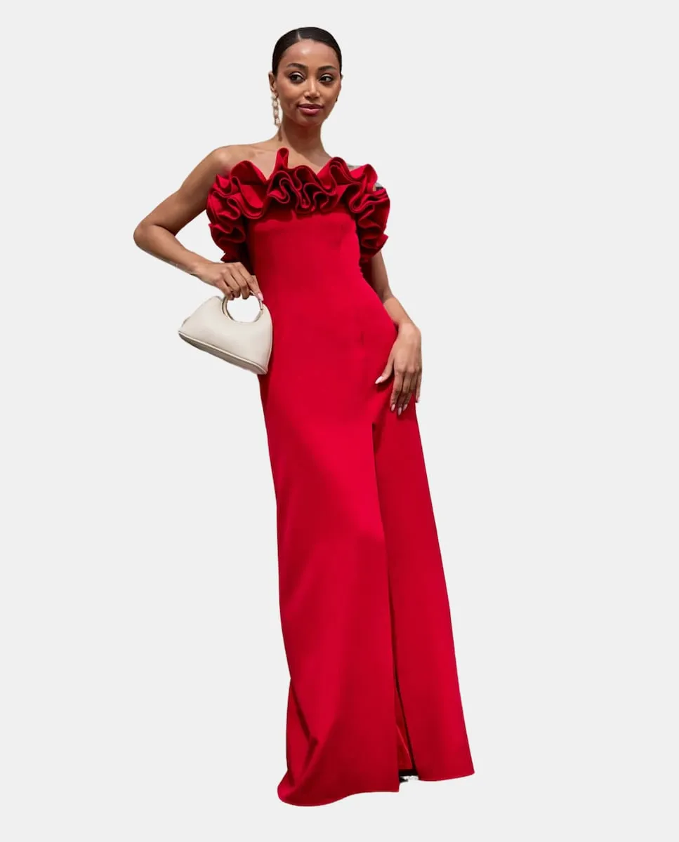 Длинное платье с декольте халтер и воланами Miphai, красный