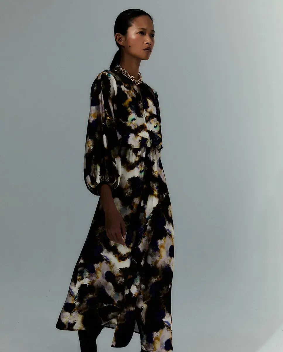 С длинными рукавами платье с запахом. Вырез с застежкой. Застежка сзади в форме капли с пуговицей.