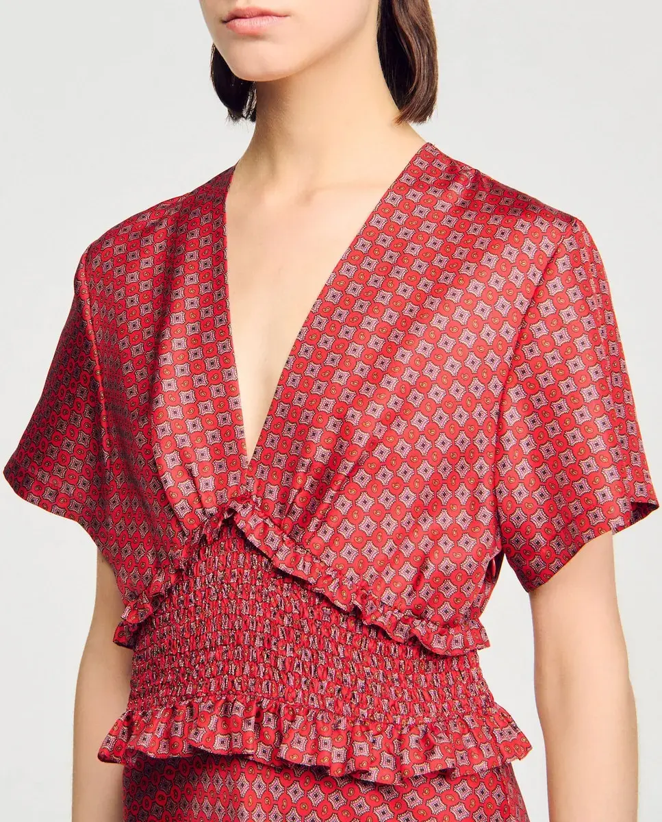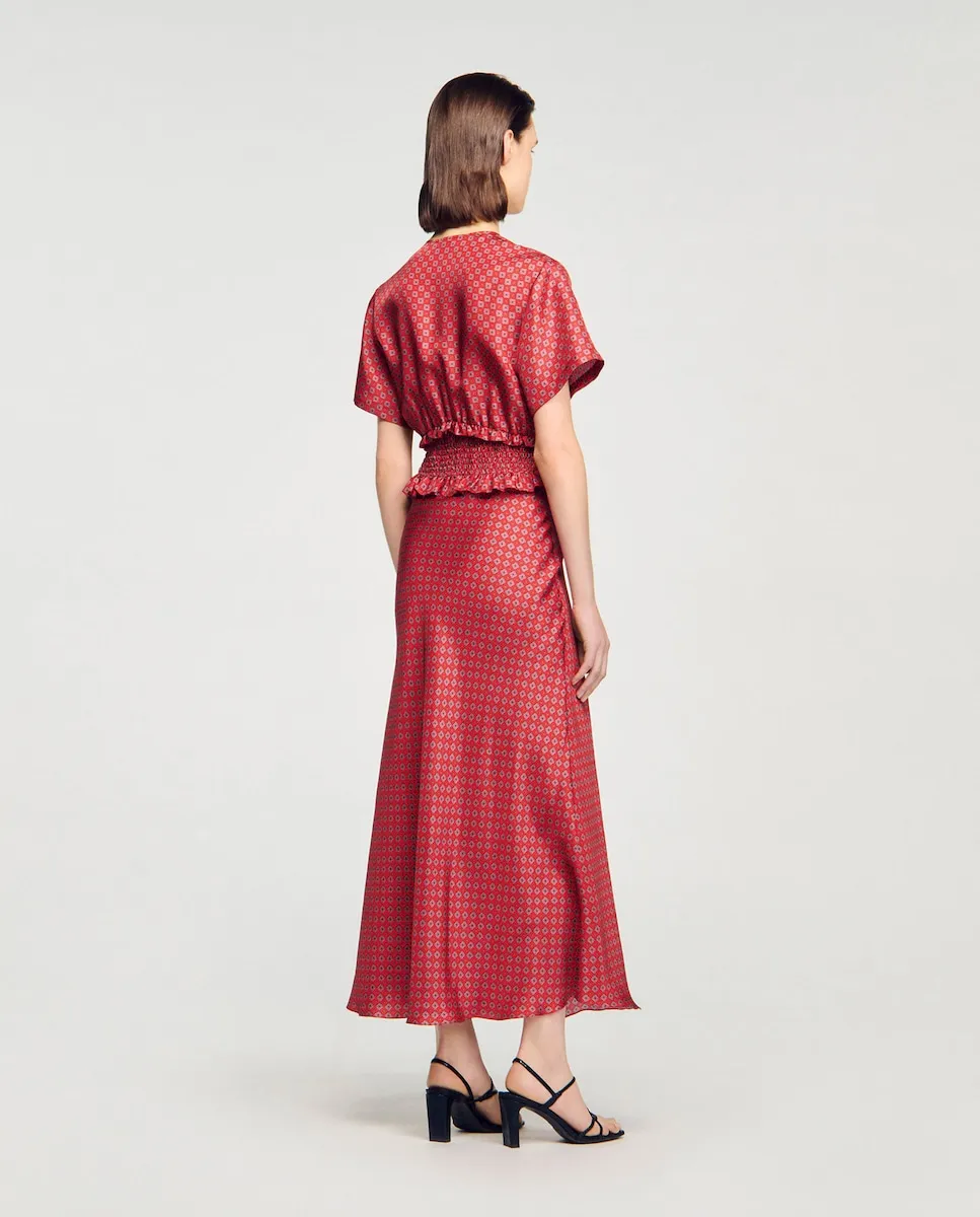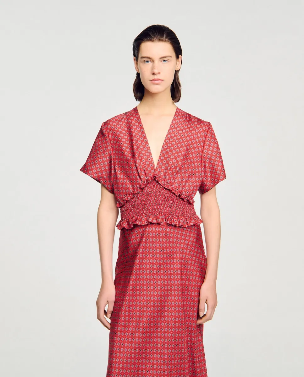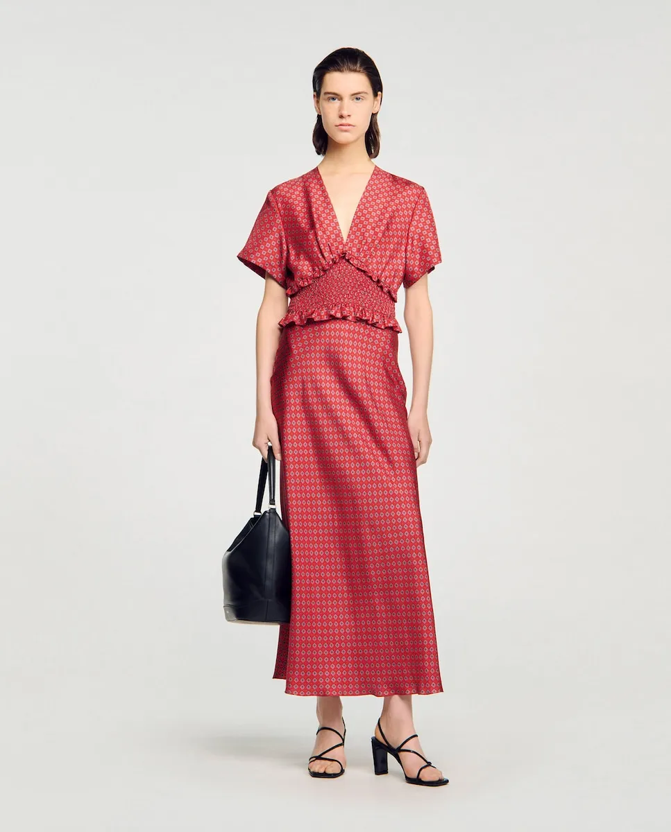 Длинное сатиновое платье, украшенное шаром с принтом, с V-образным вырезом, короткими рукавами, сборками на талии и рюшами под грудью. Длинное платье Sandro для женщин. Принт с шаром. V-образный вырез. Короткие рукава. Собранная талия с рюшами под грудью. Расклешенная юбка.