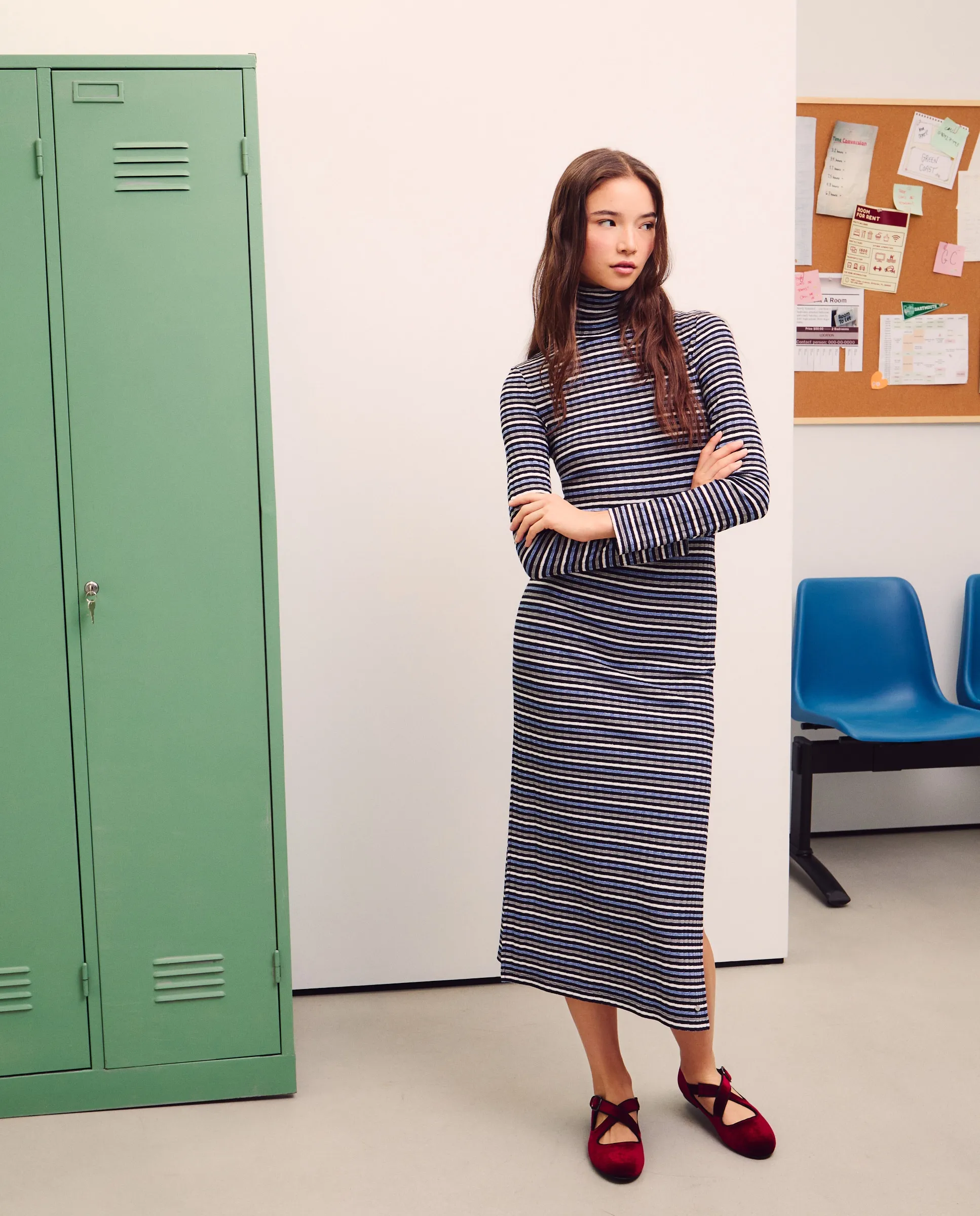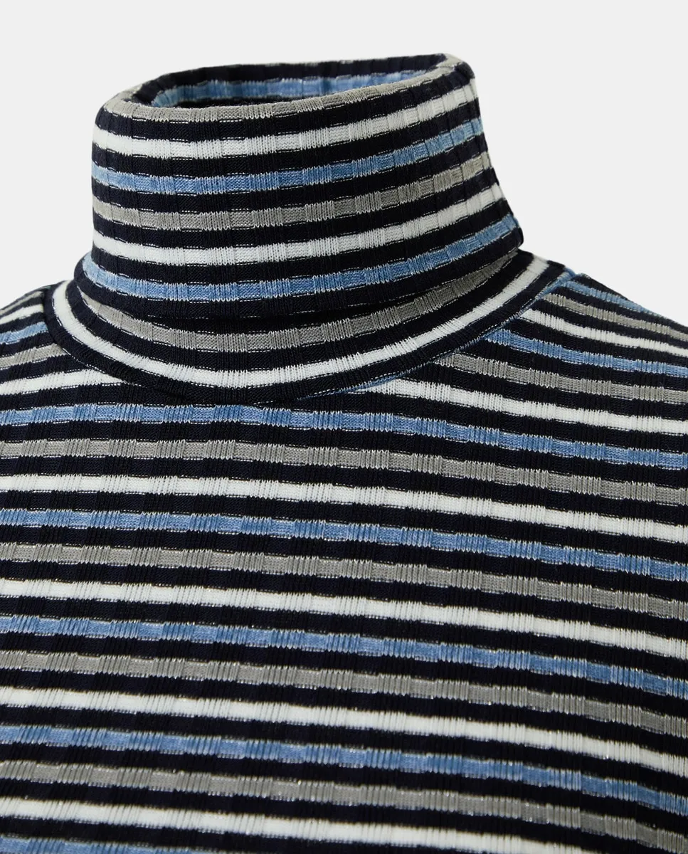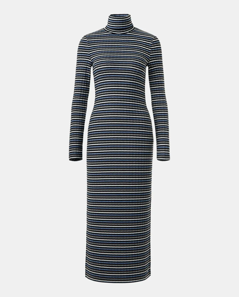 Платье с длинными рукавами и воротником-перкинс с полосками и люрексом.