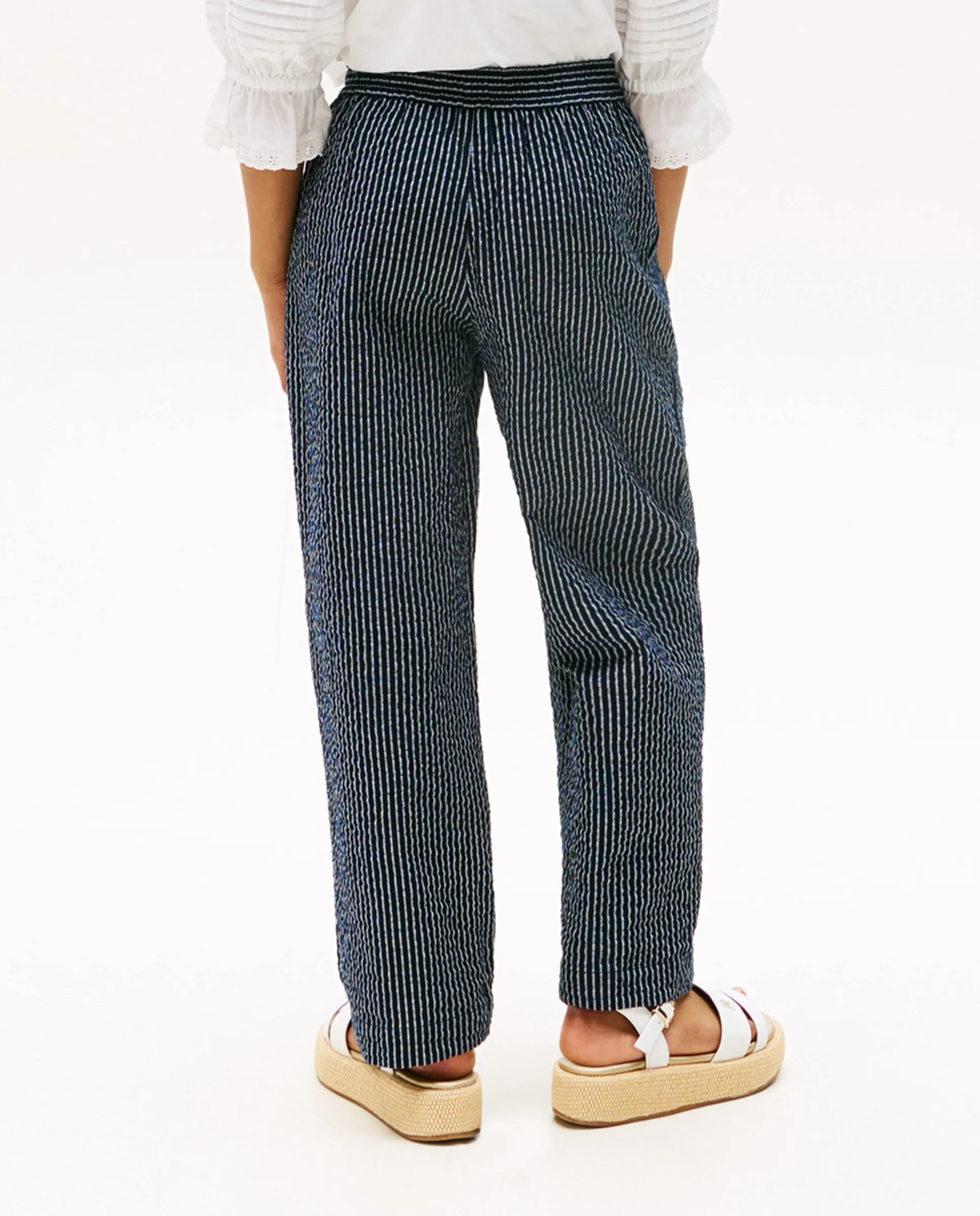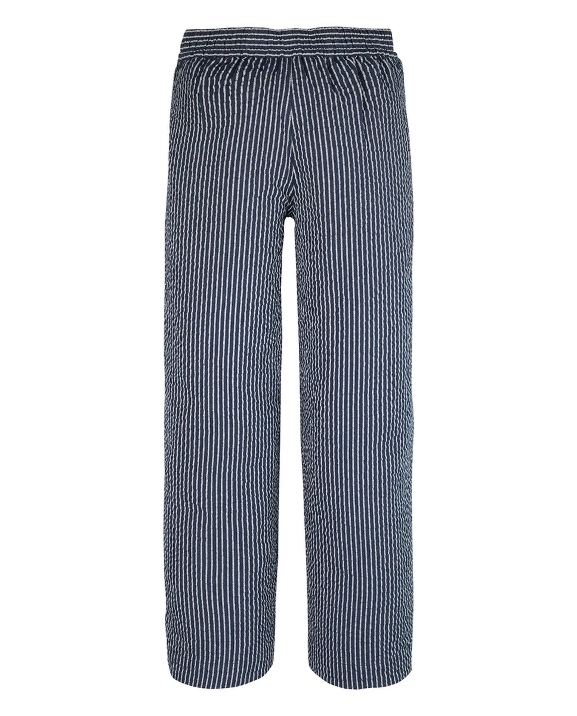 Прямые длинные штаны из ткани с резинкой на поясе.