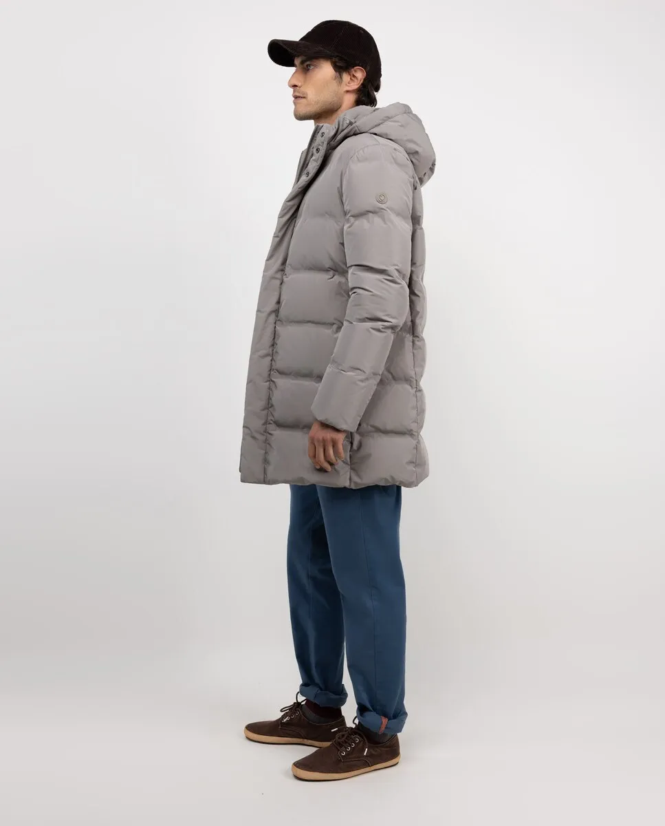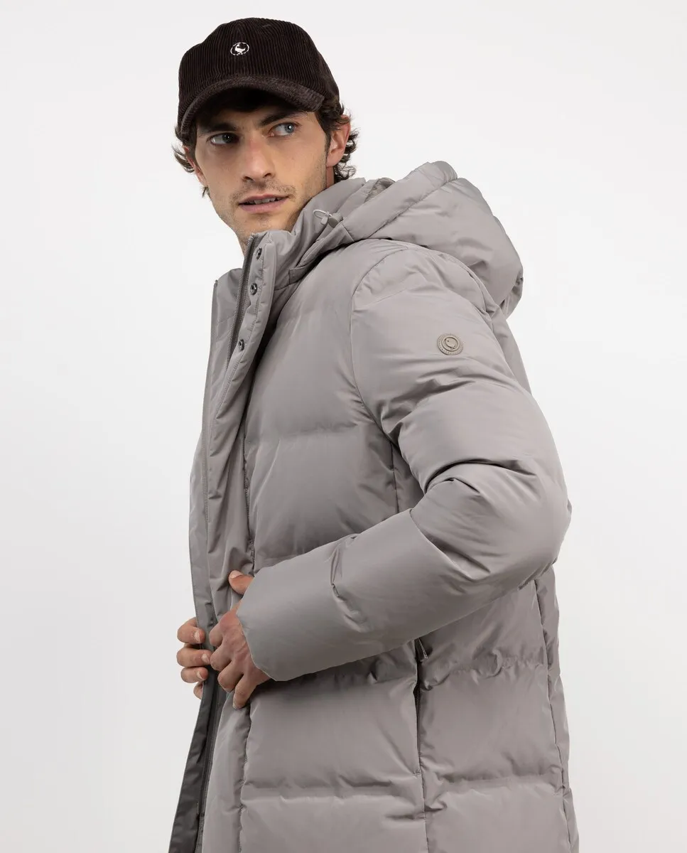 Длинное стеганое пальто для мужчин. Утеплитель из переработанного пуха. Водоотталкивающая полиэстеровая ткань. Стандартный крой. Капюшон с отстегивающимся замком. Закрытие на молнии с планкой на кнопках. Декоративная лента с флагом на внутренней планке.