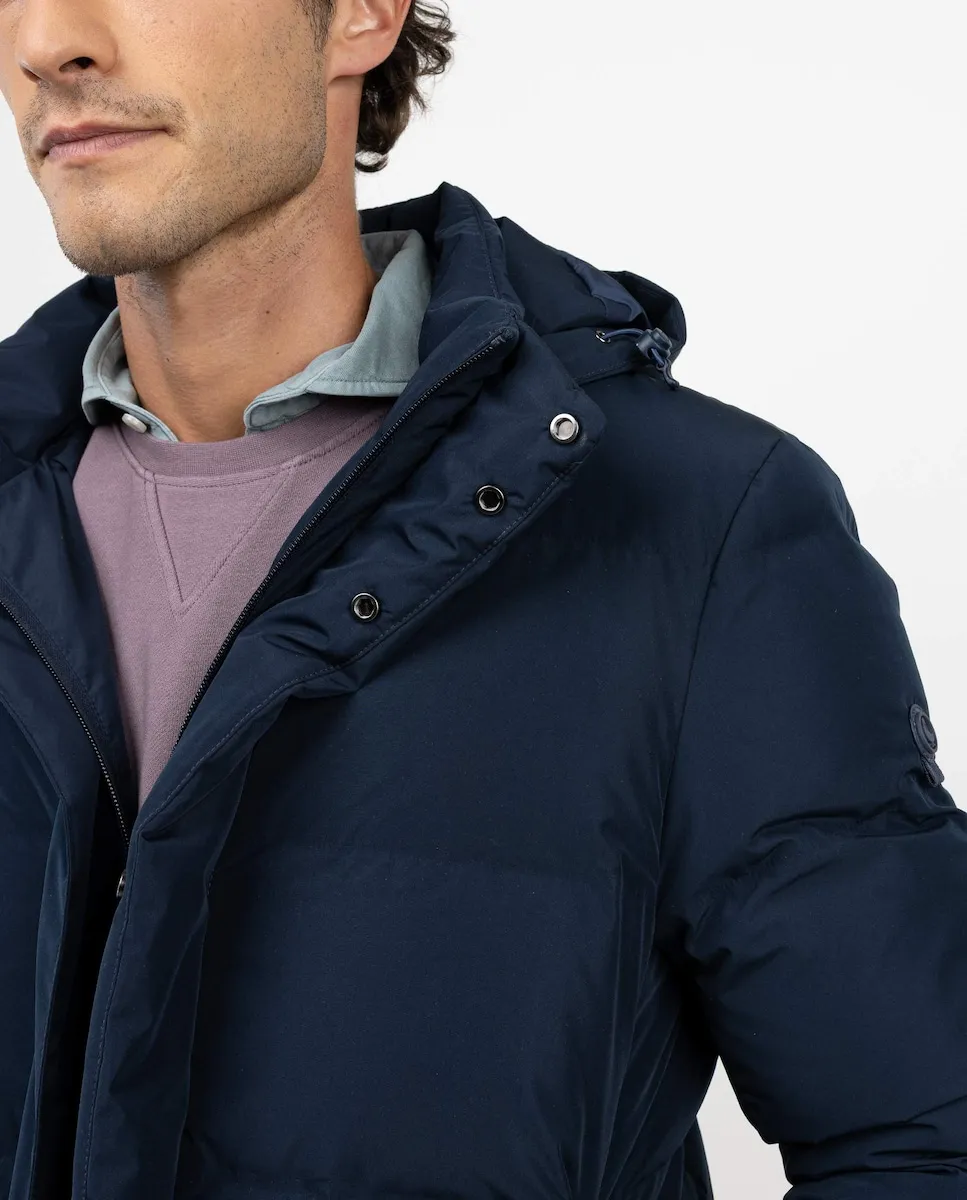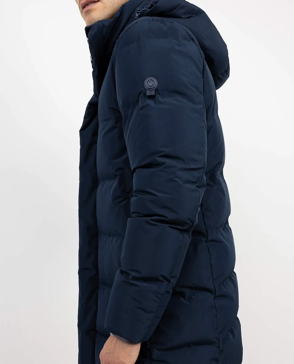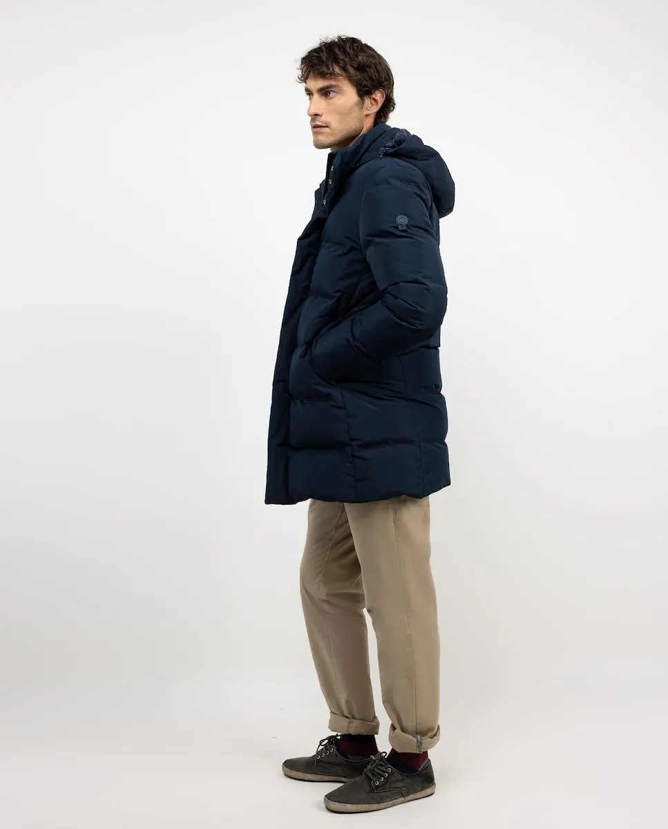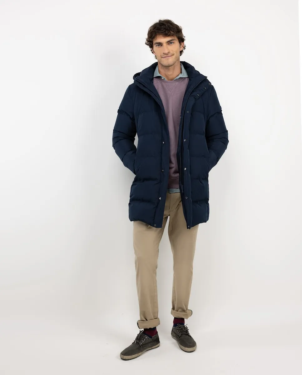 Длинное стеганое пальто для мужчин. Утеплитель из переработанного пуха. Водоотталкивающая полиэстеровая ткань. Стандартный крой. Капюшон с отстегивающимся замком. Закрытие на молнии с планкой на кнопках. Декоративная лента с флагом на внутренней планке.