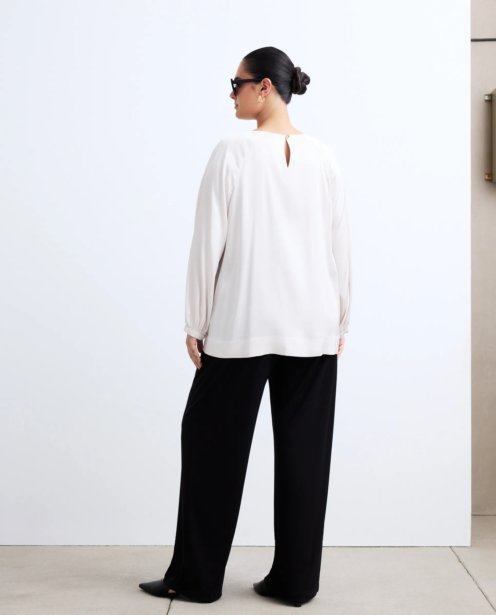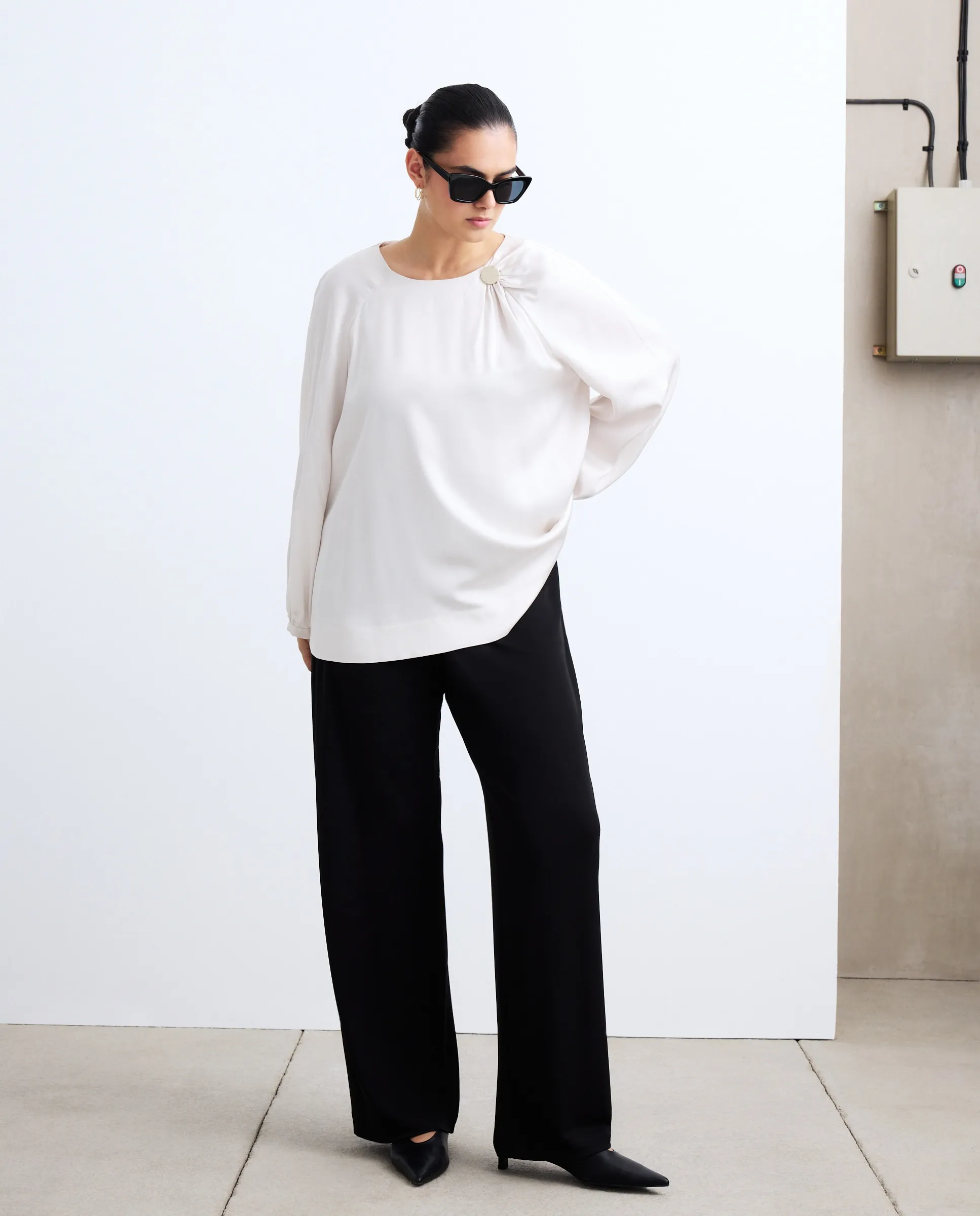 Блузка с длинными рукавами из сатина без узора с деталью в виде пуговицы.