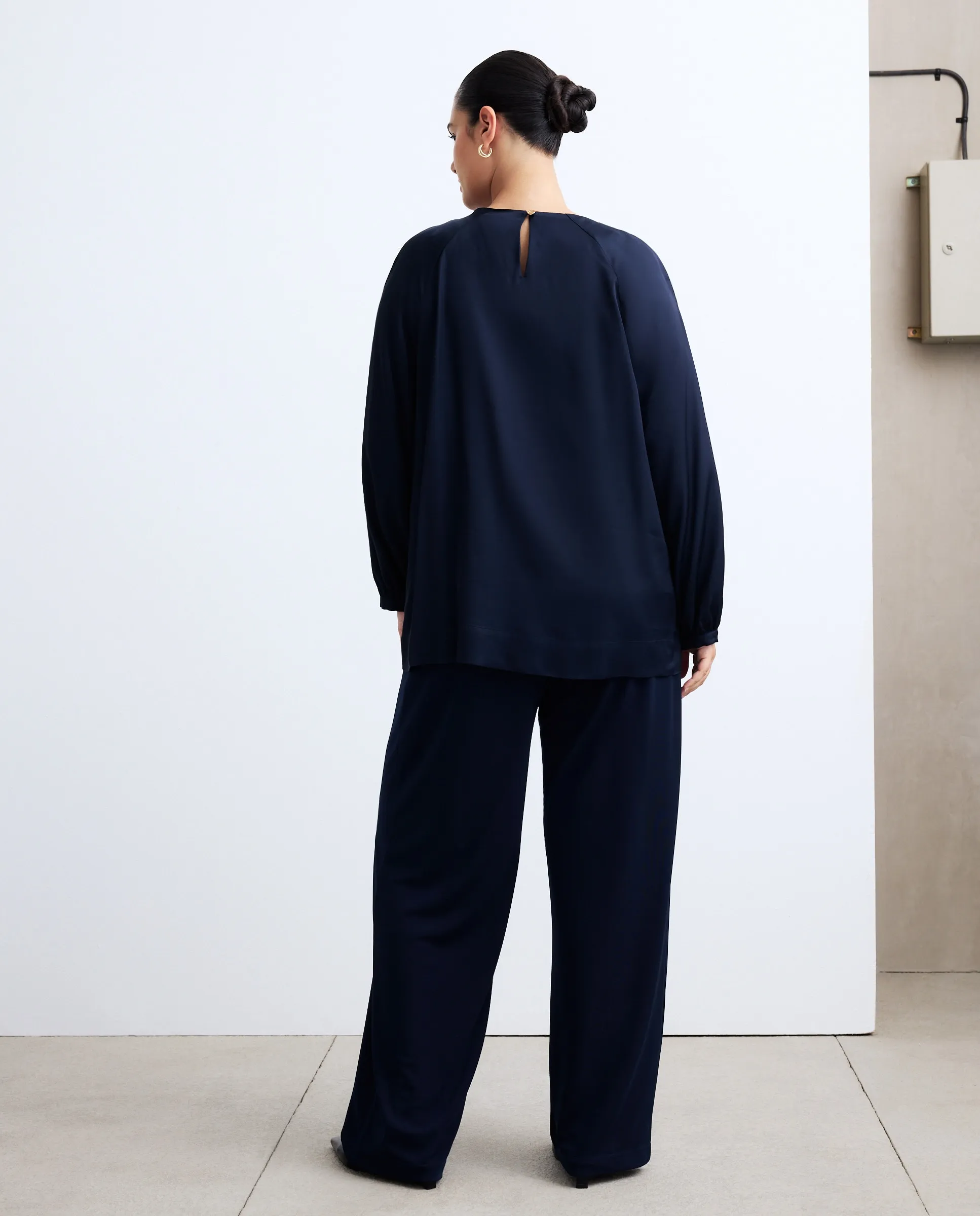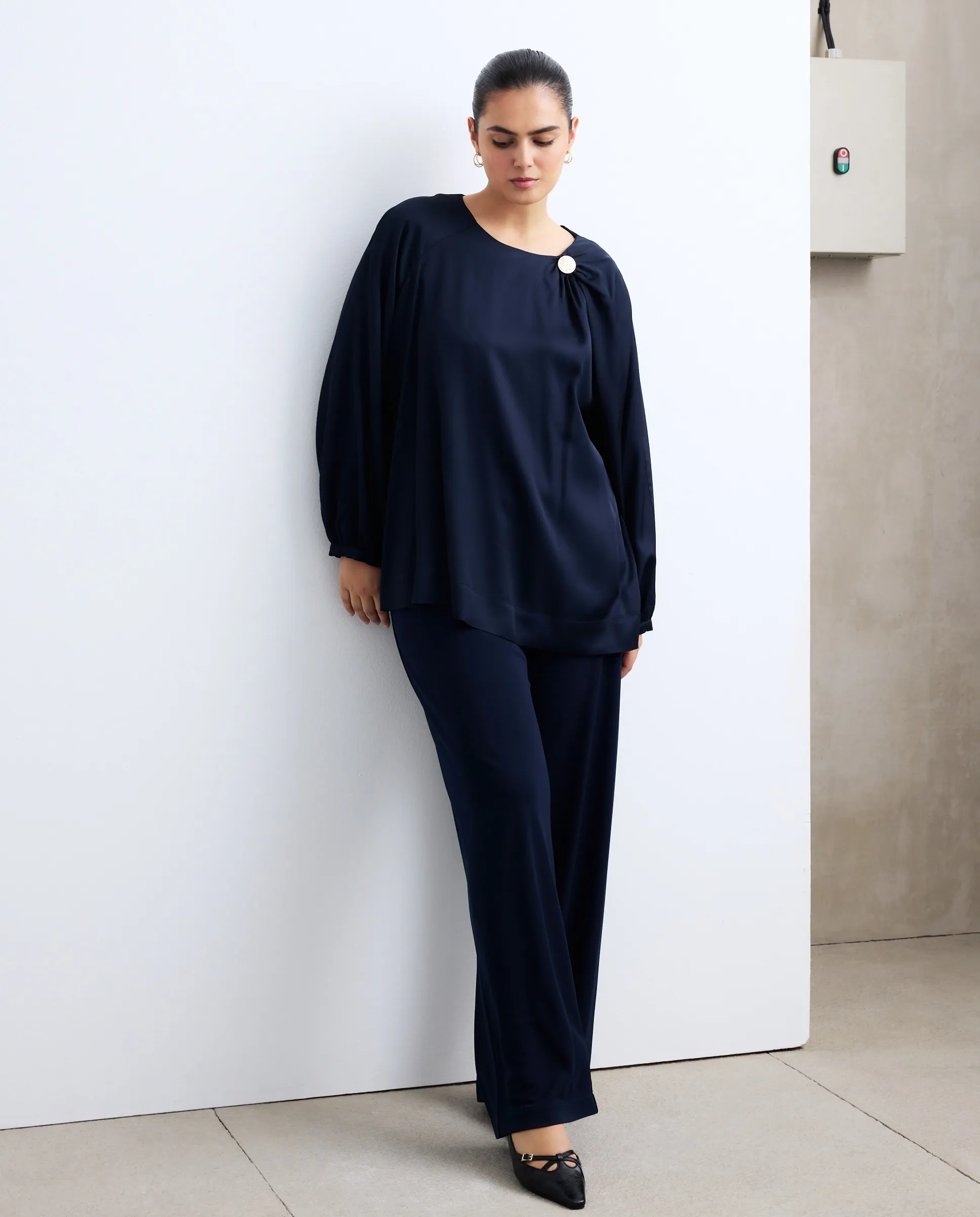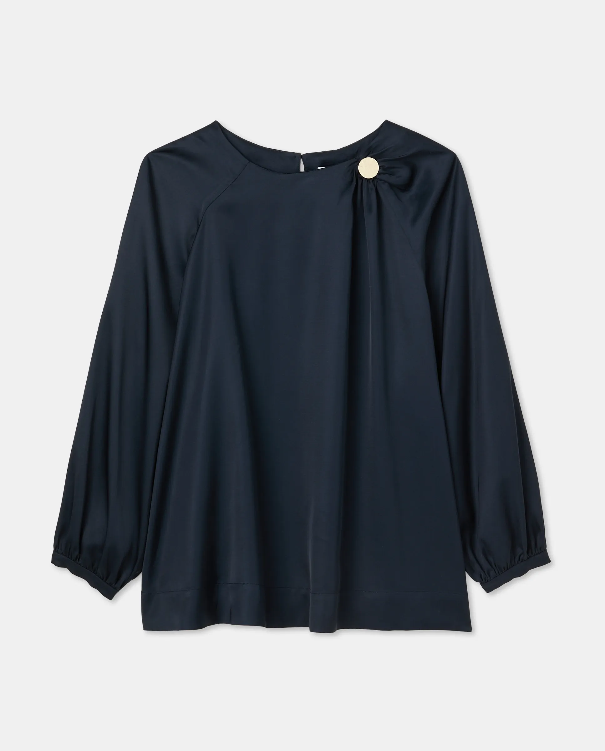 Блузка с длинными рукавами из сатина без узора с деталью в виде пуговицы.