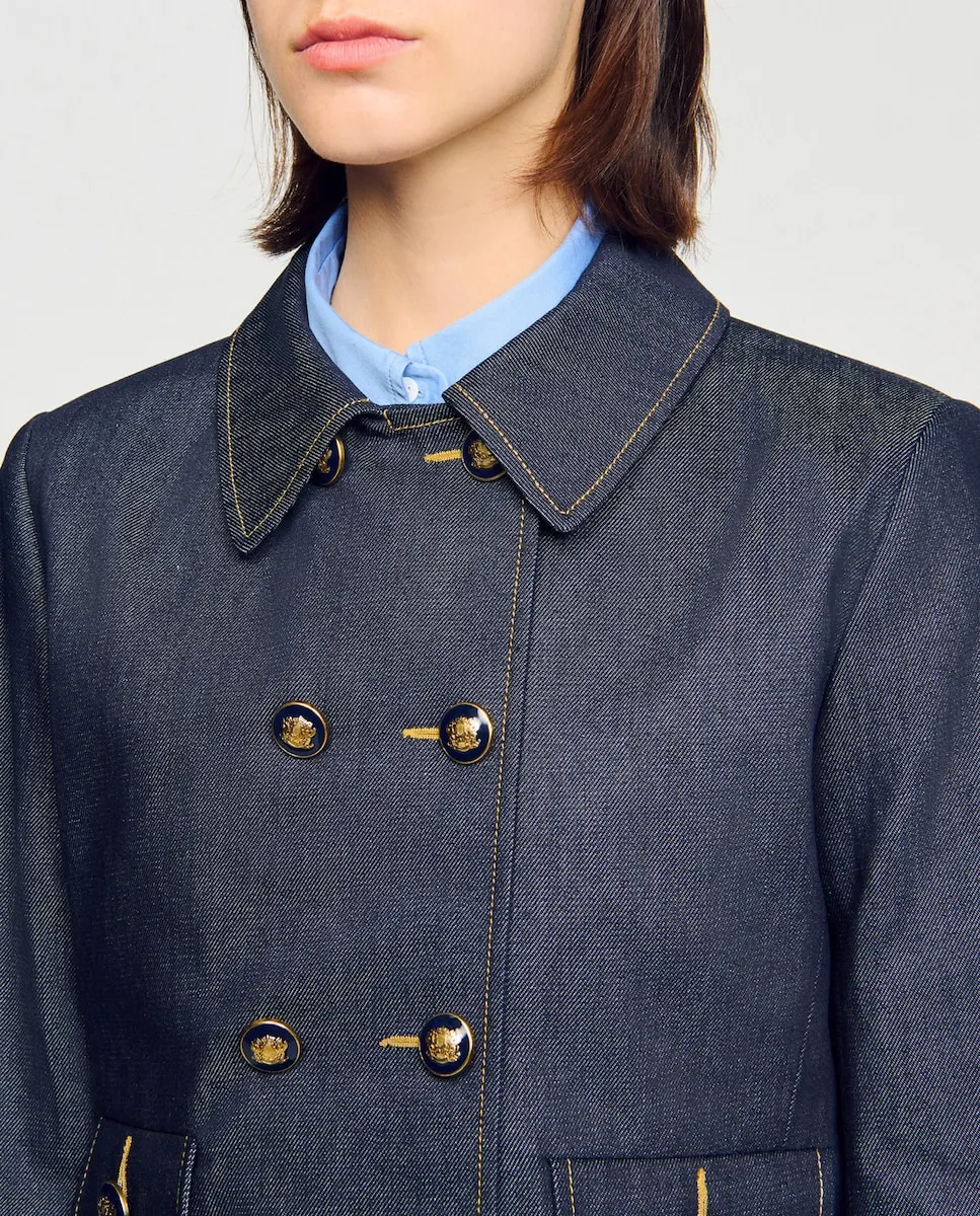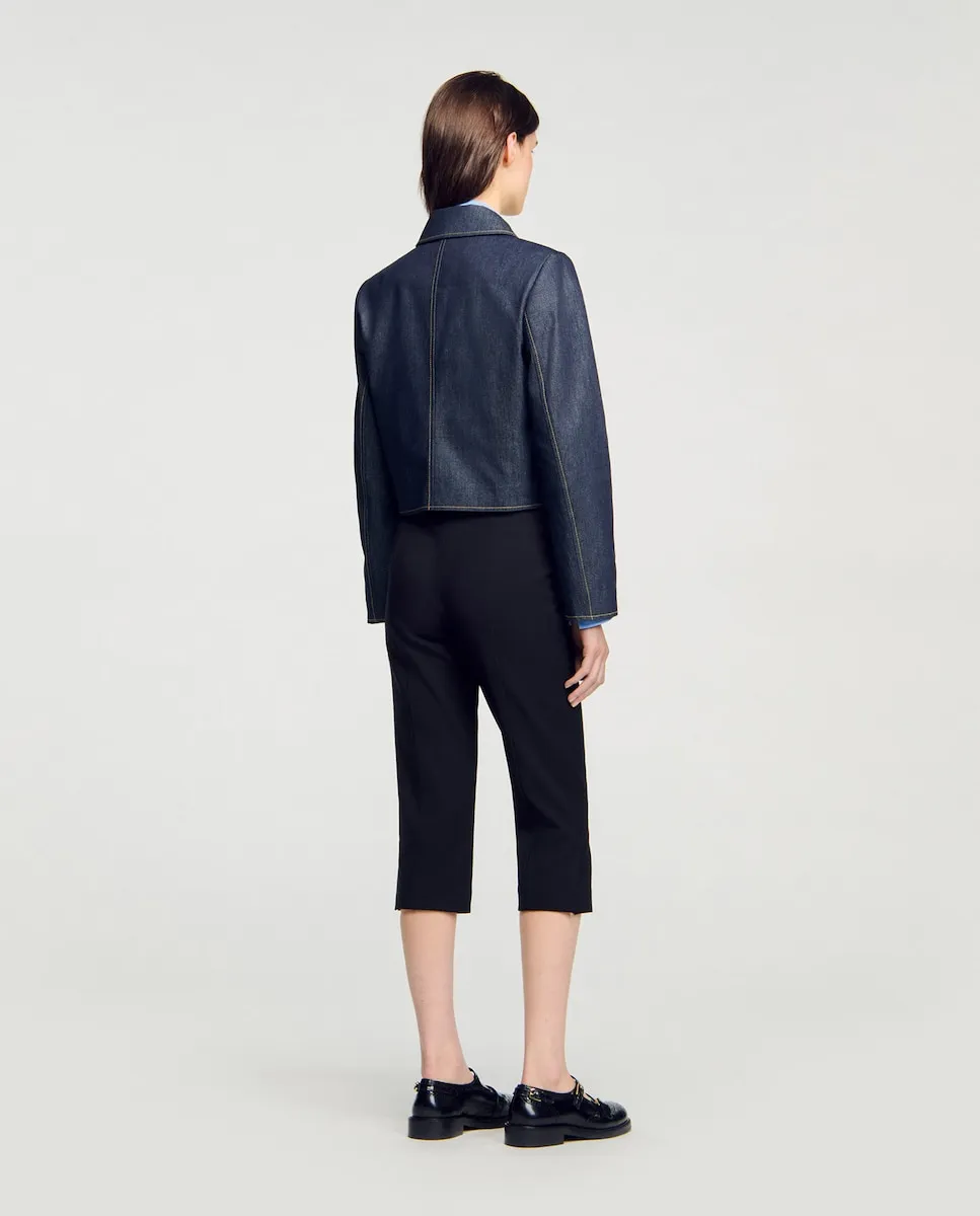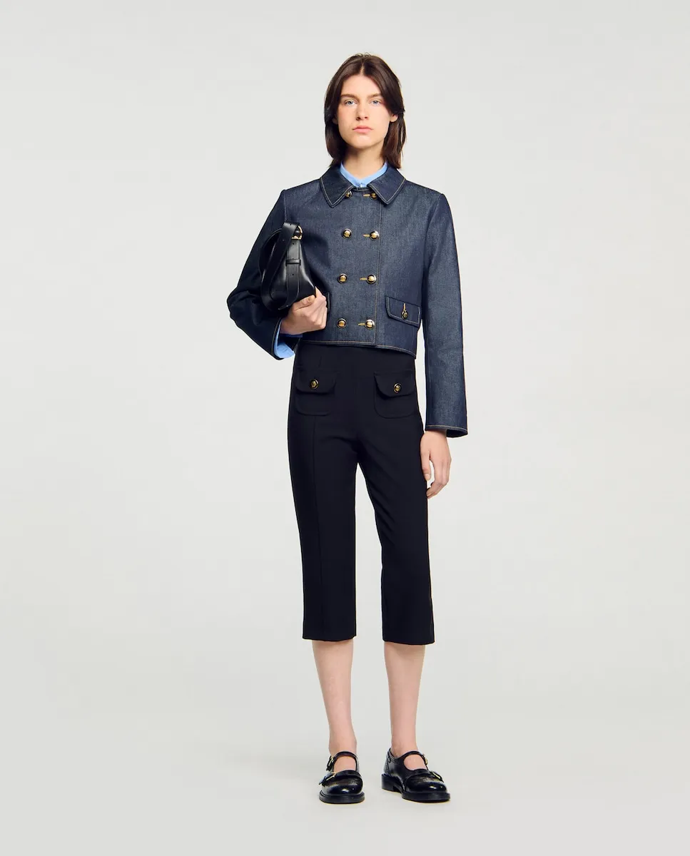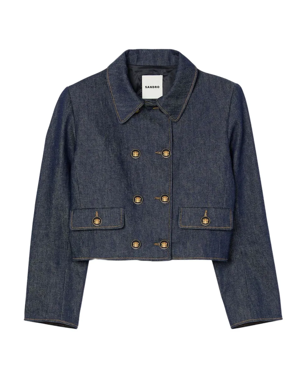 Короткая куртка из необработанного денима с отделочными швами, с отложным воротником, длинным рукавом и застежкой на двойную пуговицу с декоративными пуговицами. Короткая куртка из денима Sandro для женщин. Отложной воротник. Длительный рукав. Двойная пуговица. Карманы с клапанами и отделочными швами.