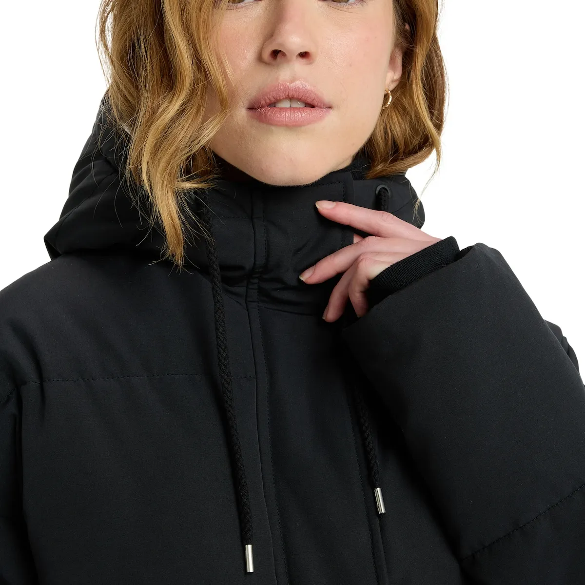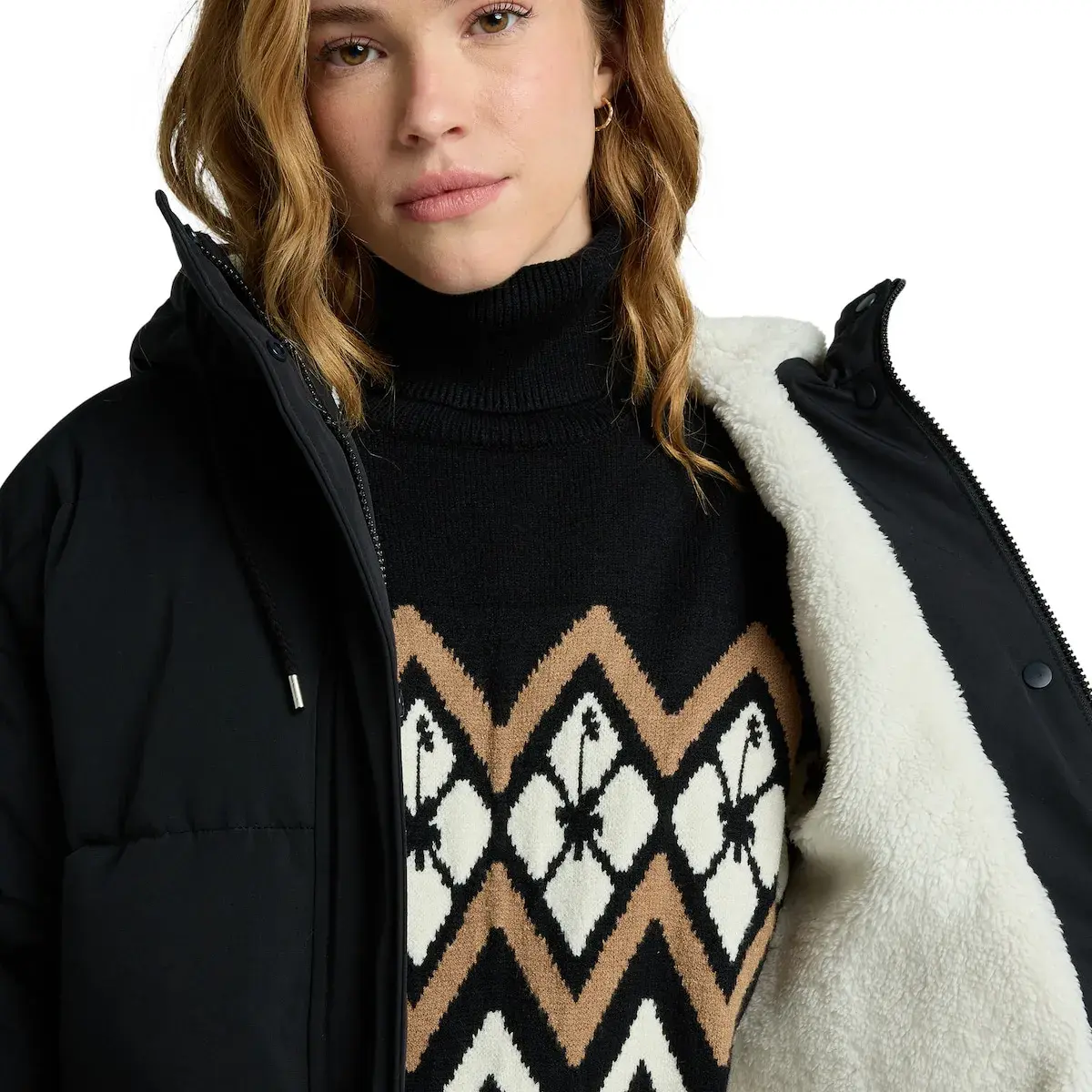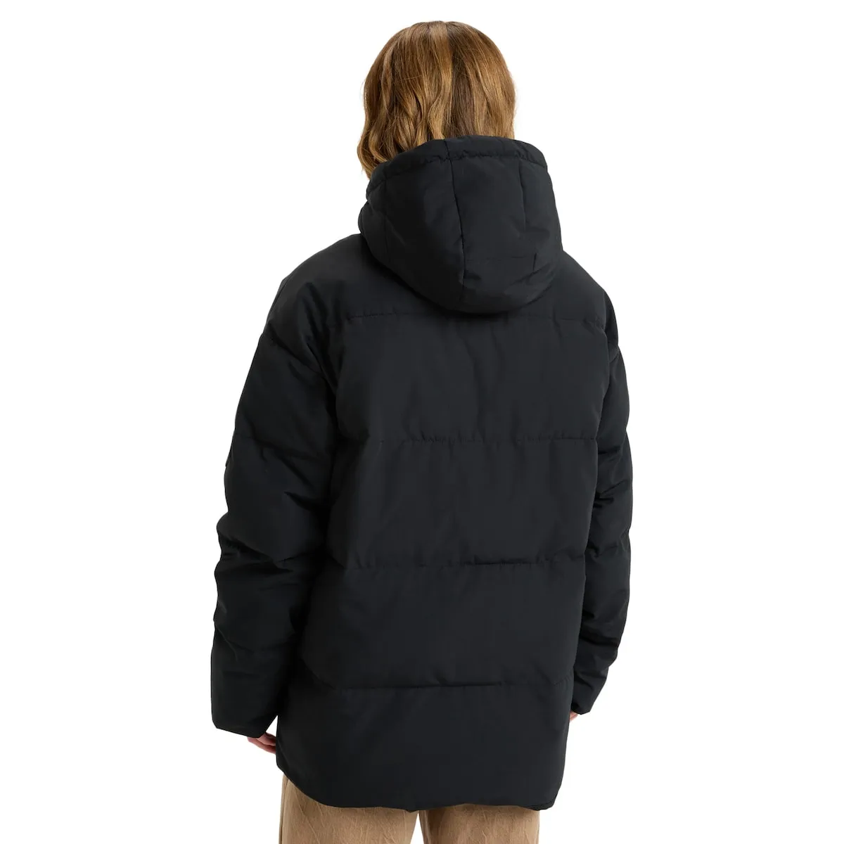 Пуховик с капюшоном для женщин. Характеристики включают: Ткань: внешний полиэстер с подкладкой из шепа полиэстера, Крой: свободный крой по всему телу, Капюшон: подкладка и утепление из шепа, Внутренняя ткань: полная подкладка и утеплитель, тело из шепа, карман с внутренней микрофлисовой отделкой, Карманы: накладные карманы спереди с двойным входом, с боку и под клапаном, Застежка: фронтальная молния с защитным клапаном для простого дизайна, Капюшон с эластичным шнурком и силиконовая нашивка Roxy.