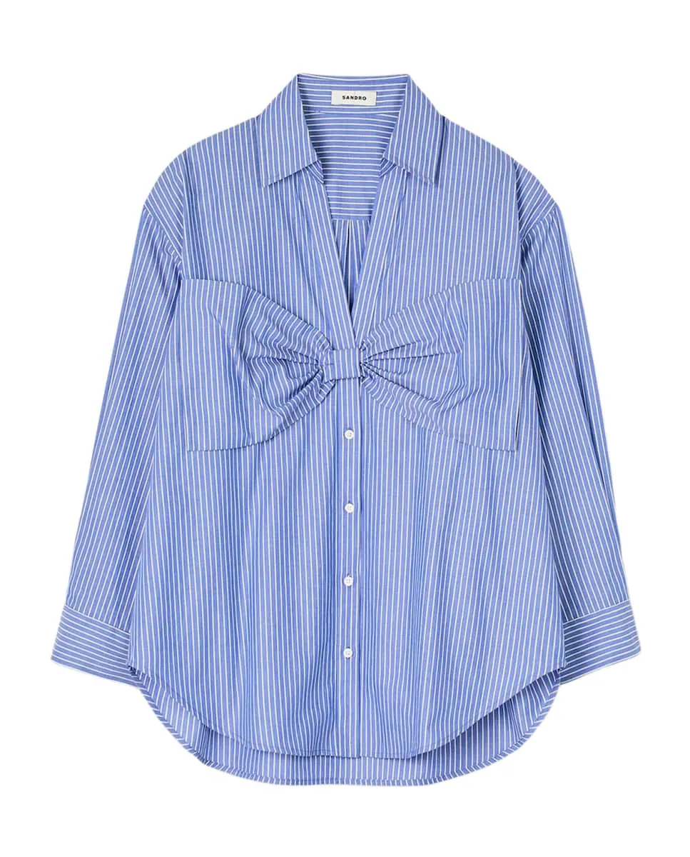 Рубашка оверсайз в полоску с V-образным вырезом и воротником, длинными рукавами с пуговицами на манжетах и большим плиссированным бантом спереди. Рубашка оверсайз в полоску Sandro для женщин. V-образный вырез с воротником. Длинные рукава с пуговицами на манжетах. Плиссированный бант спереди. Ассиметричный округлый подол.