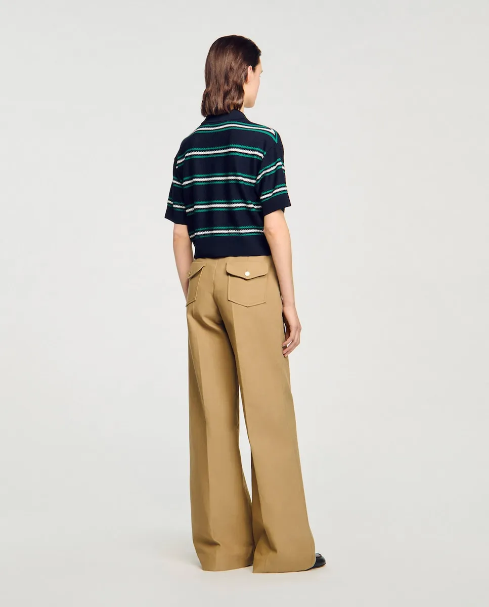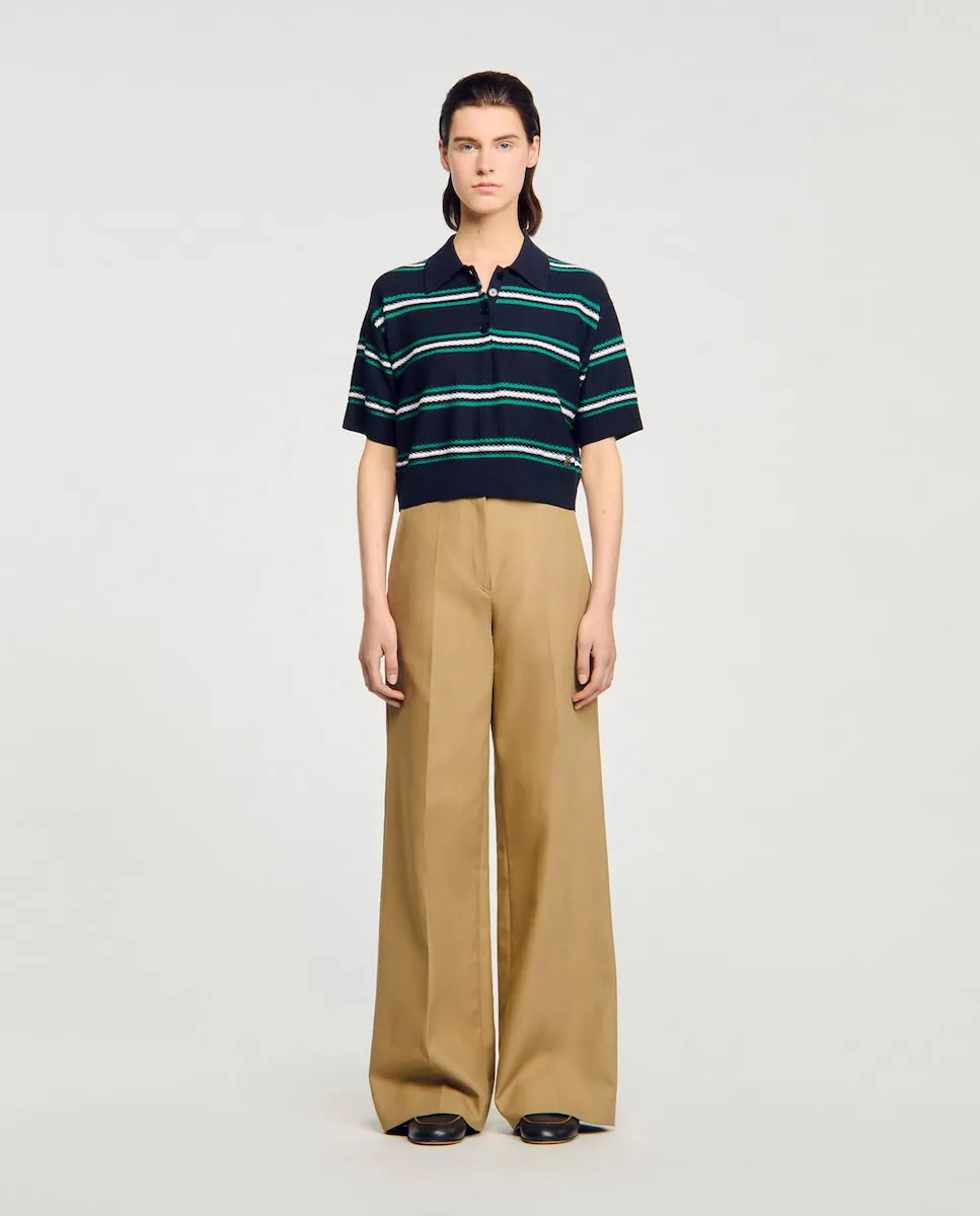 Короткий пуловер из тонкой вязки в полоску с пуговичным воротником и короткими рукавами. Короткий пуловер Sandro для женщин. Пуговичный воротник. Полоски. Короткие рукава. Широкий крой.
