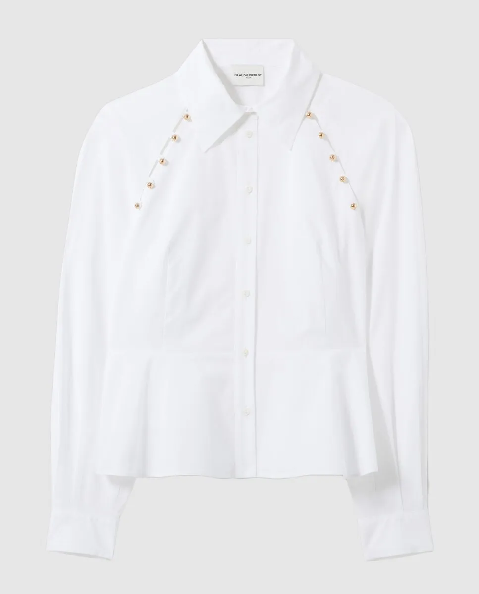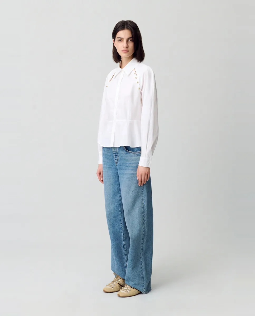 Наше исследование вдохновлено движением Yuppie (молодые городские профессионалы), которое стало символом офисной одежды Нью-Йорка 80-х годов. Эта исторически мужская одежда полностью переосмыслена в женской версии. Пастельные цвета - персиковый или небесно-голубой - и игривые детали, такие как драгоценная пуговица, формируют силуэт, который сочетает формальные коды с непринужденным духом. Рубашка из хлопка с длинными рукавами реглан с деталями из золотых пуговиц CP. Рубашка из хлопка с длинными рукавами реглан. Воротник рубашки. Фигурация в талии. Расклешенный низ рубашки. Крой на уровне плеч. Классическая петля спереди с 6 пуговицами в тон. 5 золотых полусферических пуговиц CP с каждой стороны. Пуговицы на манжетах.