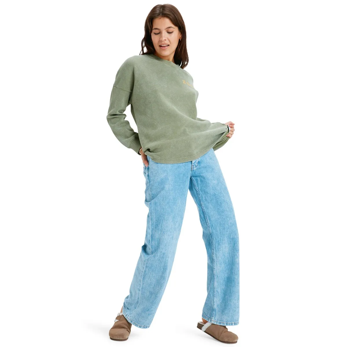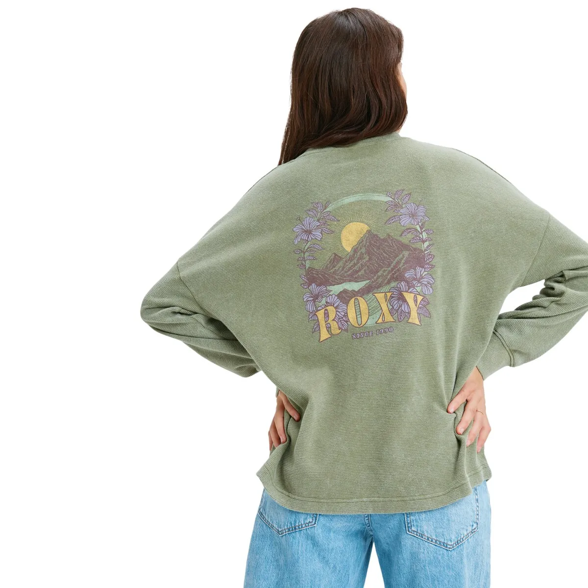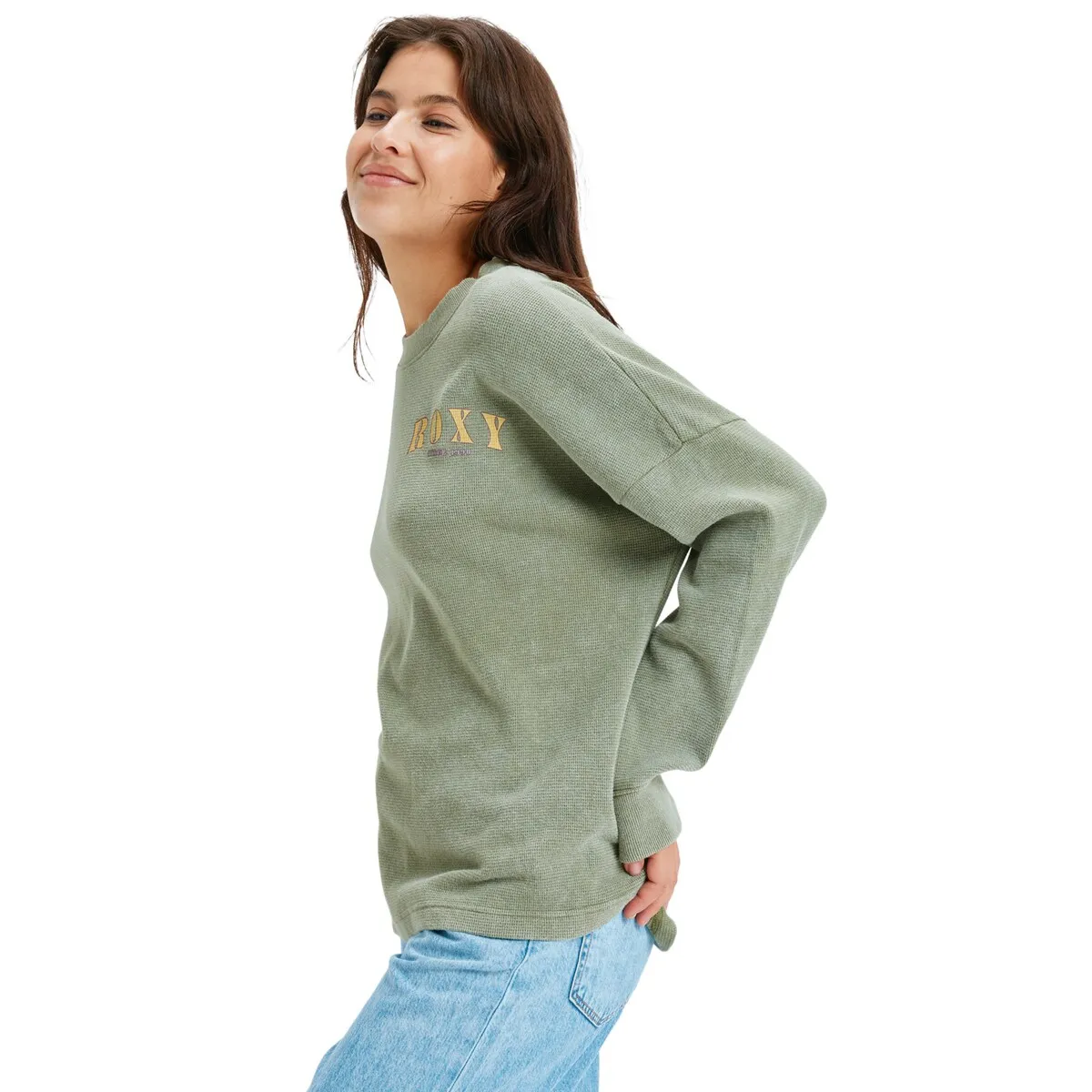 Футболка с винтажной стиркой для женщин. Особенности включают: Ткань: рифленый хлопковый материал, Крой: прямой и свободный крой, Воротник: круглый воротник из ребристого материала и специальные художественные детали Roxy спереди и на рукаве.