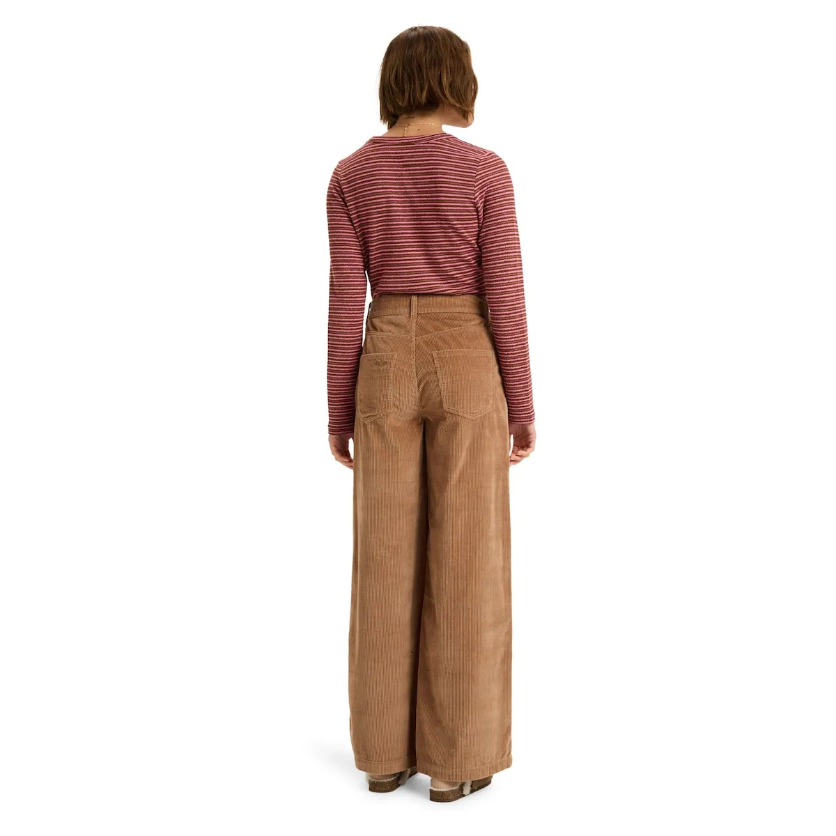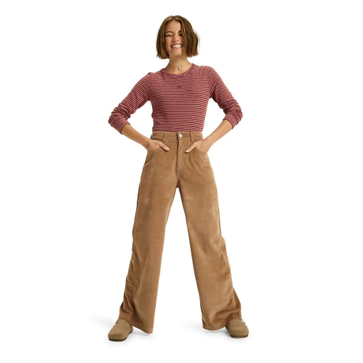 Широкие брюки для женщин. Характеристики: Ткань: крупноплотный вельвет из хлопка и эластана, Крой: длинные и широкие ноги, Пояс: высокая талия, Закрытие: застежка-молния и классическая металлическая пуговица Roxy, Детали: металлические заклепки и пять карманов.