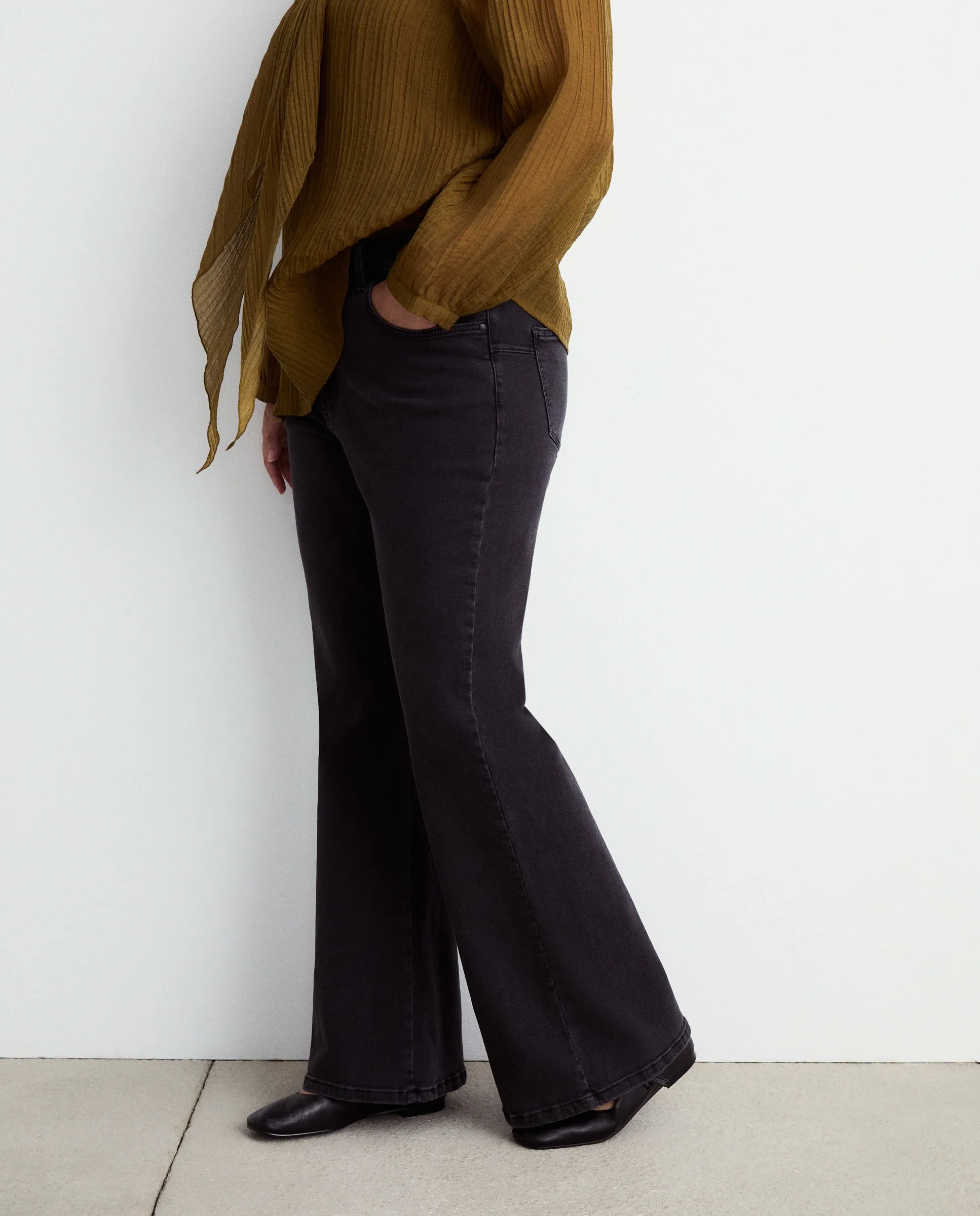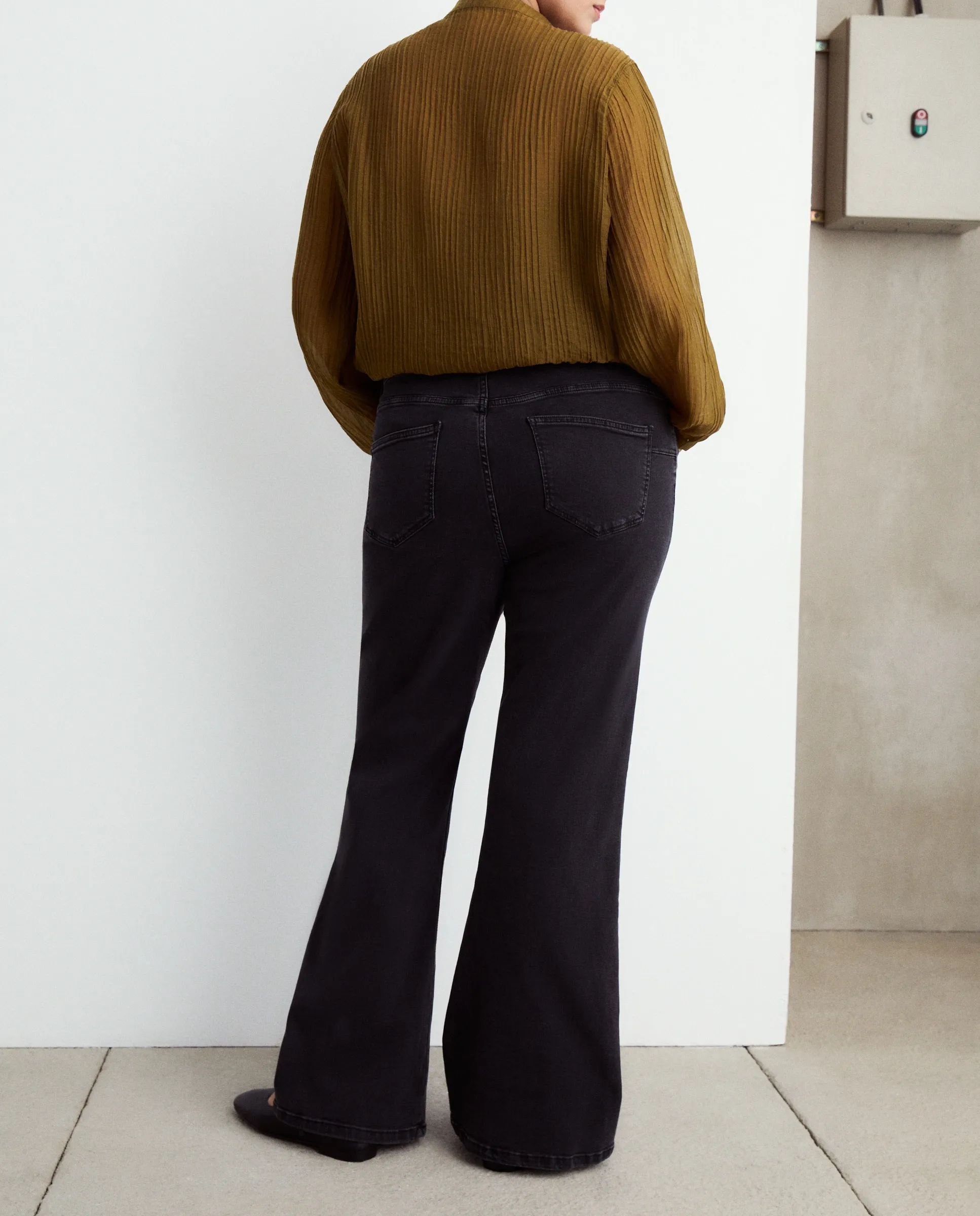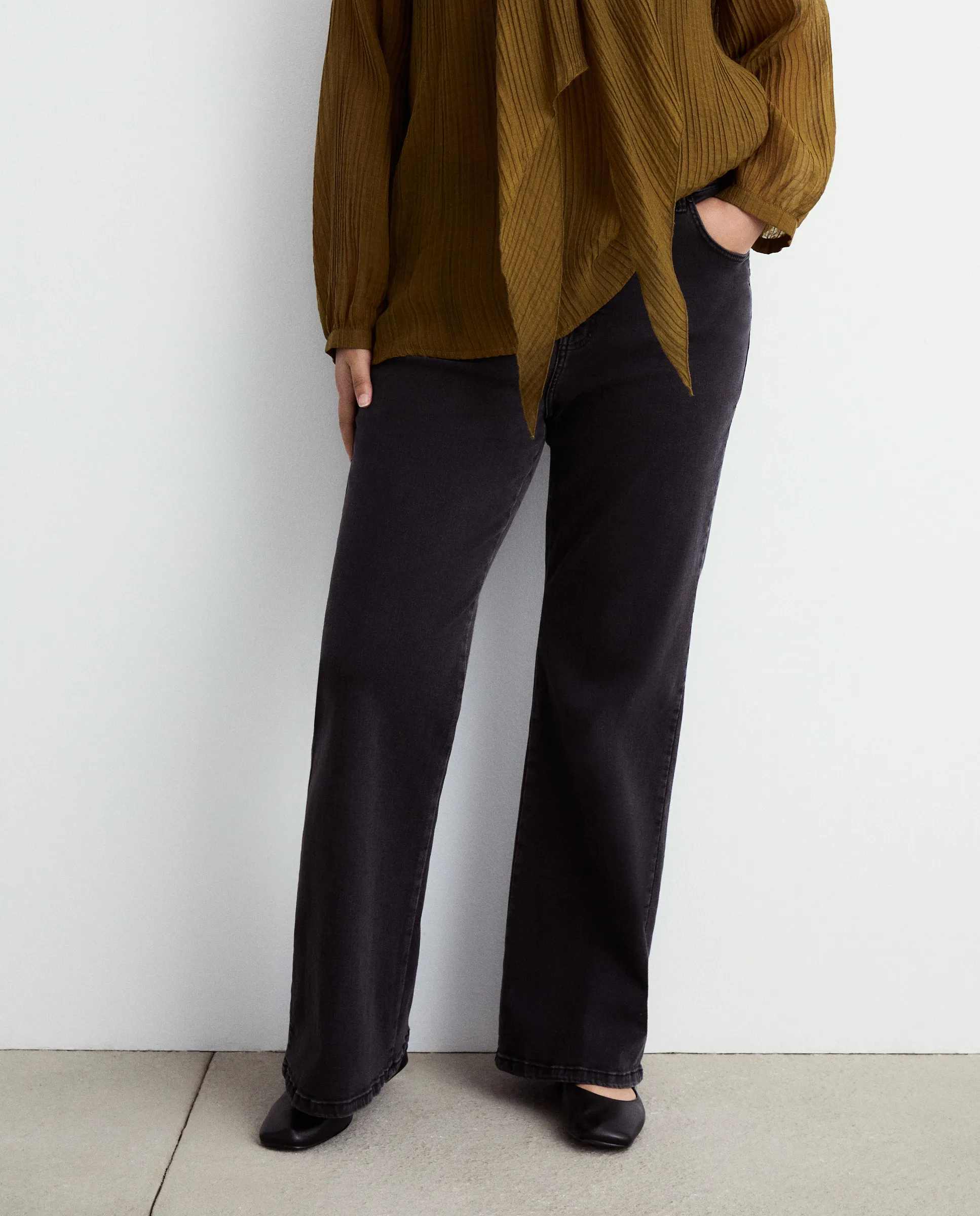 Однотонные джинсы с колокольчиками.