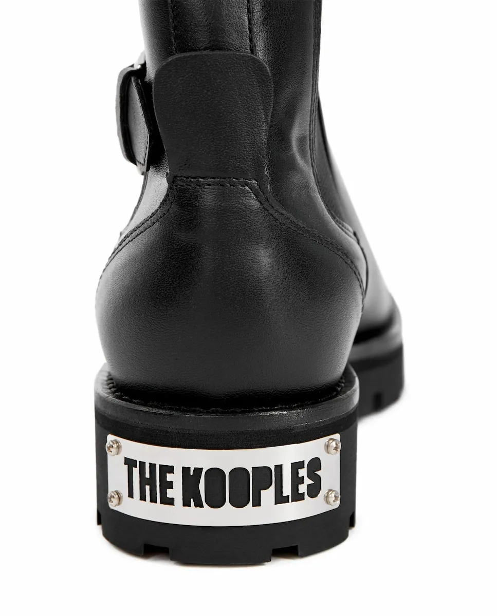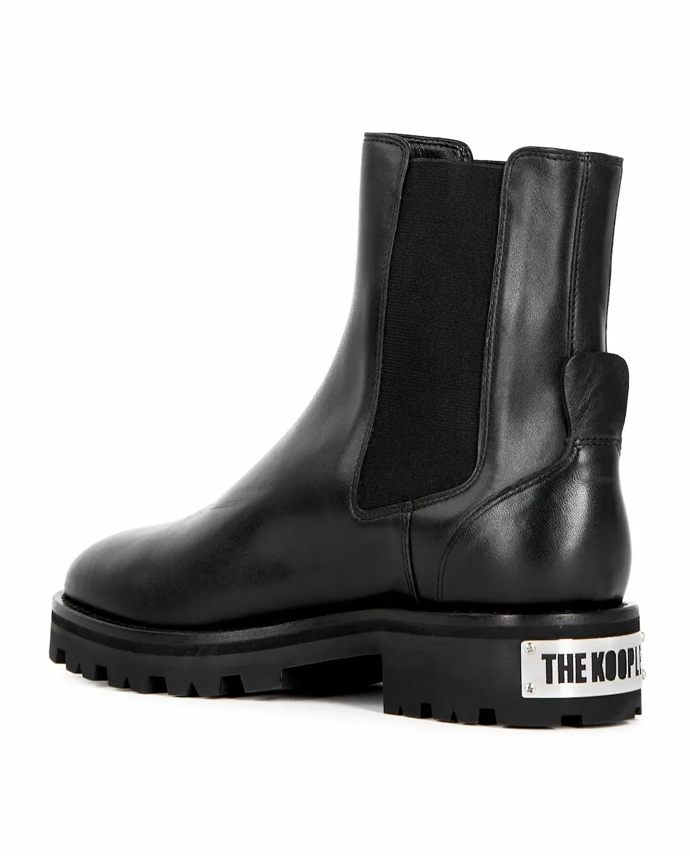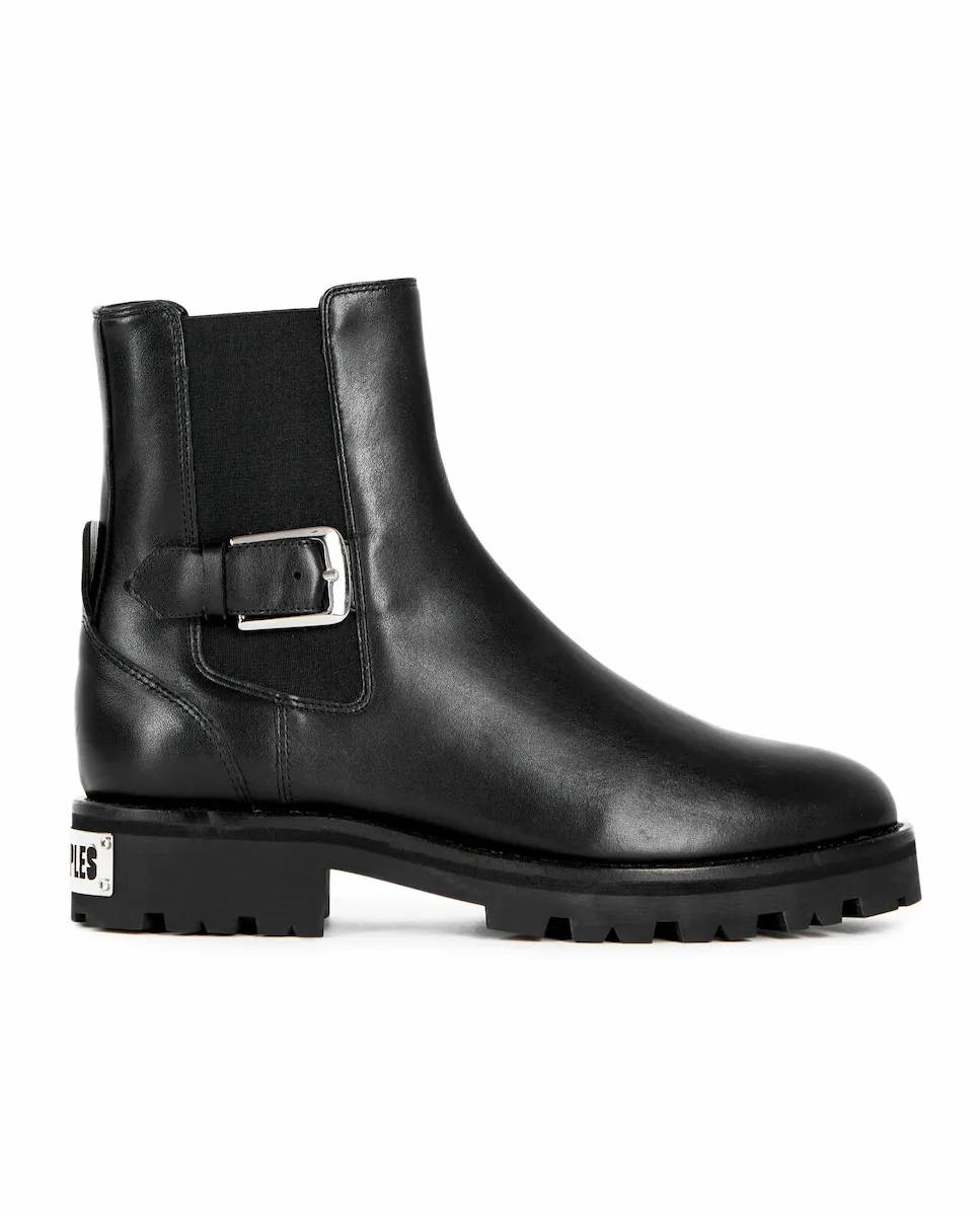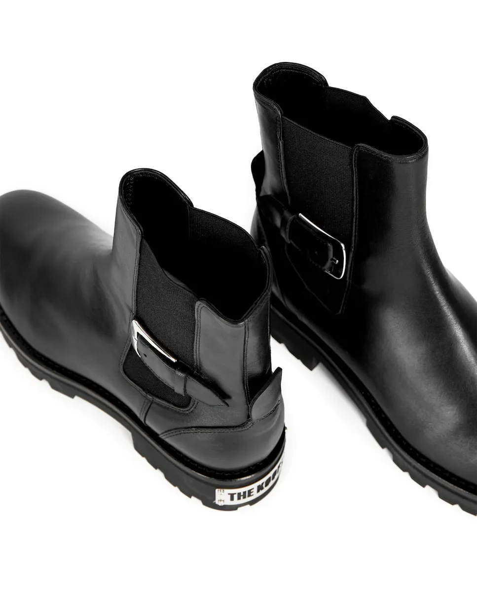 Ботинки из гладкой кожи с эластичными боковыми вставками и металлической серебристой пряжкой на щиколотке. Включают декоративную металлическую пластину на пятке и низкий каблук высотой 3 см.