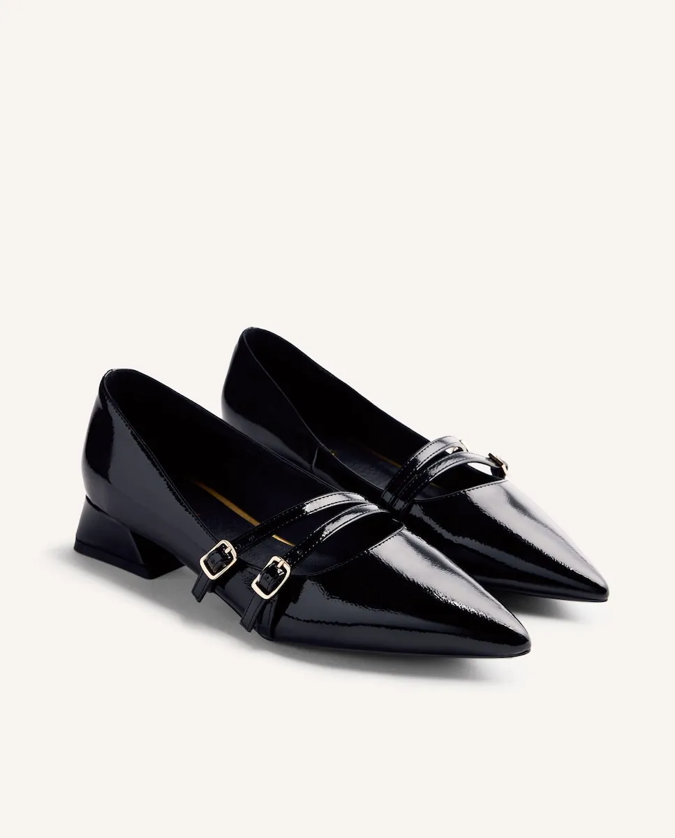 Туфли на каблуке в стиле salón с отделкой под лаковые туфли и ремешками. Острый носок. Обладают мягкой стелькой, низким блочным каблуком и регулируемыми застежками на подъеме. Высота каблука: 3 см. Верх, подкладка и стелька из полиуретана. Гибкая резиновая подошва.