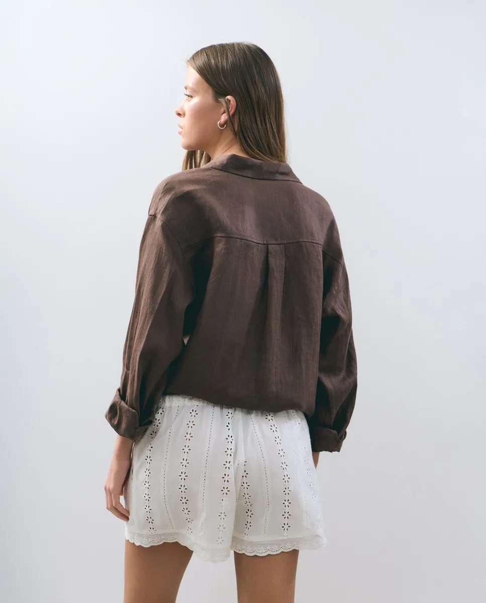 Короткие с вышивкой и резинкой на талии.