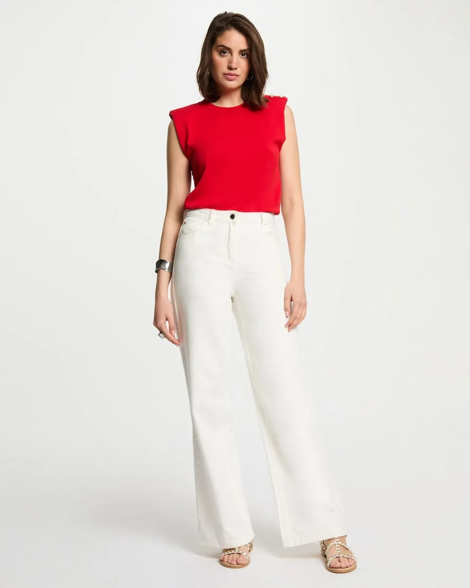 Майка без рукавов. Прямой крой. Круглый вырез. Без рукавов. Патронные плечи. Тонкая ткань. Декоративные пуговицы на плече.