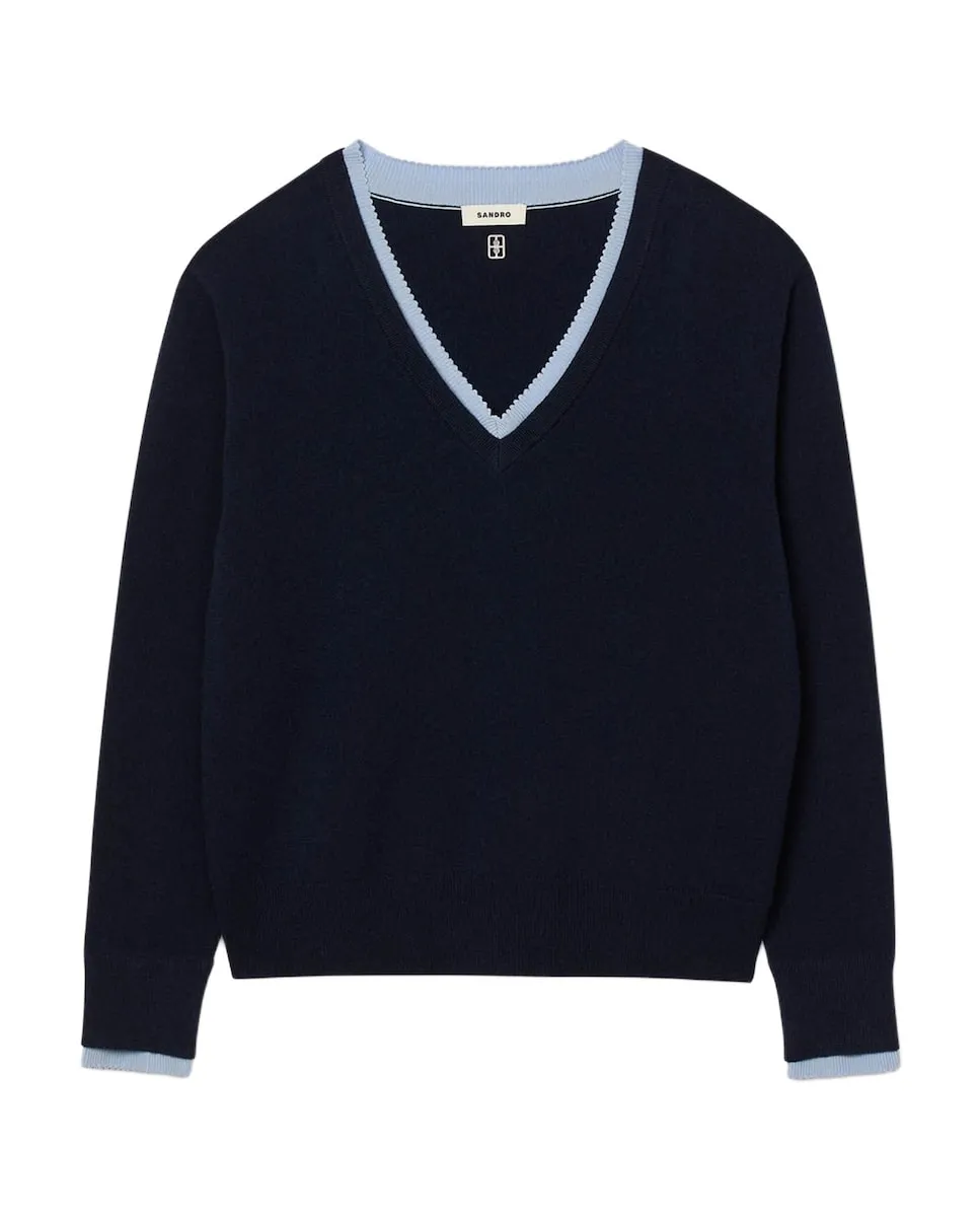Тонкий вязаный джемпер с V-образным вырезом, длинными рукавами и контрастной отделкой горловины. Джемпер из шерсти и кашемира от Sandro для женщин. Свободный крой. Длинные рукава. V-образный вырез с контрастной каймой. Рифлёные манжеты.