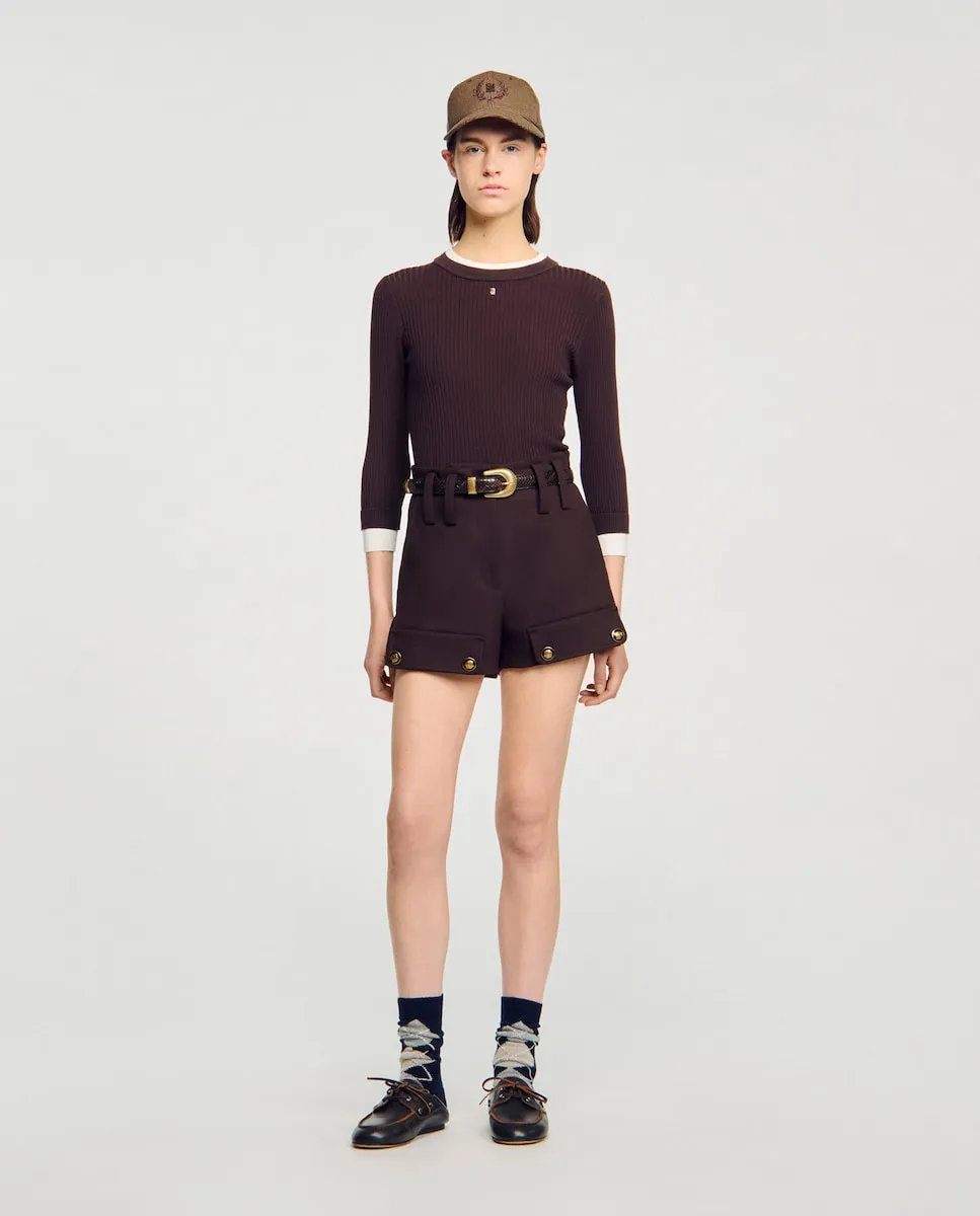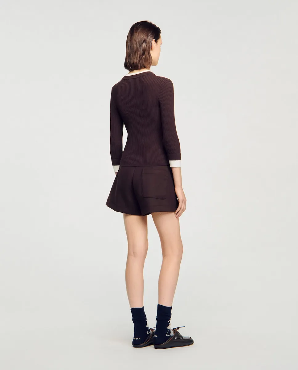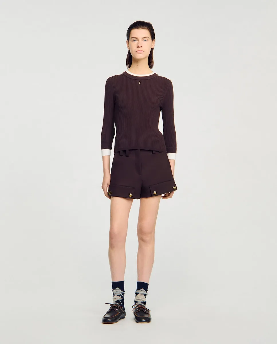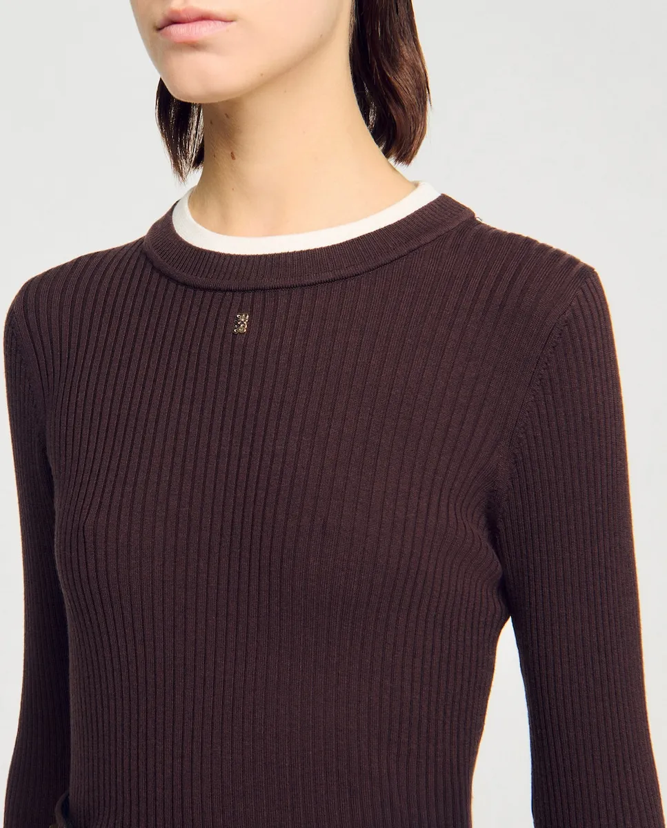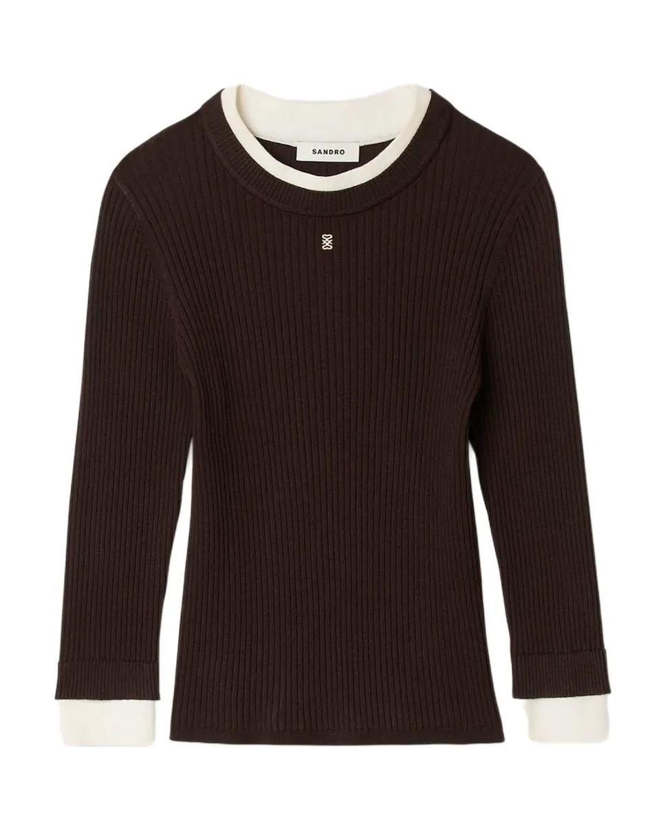 Джемпер 2 в 1 из ребристого трикотажа с округлым вырезом и длинными рукавами с контрастными отделками в стиле обманки, украшенный фирменной деталью. Джемпер из тонкого трикотажа Sandro для женщин. Приталенный силуэт. Округлый вырез. Длинные рукава. Контрастный воротник и манжеты. Деталь SANDRO.