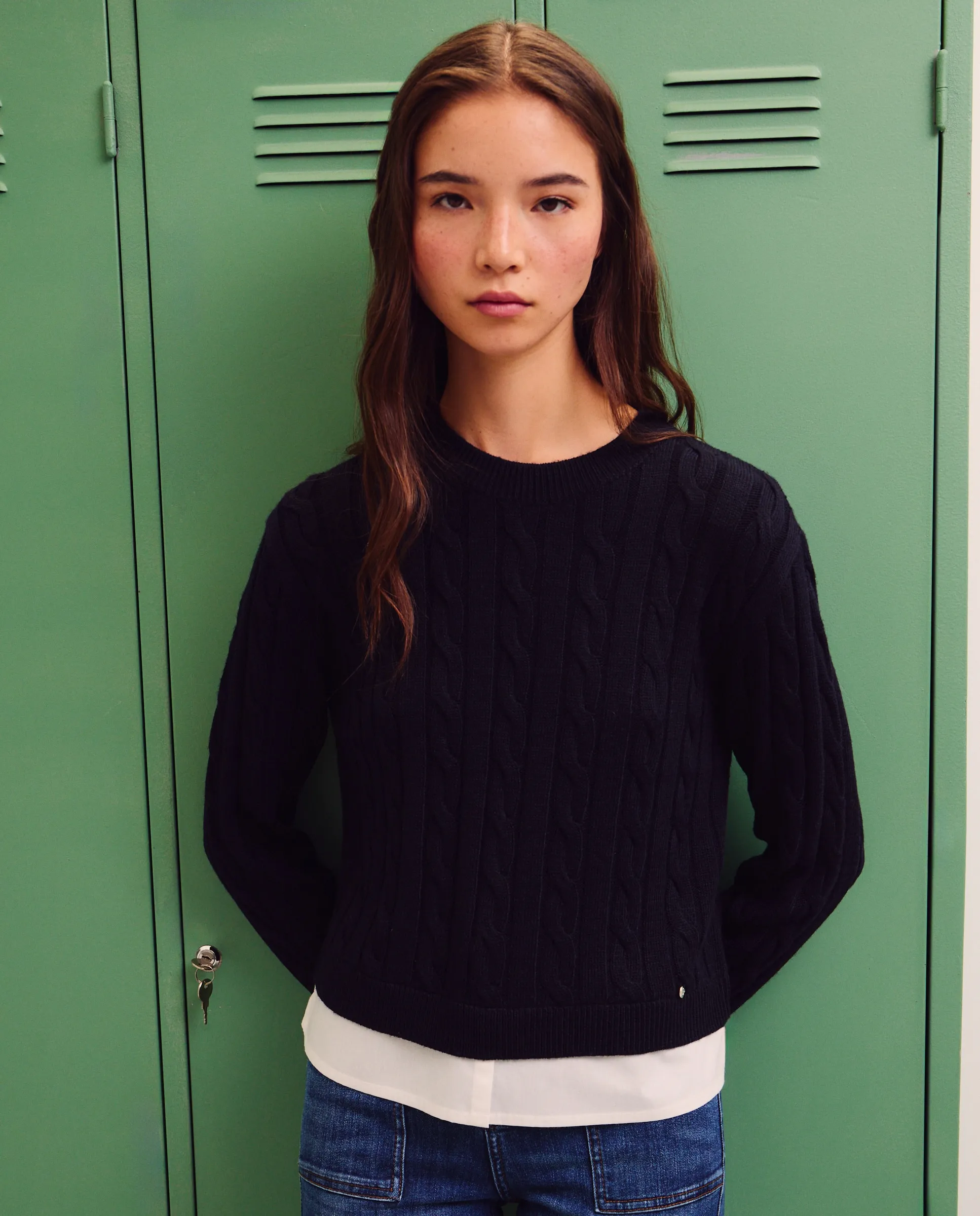 Джемпер с косами, круглым вырезом и длинным рукавом.